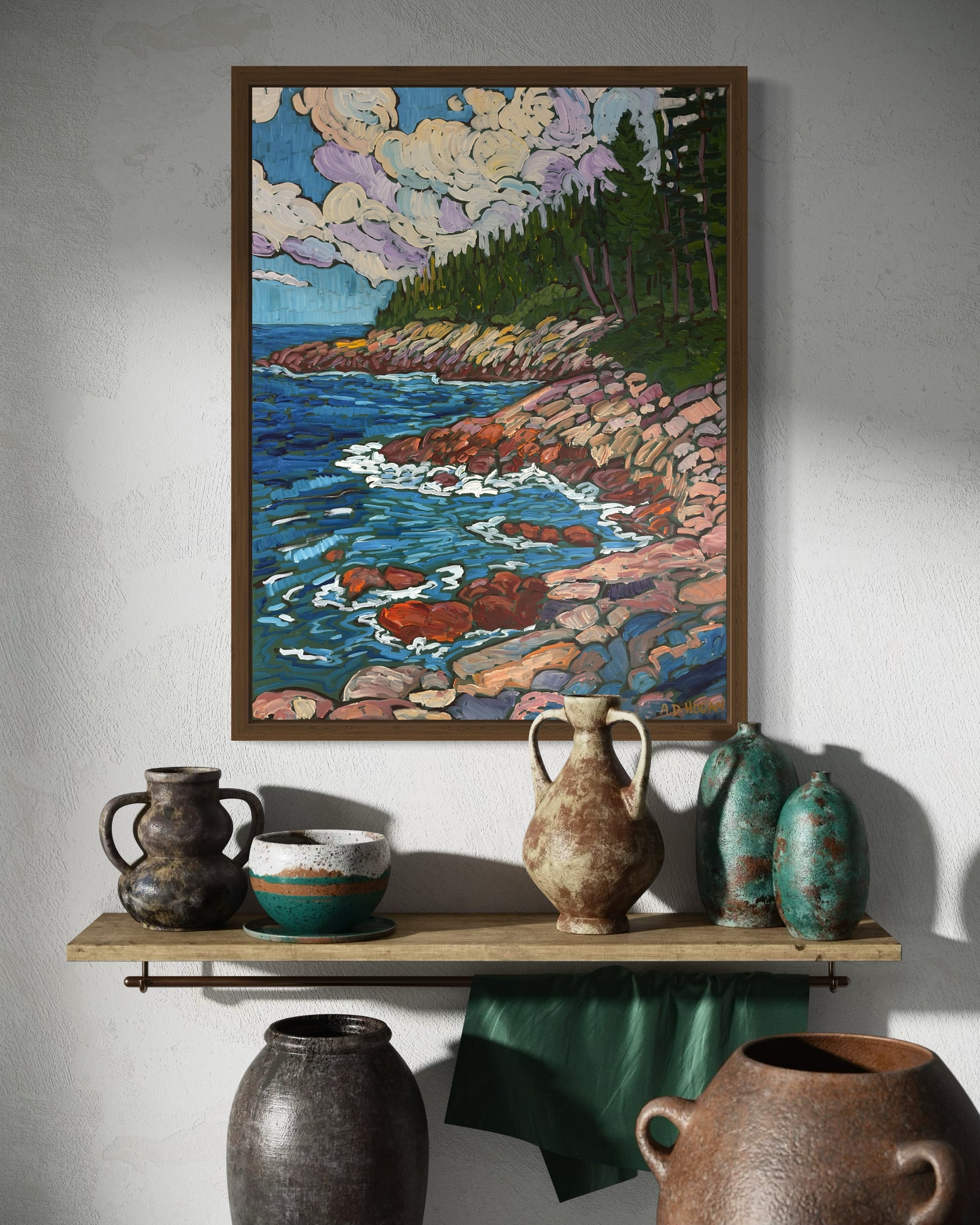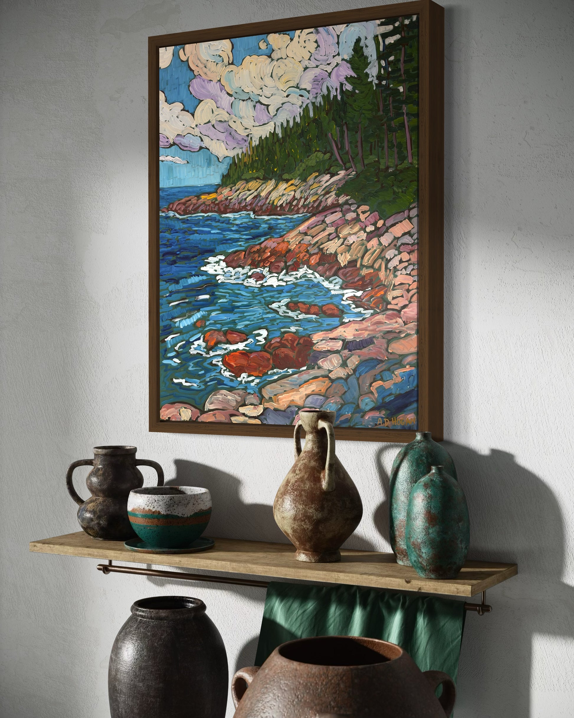 A striking tribute to the captivating shoreline of Acadia National Park, this artwork serves as a beautiful focal point for any space. Shipping is included for seamless delivery to your home.