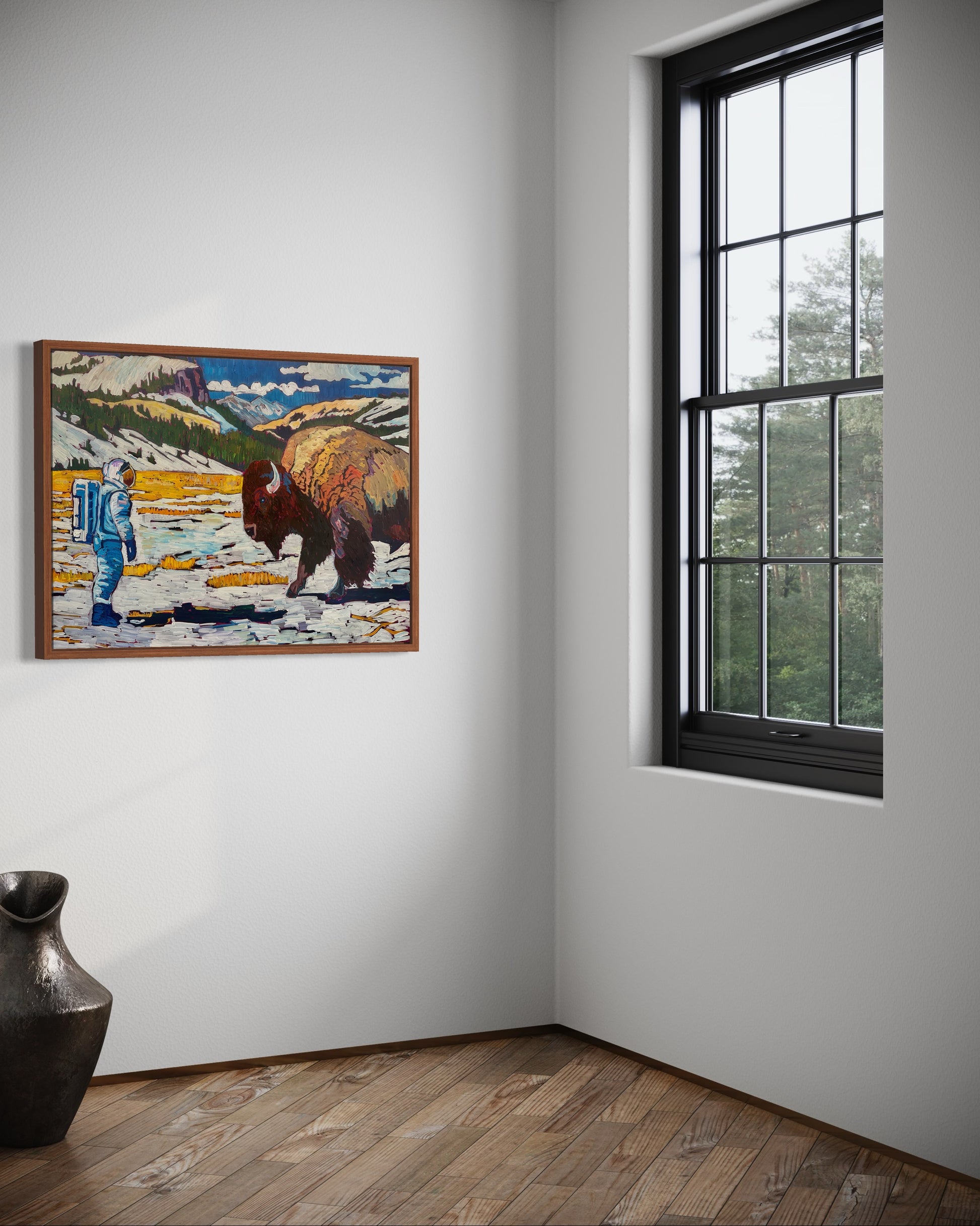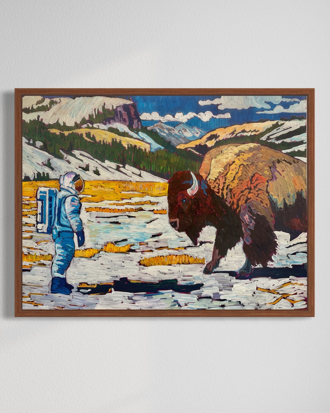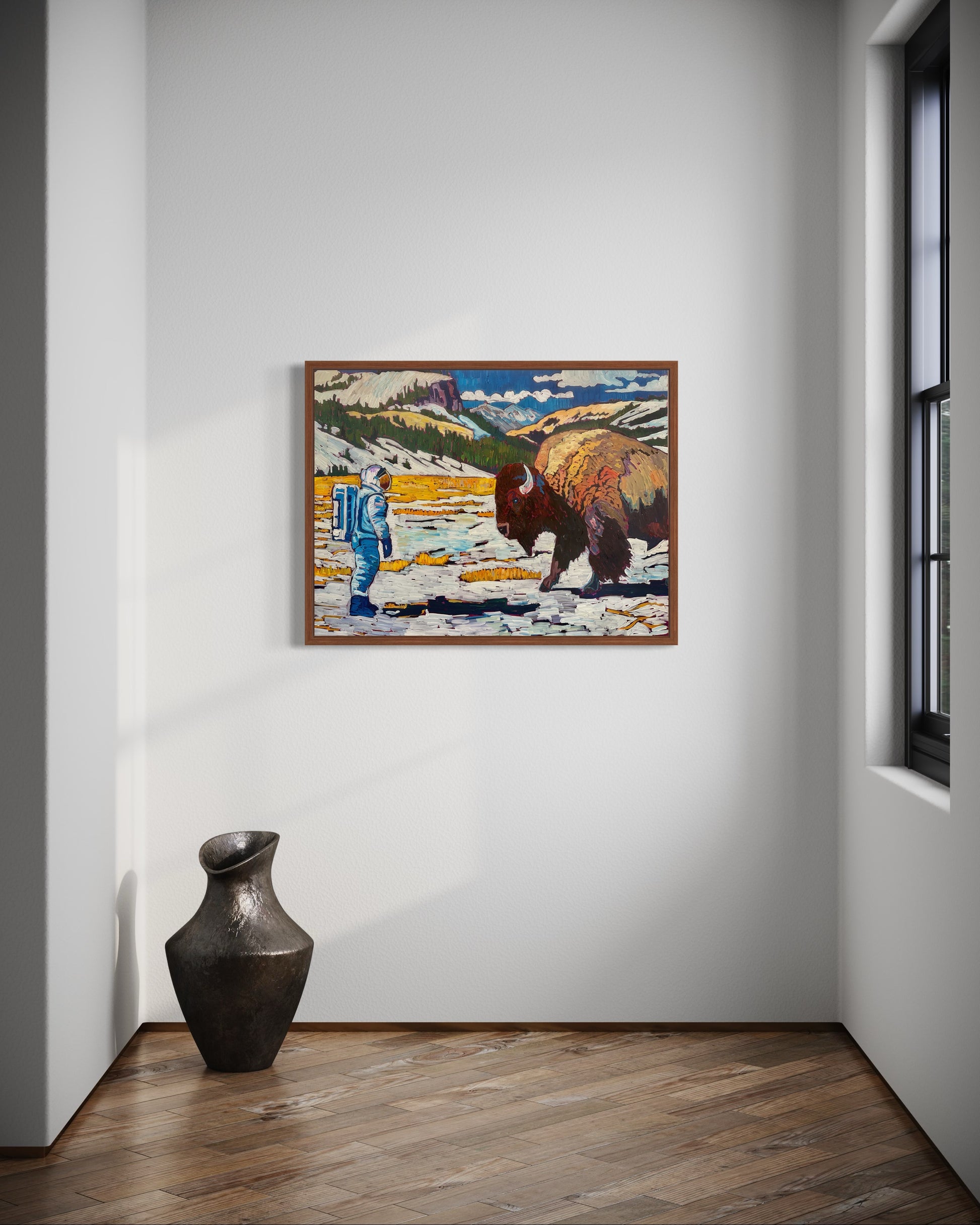 This captivating painting depicts an astronaut standing face to face with a large bison in a snowy field in Badlands National Park. The 30"x40" canvas brings to life the surreal encounter, with bold brushstrokes capturing the stark beauty and quiet intensity of the winter landscape.