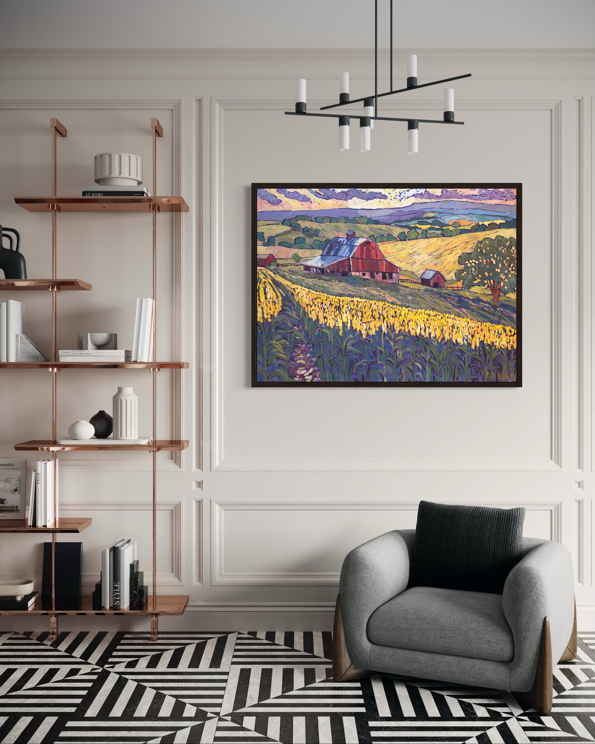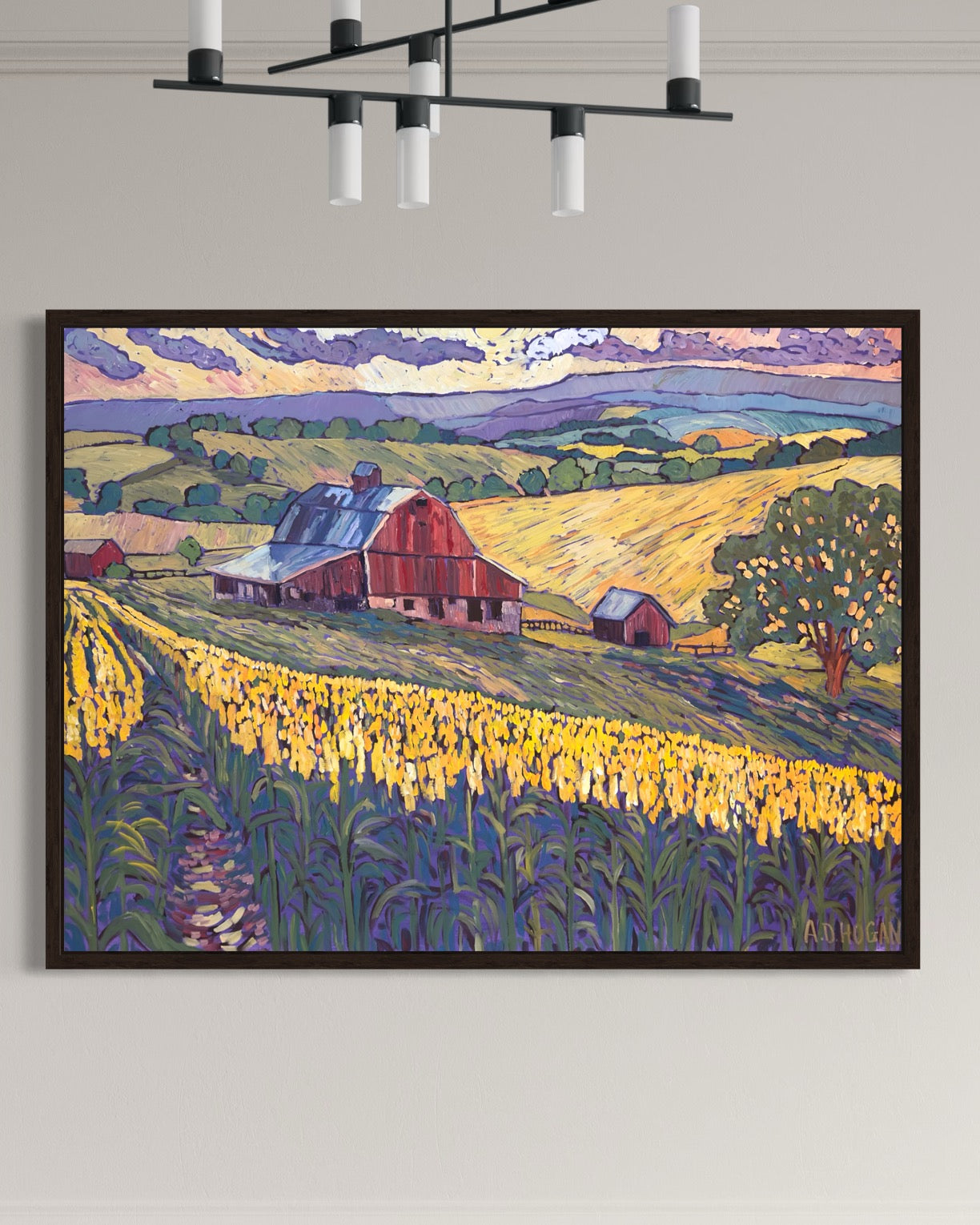 Amber Waves expands the vision of the heartland to a grander scale. Rolling fields stretch endlessly beneath a wide Midwestern sky, their golden rows alive with texture and movement. Each impasto stroke carries the rhythm of the land—the steady pulse of seasons, the dignity of labor, and the quiet beauty of abundance.