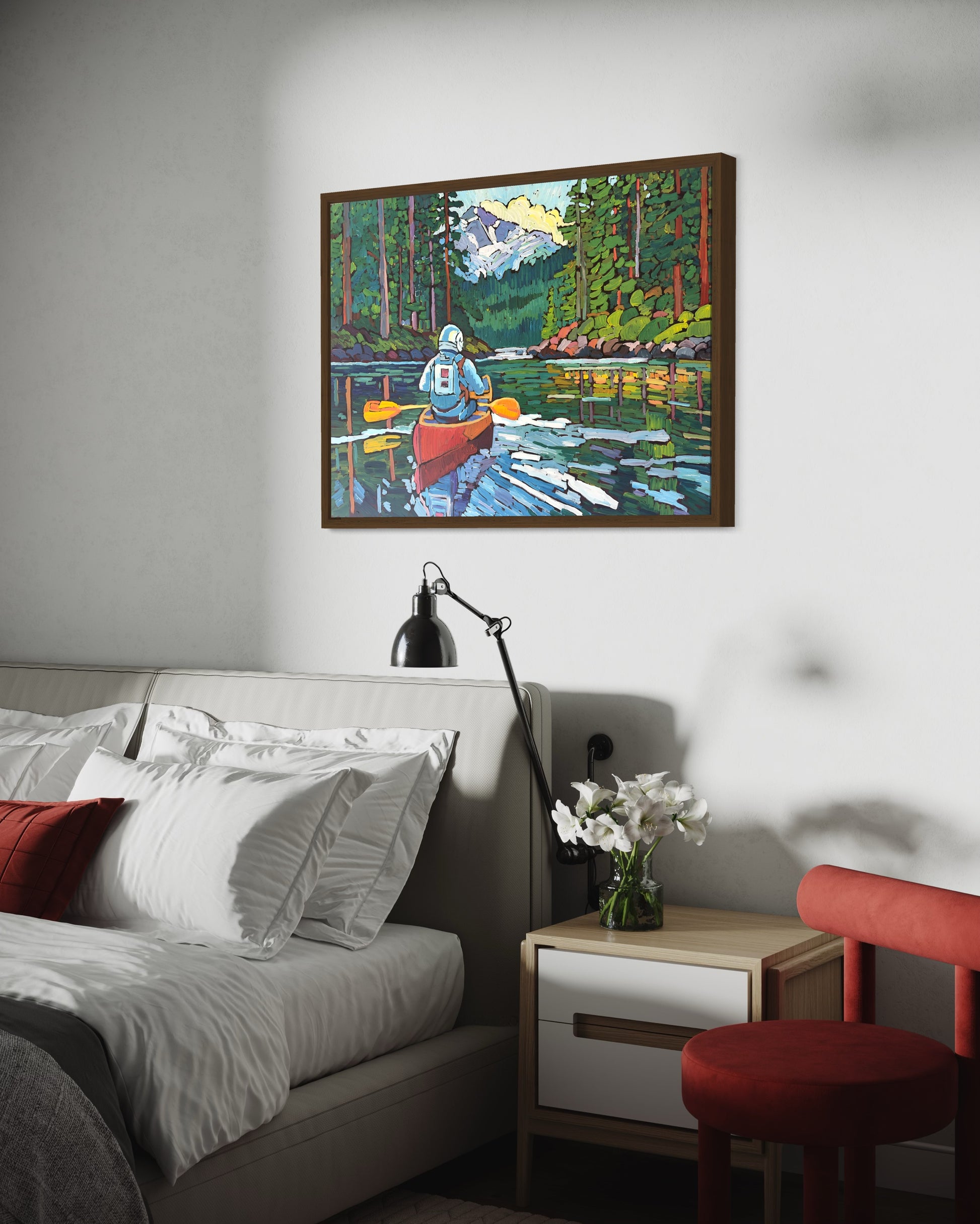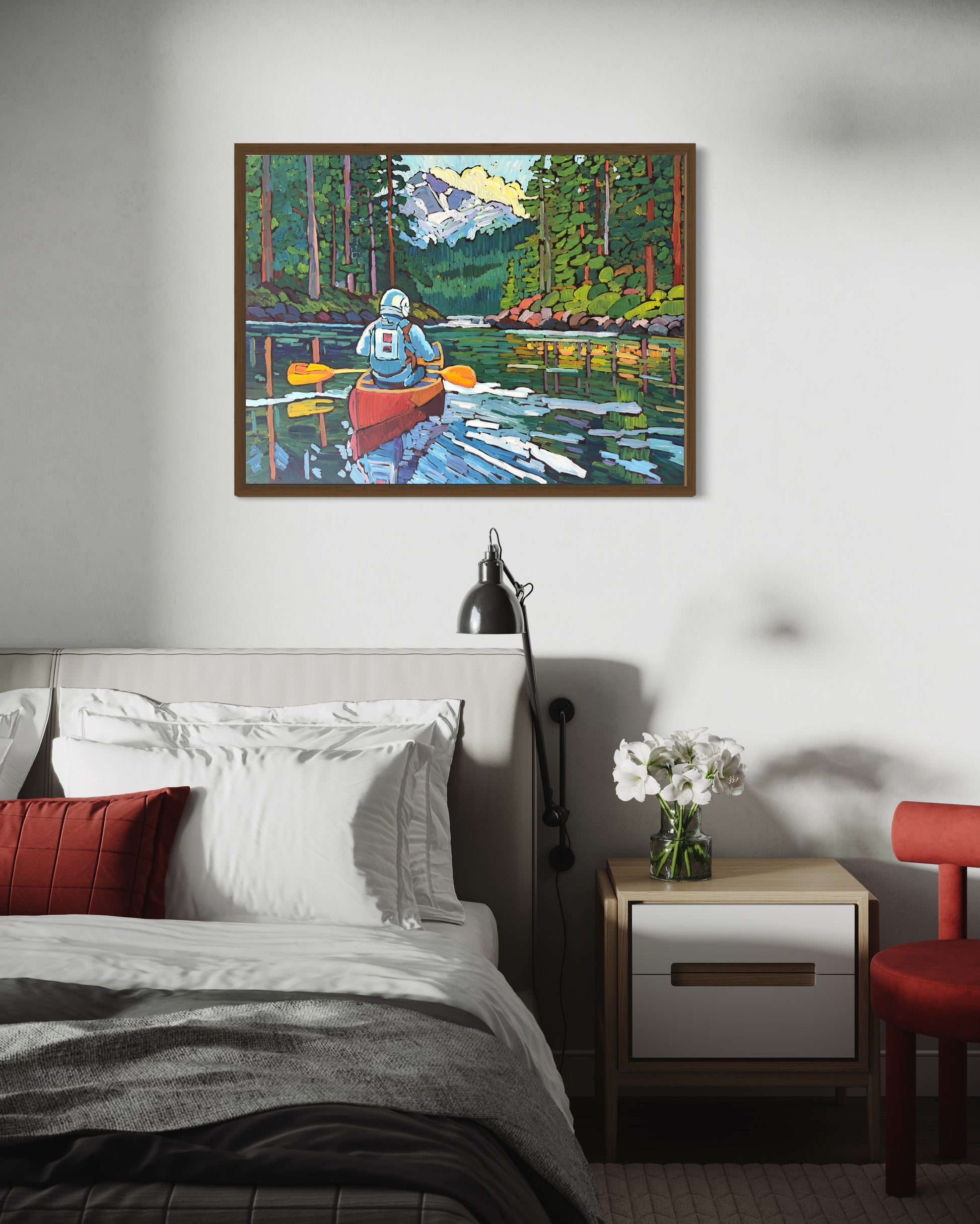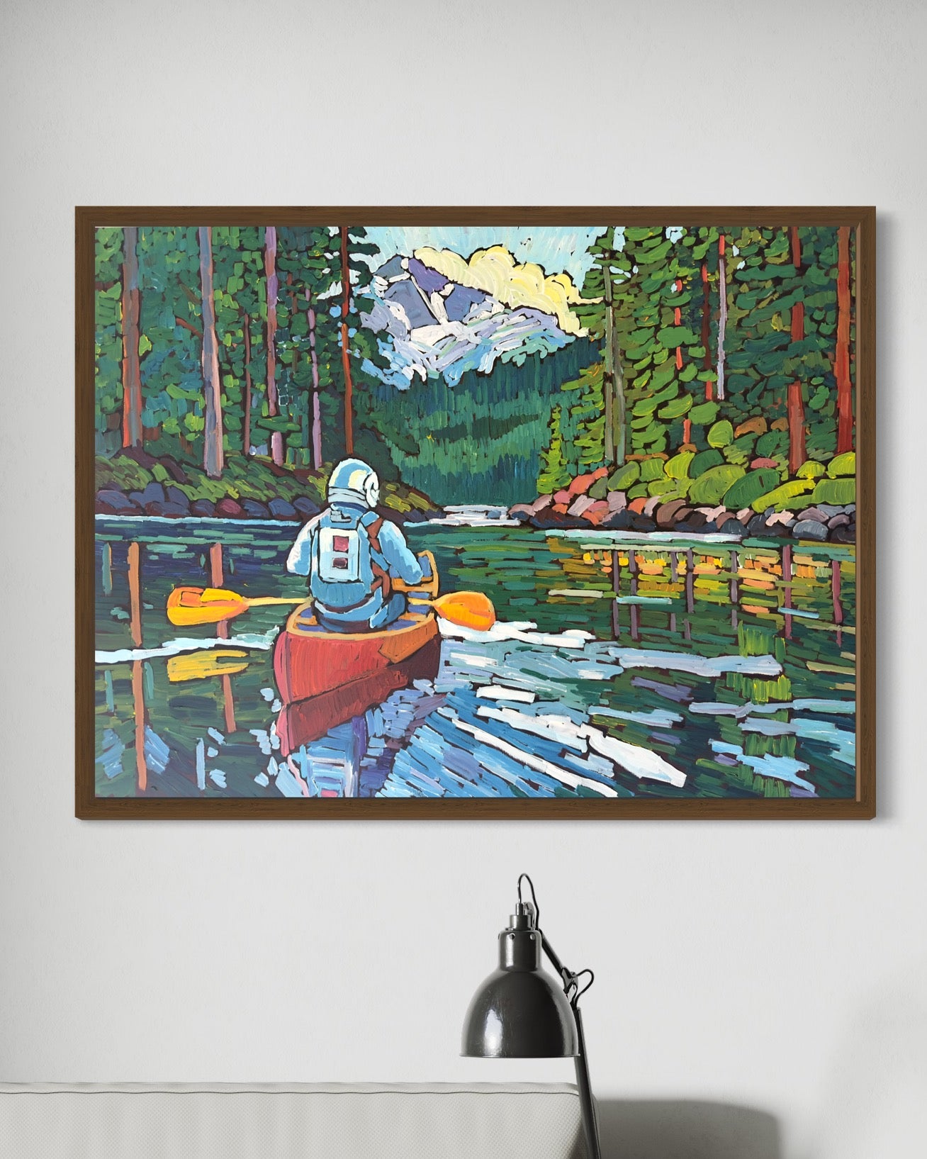 This captivating artwork portrays an astronaut's adventure amidst the tranquil beauty of Olympic National Park, navigating through still inlet waters with tree-lined shores and distant mountains looming majestically in the background. Executed in a dynamic impasto style on a 30x40" canvas, the painting captures the essence of exploration and wonder. Whether displayed as the focal point of a space or elegantly framed, this piece seamlessly blends the realms of space travel and earthly wilderness, evoking a sense of awe and serenity. Please note, the painting is unframed, and all original prices include shipping costs. Securely shipped and insured via UPS for peace of mind.