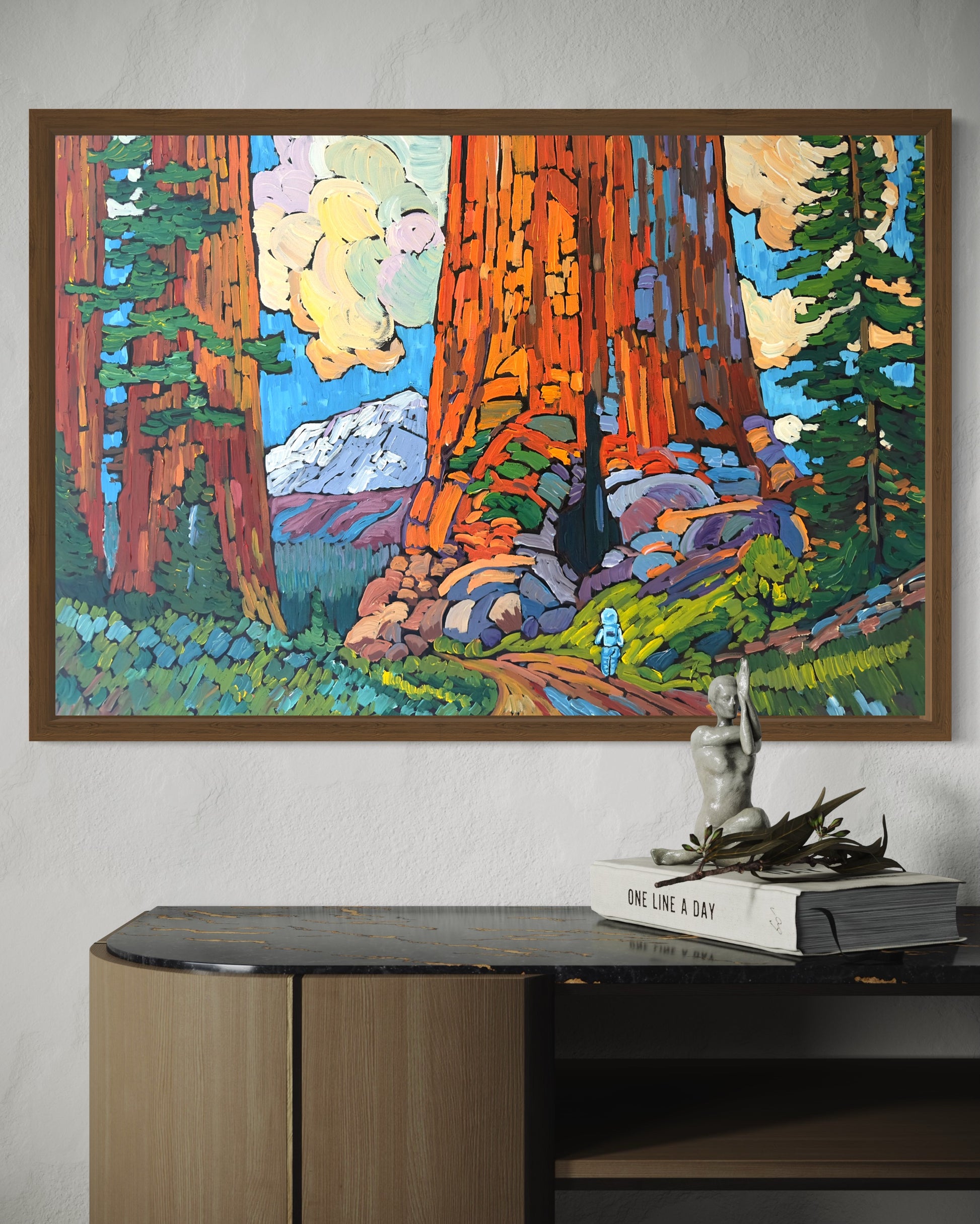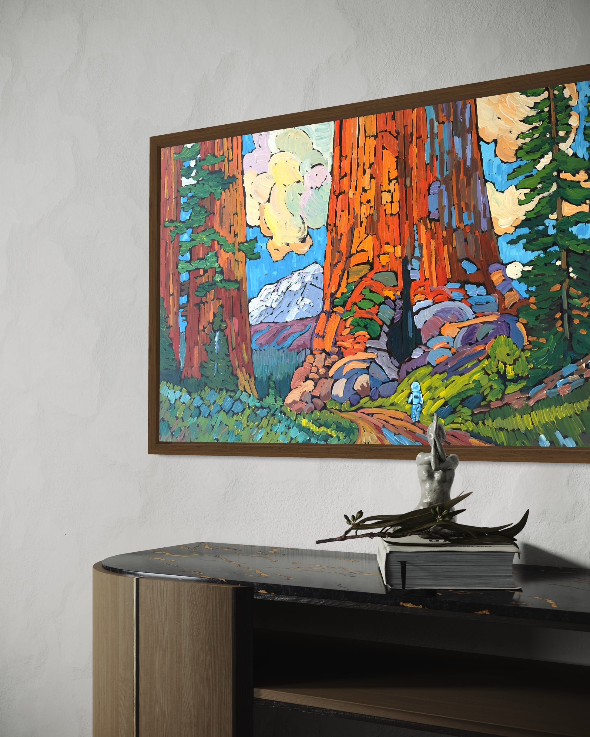 In this captivating artwork, an astronaut embarks on a journey through the majestic beauty of Redwoods National Park. Towering trees envelop the scene, their ancient presence captured in bold impasto strokes on a 24x36" canvas. The astronaut's presence amidst these giants evokes a sense of awe and wonder, blending the realms of space exploration with the earthly grandeur of the redwood forest. Whether displayed as the centerpiece of a room or elegantly framed, this piece invites viewers to contemplate the vastness of both the cosmos and the natural world. Please note, the painting is unframed, and all original prices include shipping costs. Securely shipped and insured via UPS for peace of mind.