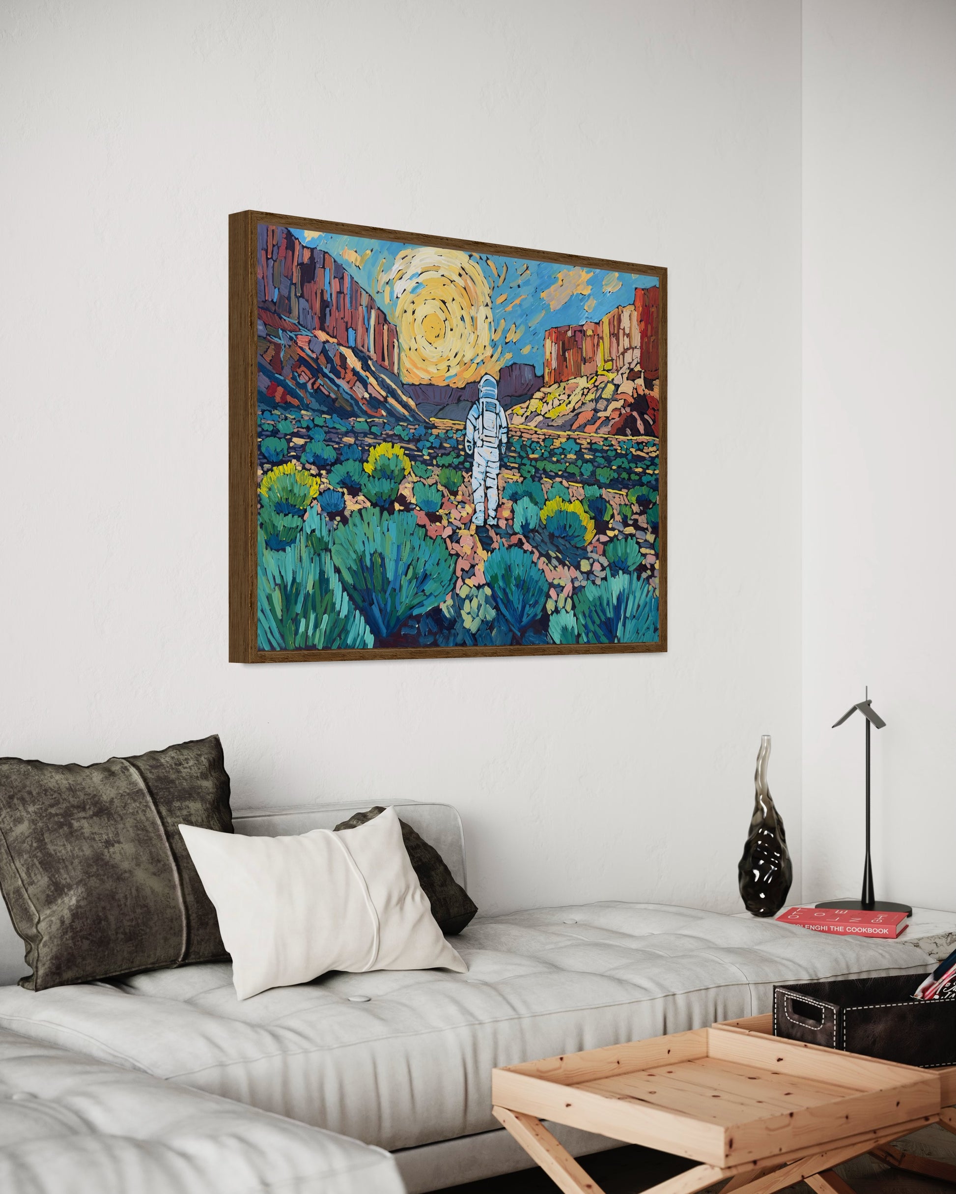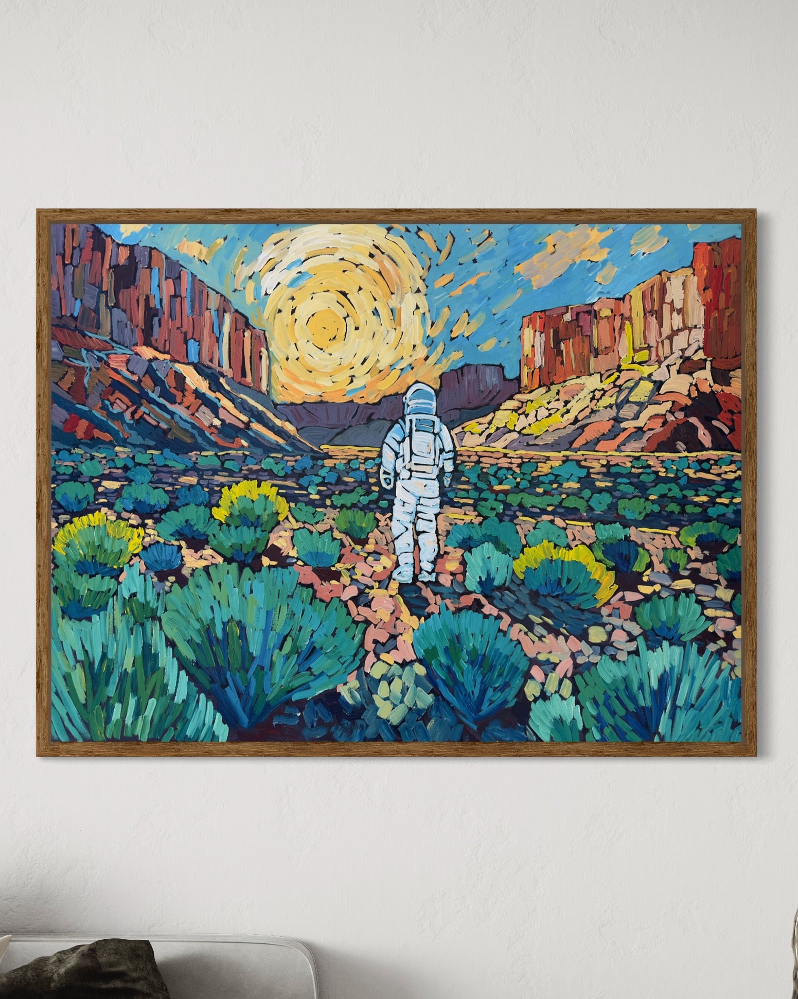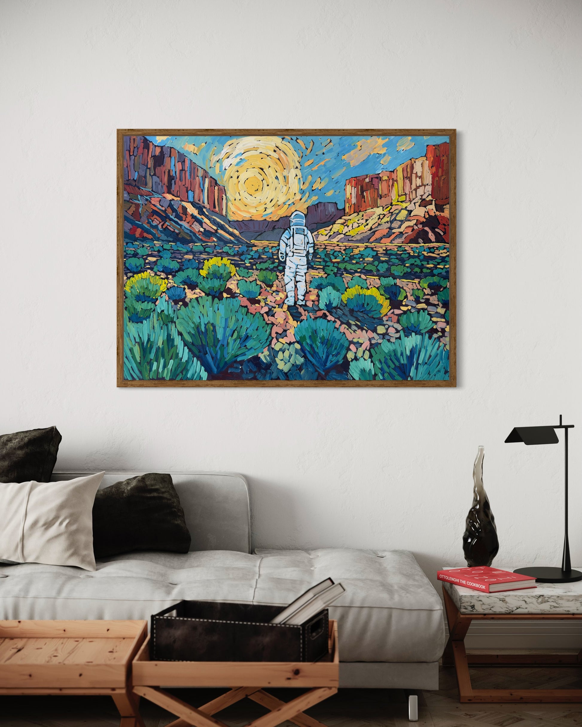 This vibrant painting portrays an astronaut's journey through the rugged beauty of the American West, capturing the essence of sagebrush, plateaus, and desert landscapes beneath a mesmerizing sunset. Measuring 36" x 48" and executed in an impasto style, the artwork offers a textured and dynamic representation of the scene. Whether showcased as the centerpiece of a room or adorned with an elegant frame, this piece evokes a sense of wonder and exploration, merging the realms of space and earthly wilderness.