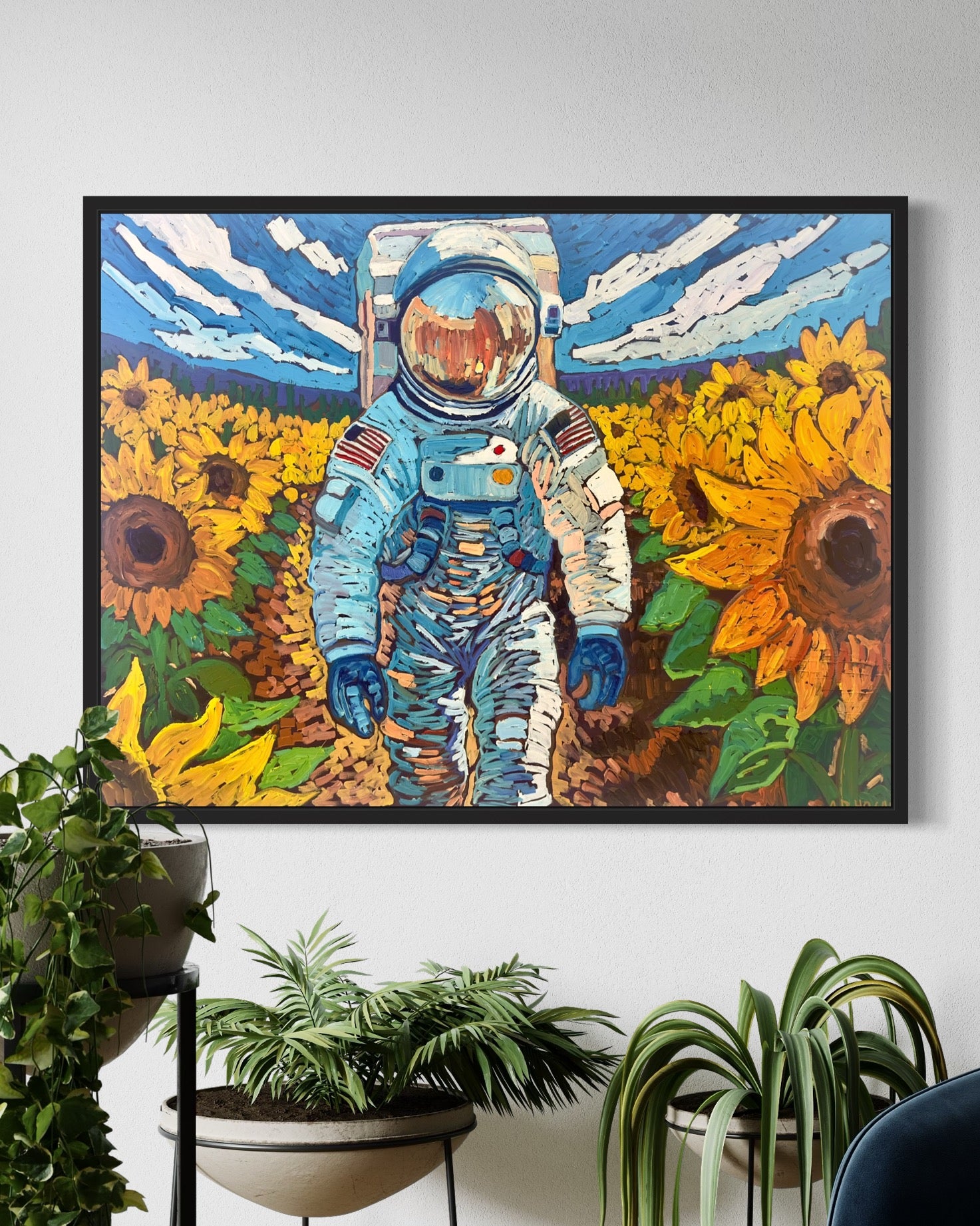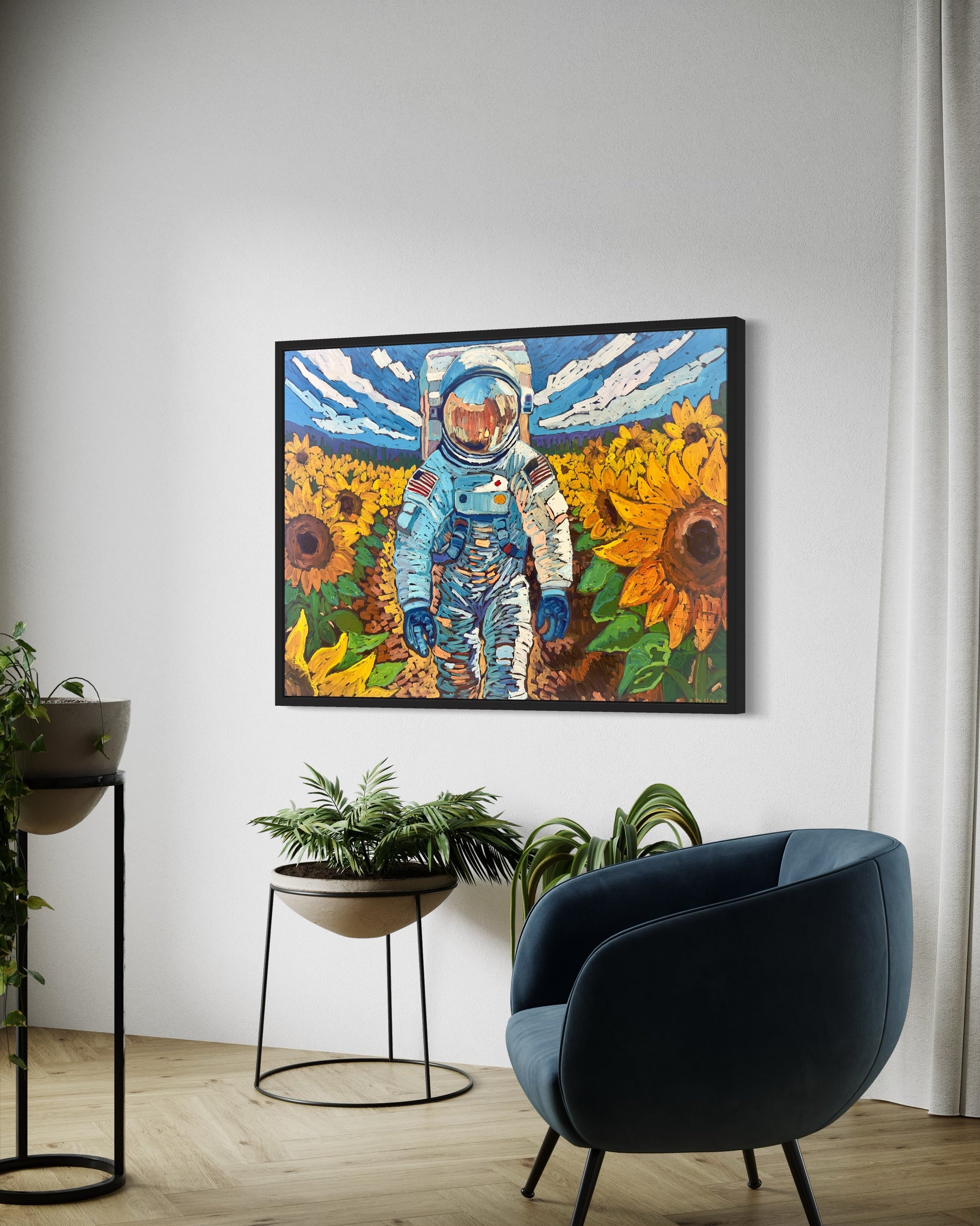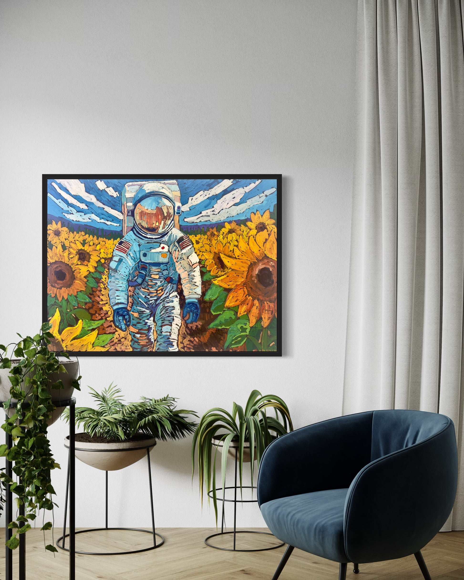 "Cosmic Bloom" is a captivating 36"x48" painting that depicts an astronaut walking through a vibrant field of sunflowers, blending the wonders of space exploration with the beauty of Earth’s natural world. Bold, textured brushstrokes bring the scene to life, with the sunflowers reaching towards the sky, bathed in golden light.