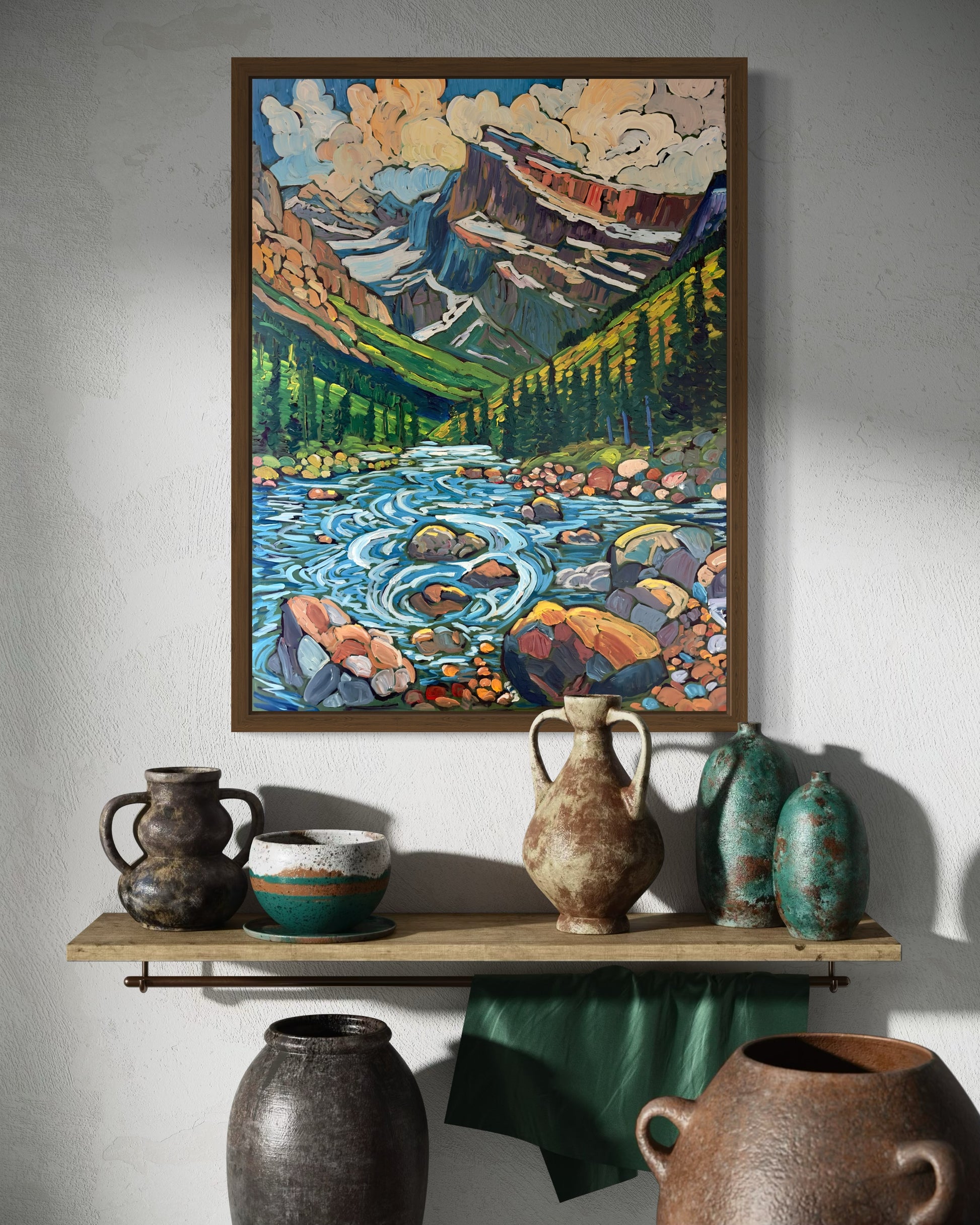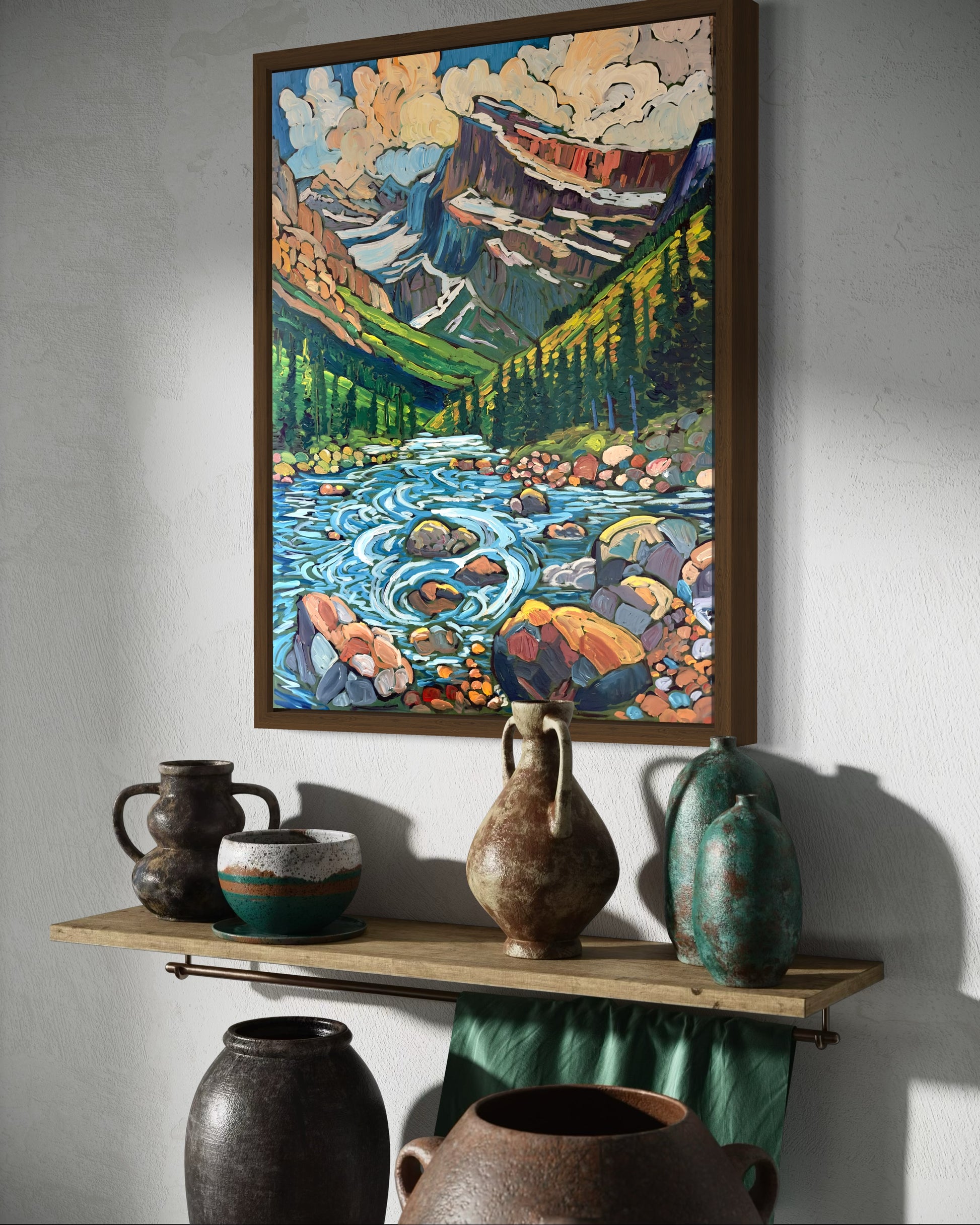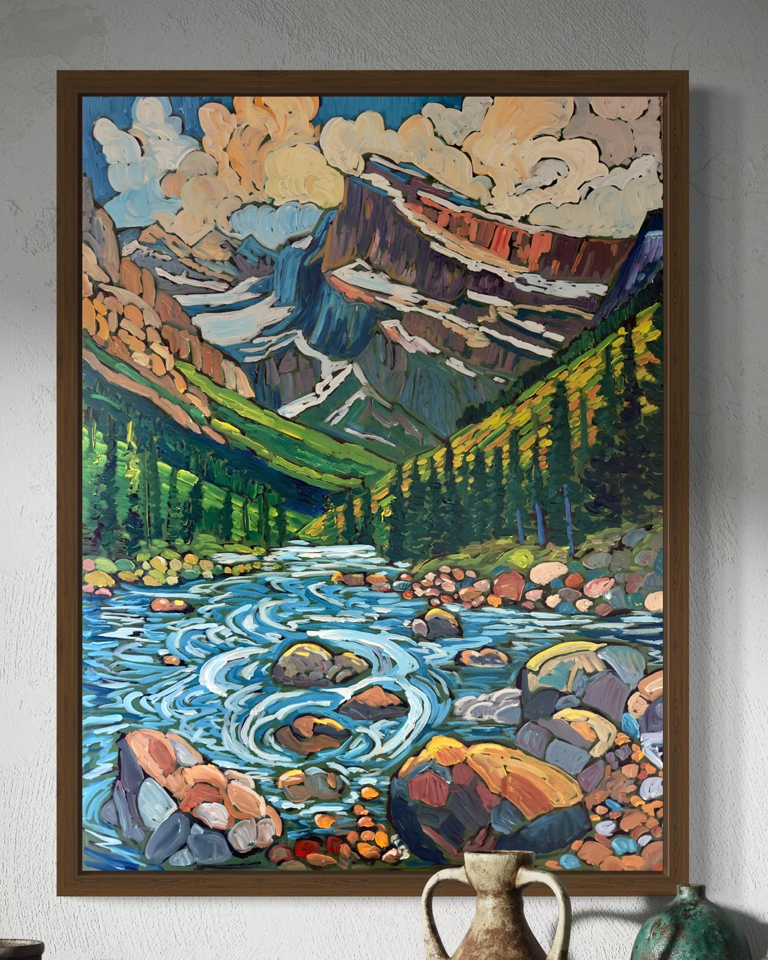 This 32"x24" painting captures the stunning beauty of Glacier National Park, using bold, textured brushstrokes to bring its majestic landscape to life. Towering, snow-capped mountains rise above pristine lakes and lush valleys, all bathed in the crisp, clear light of the wilderness.