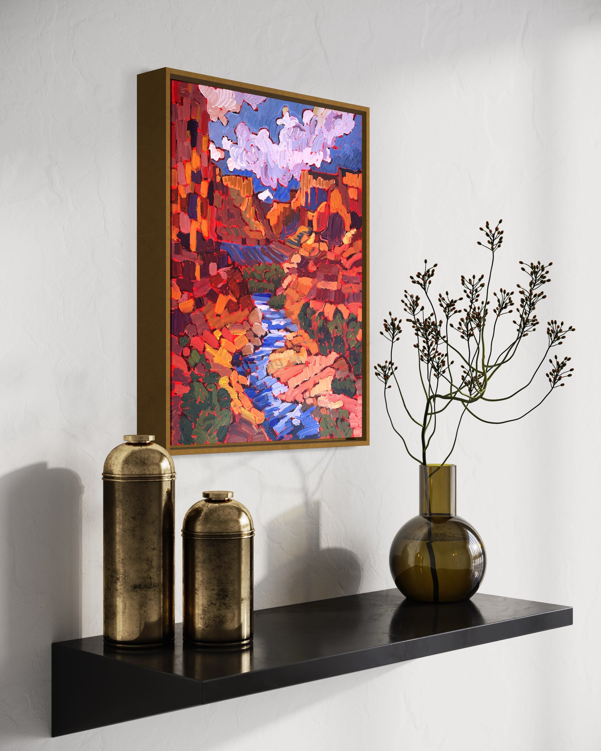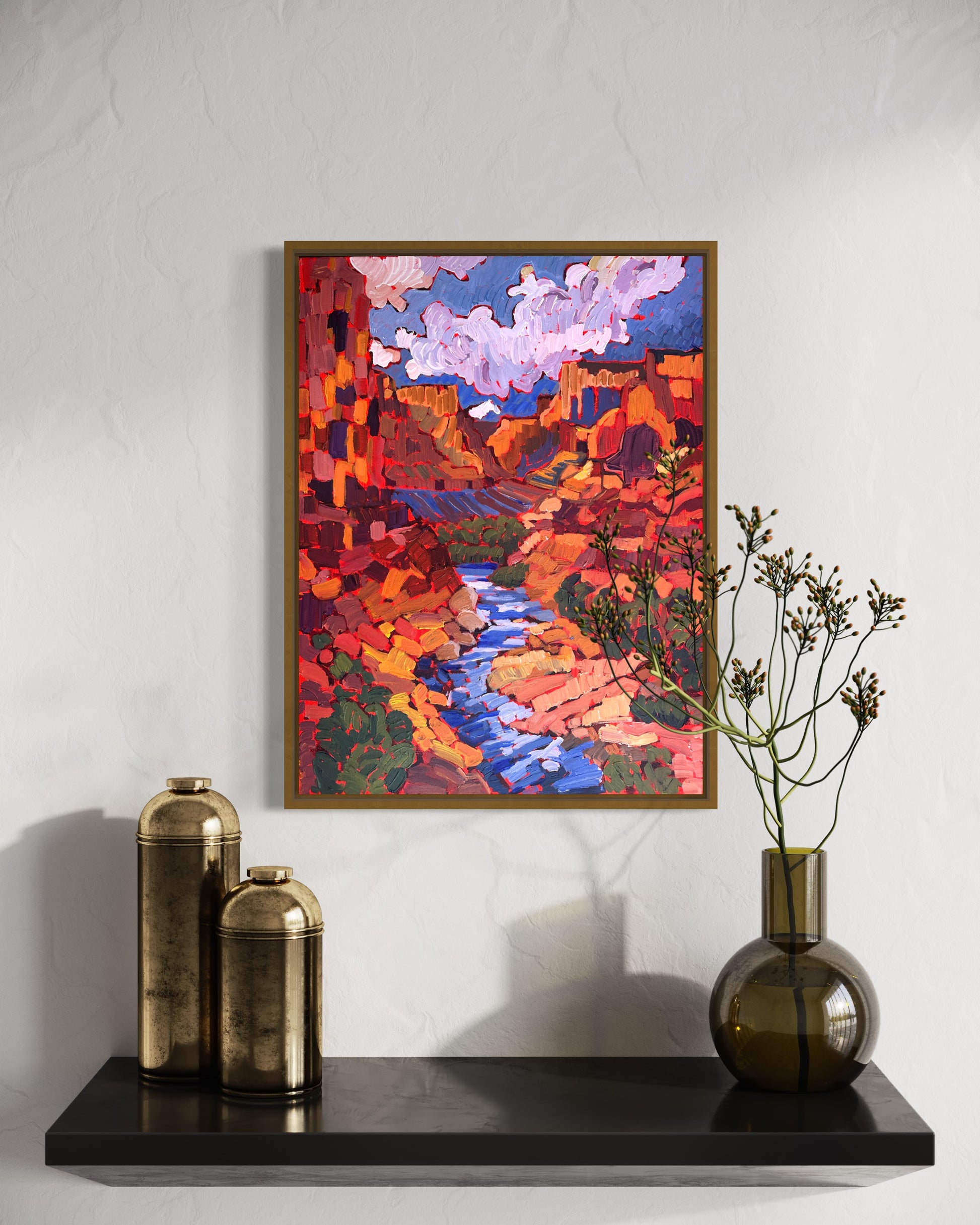Crafted with an impasto style using heavy body acrylics, each stroke embodies the park's dramatic landscapes—the vastness of the canyon, the towering cliffs, and the rich, layered colors of the rock formations. From the majestic views of the South Rim to the rugged beauty of the Colorado River winding below, this painting pays homage to the diverse and awe-inspiring scenes of Grand Canyon National Park.
