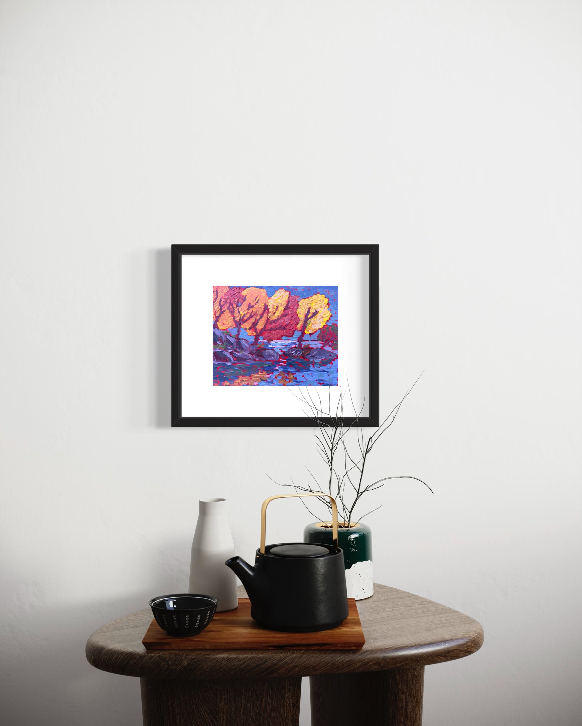 Dive into tranquility with this original 8x10" canvas board painting! Using heavy body acrylics in an impasto style, it vividly captures a serene lake surrounded by trees ablaze in fall colors.