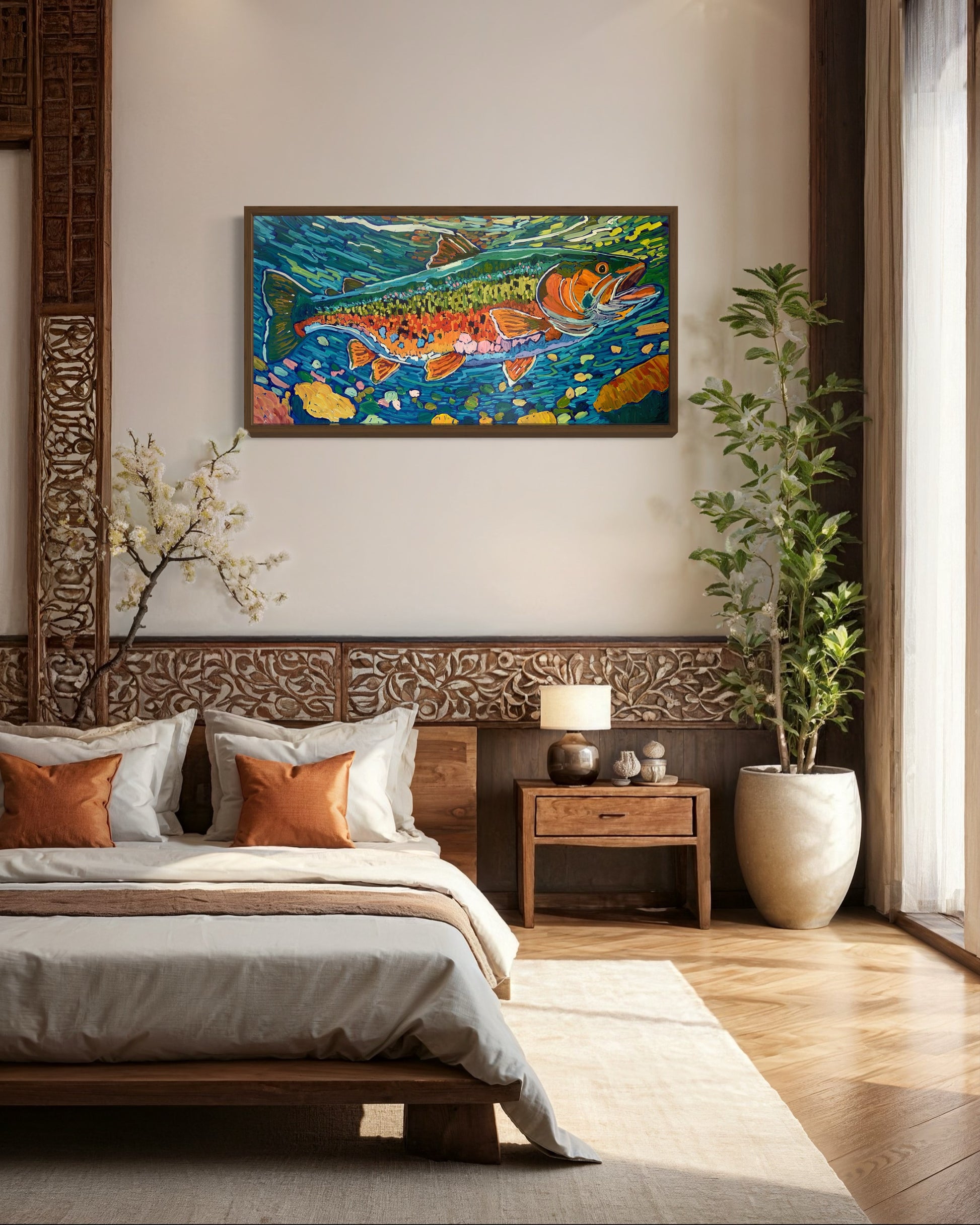 Measuring 24"x48", this generously-sized painting makes a stunning focal point in any space, inviting viewers to appreciate the grace and beauty of the brook trout. Shipping is included in the price, ensuring a seamless and secure delivery of this extraordinary piece to your doorstep.