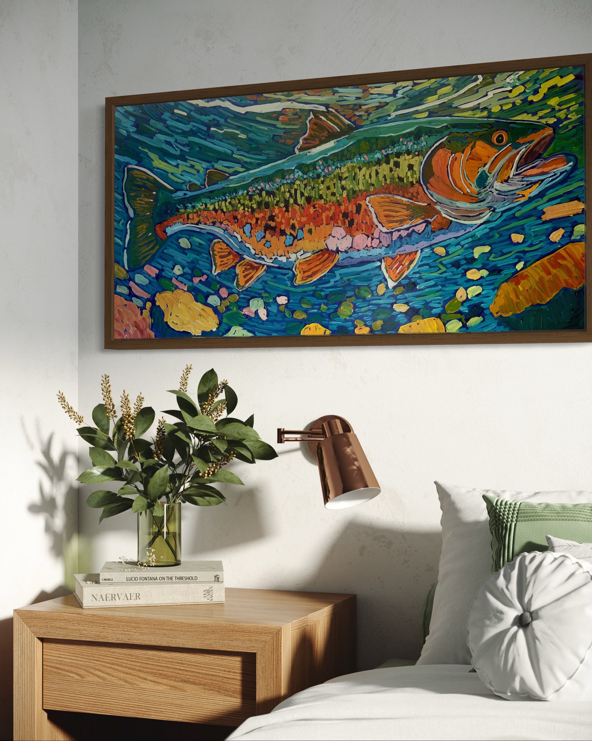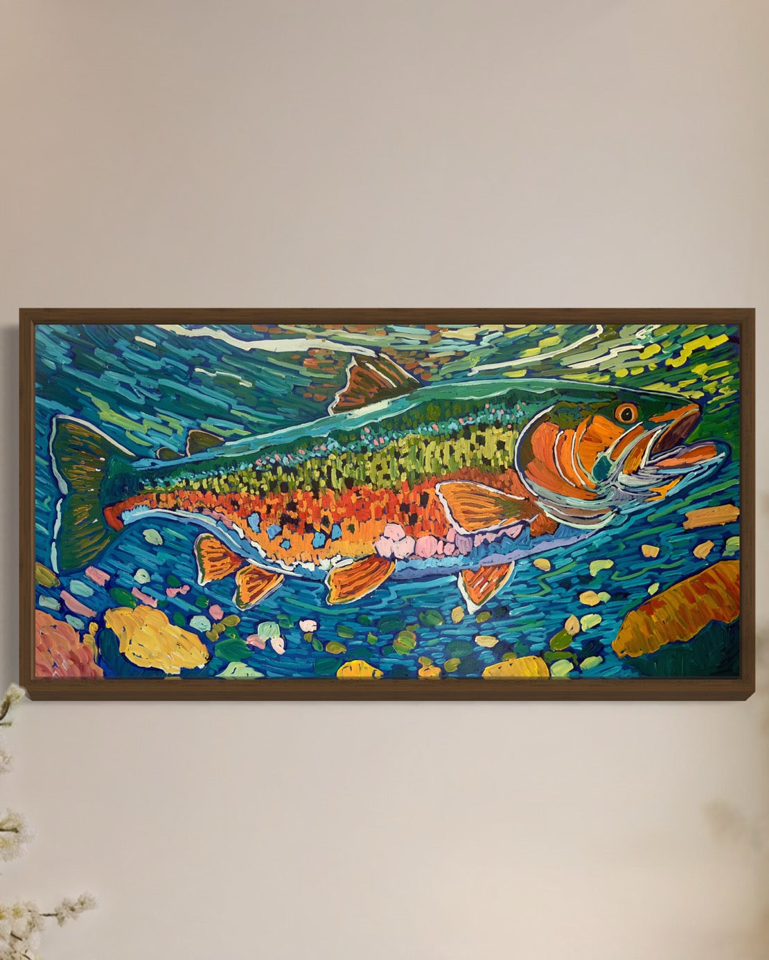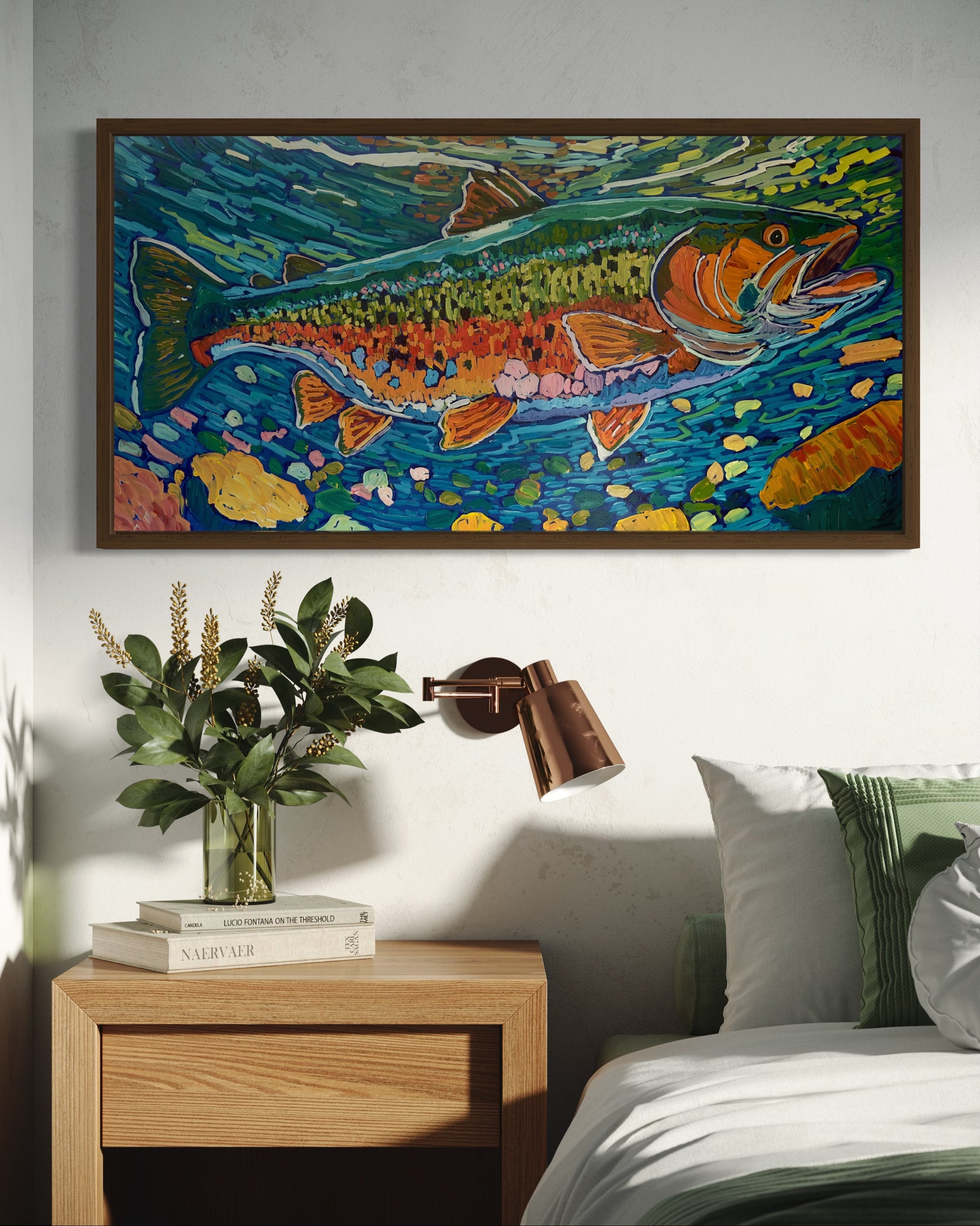 This captivating painting features a vibrant brook trout in its natural habitat. Crafted on a 24"x48" canvas, the artwork vividly captures the intricate details and dynamic colors of this beautiful fish.