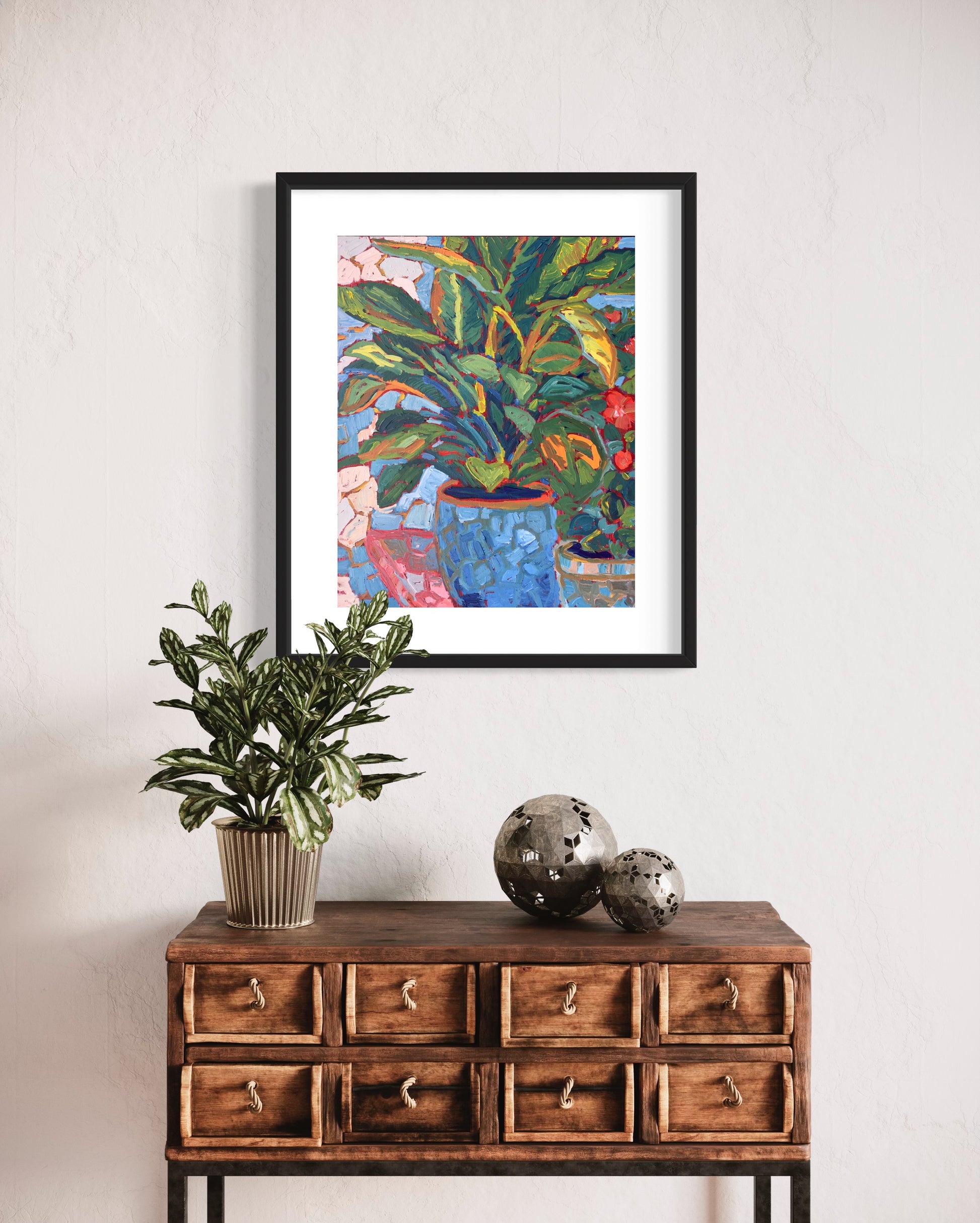 Step into a lush botanical paradise with this captivating 16"x20" canvas board painting! Created using heavy body acrylics in an impasto style, it beautifully portrays a collection of house plants, each one bursting with vibrant colors and life.