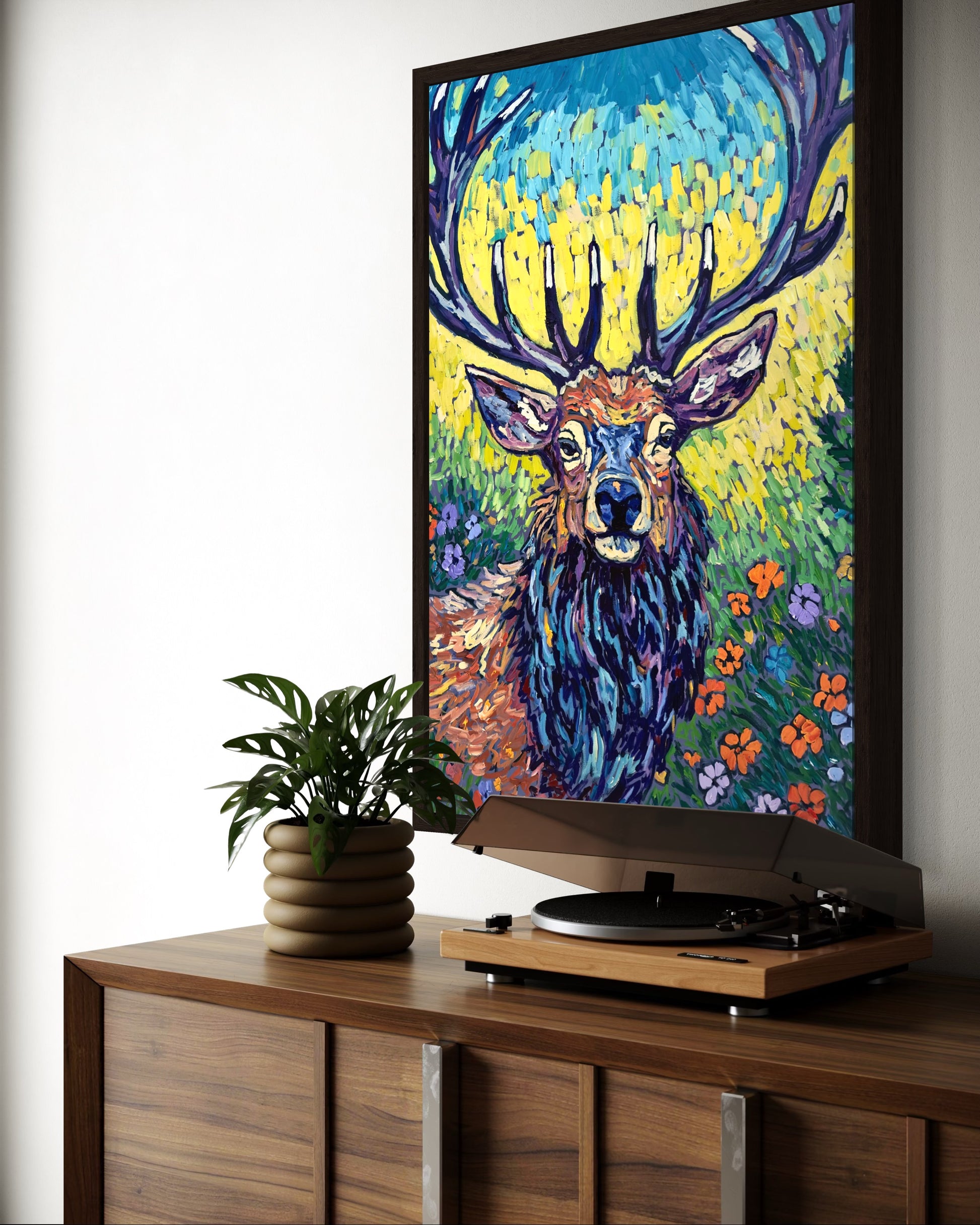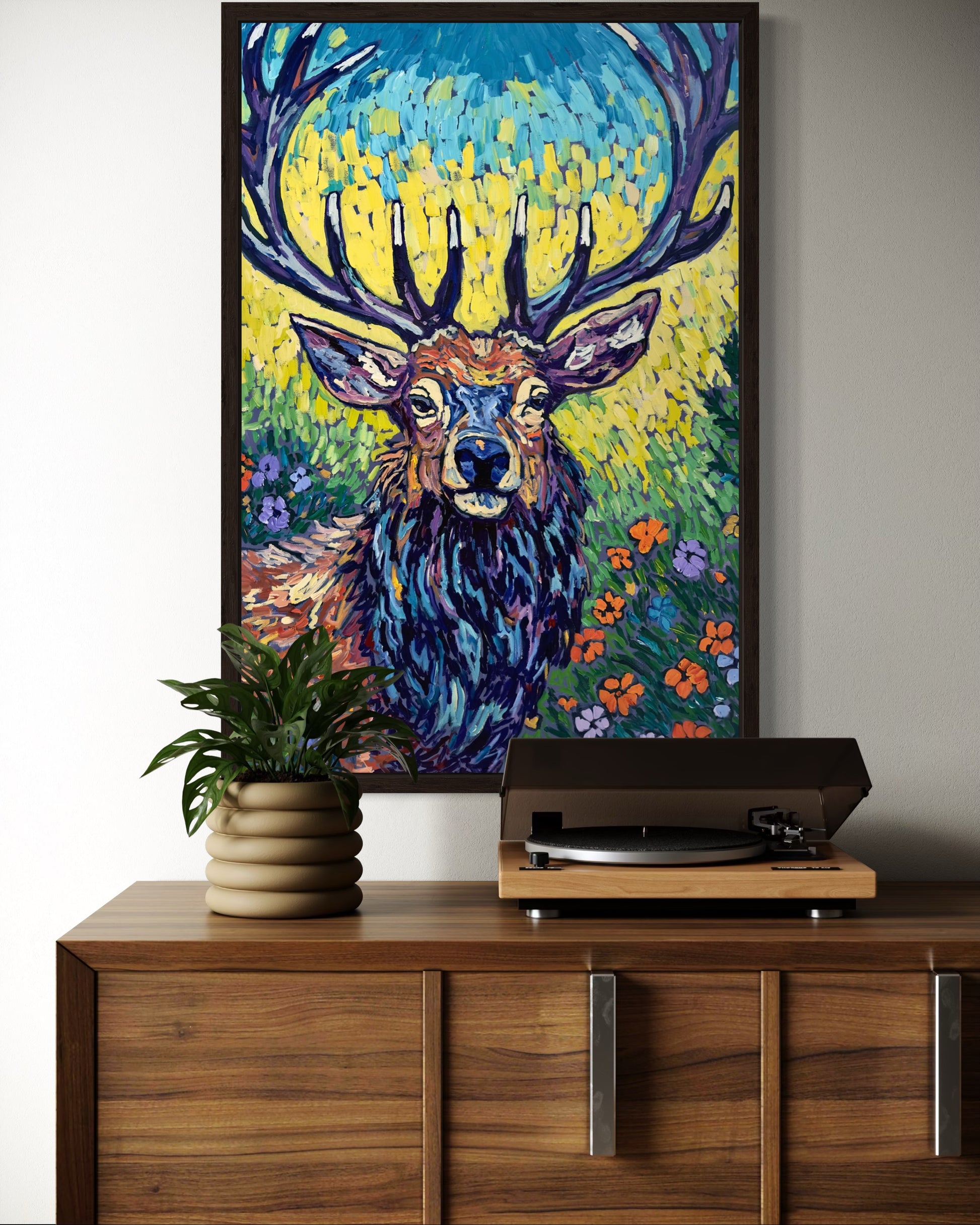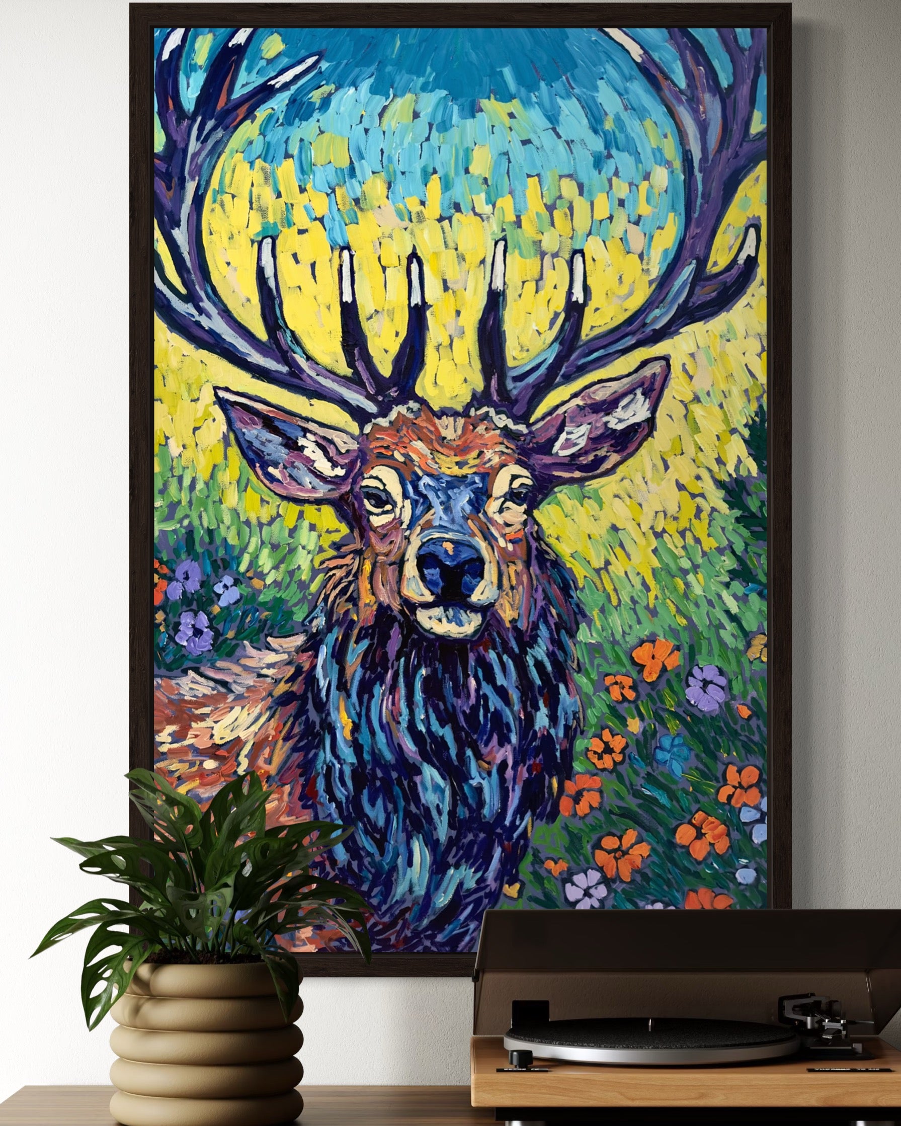 A regal stag stands in quiet majesty, its antlers crowned like a king of the wild. Set against a rich, floral background, "John" blends strength and grace, capturing the untamed beauty of nature with bold impasto brushstrokes. The texture of the heavy-body acrylic brings depth and movement, making every detail—each petal, each shadow—feel alive.