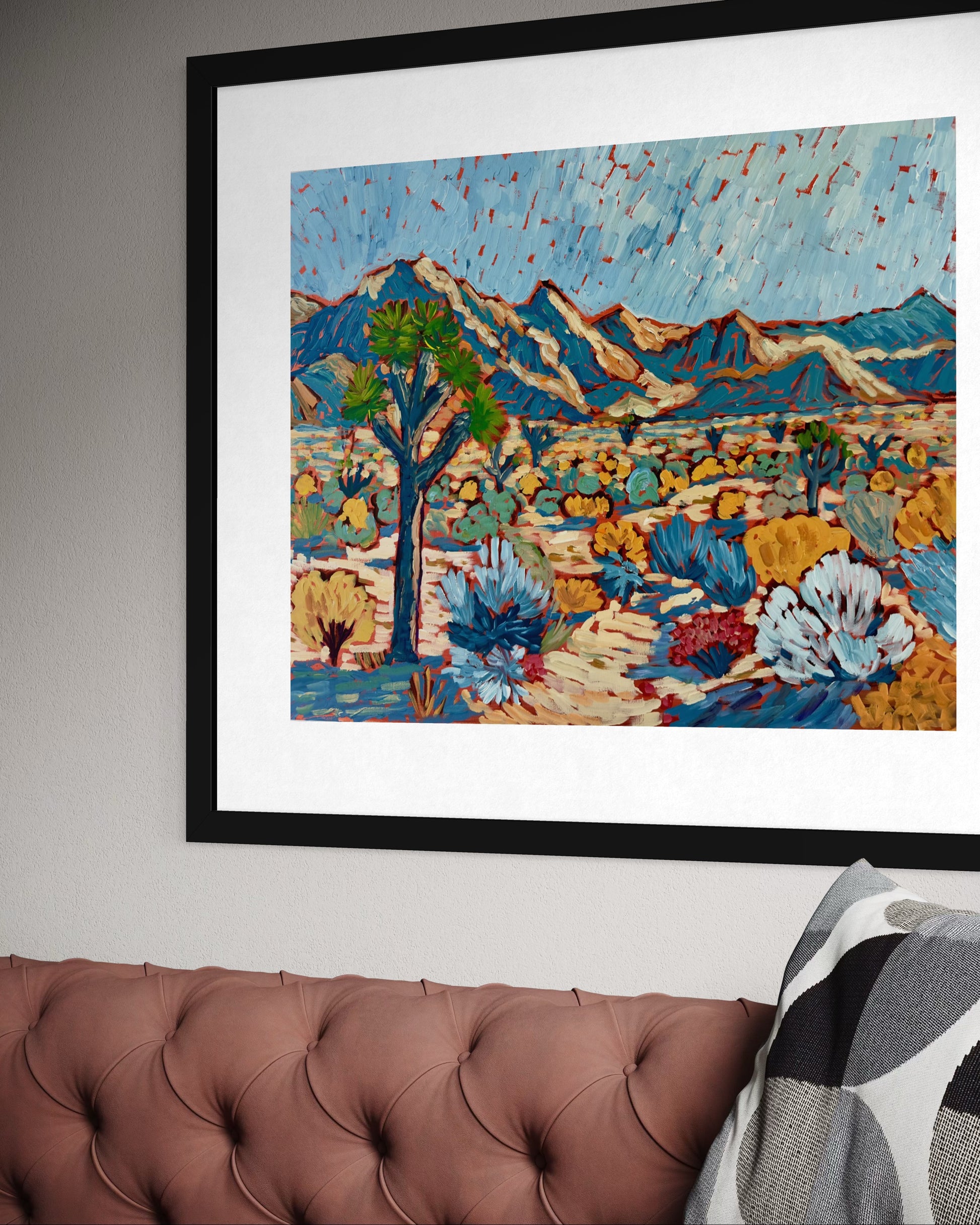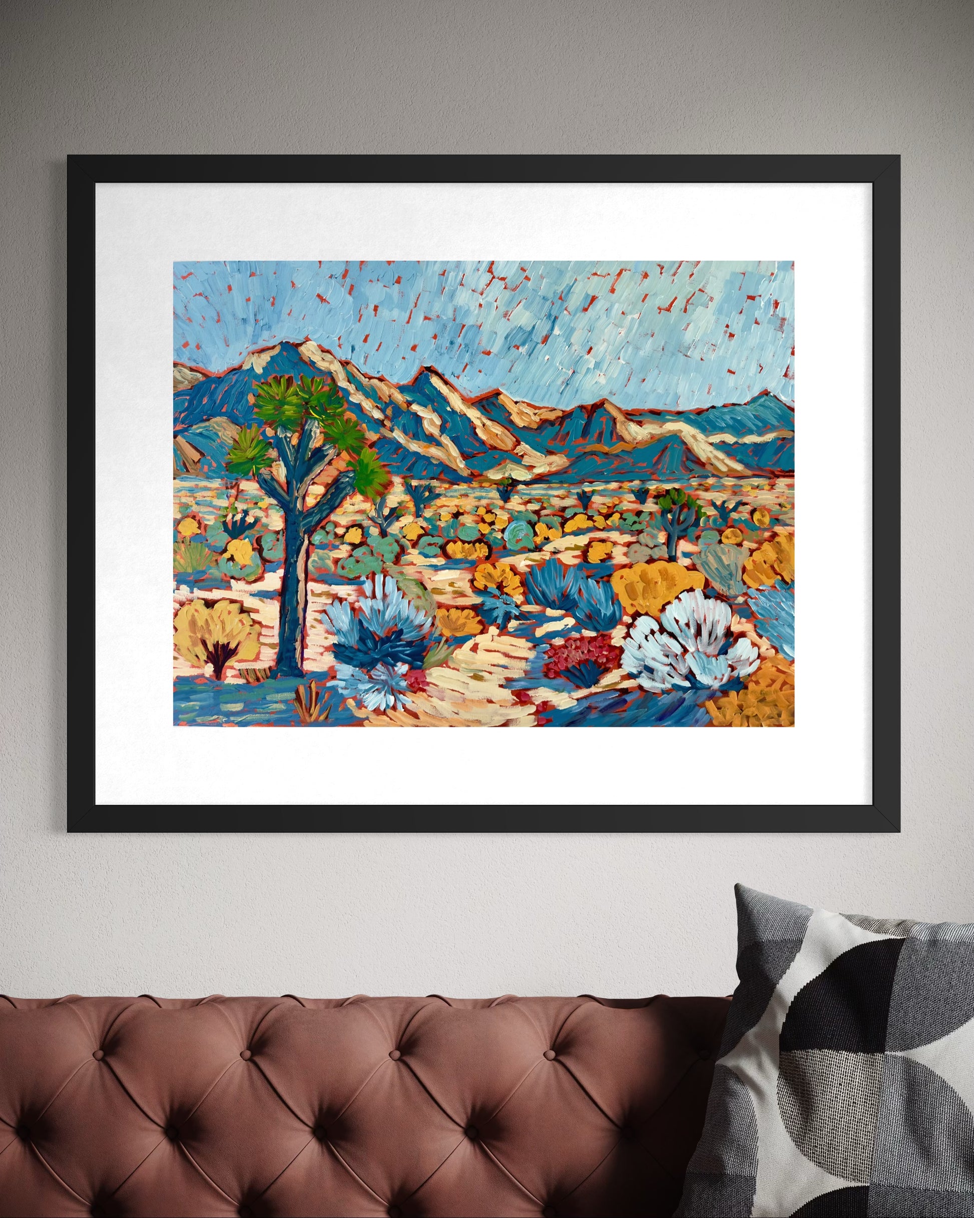 The painting reflects the spirit of Joshua Tree—mysterious, resilient, and full of unexpected beauty. It invites the viewer into a landscape where silence feels expansive, where the strangeness becomes sacred, and where the desert teaches us how to stand strong in the empty places.