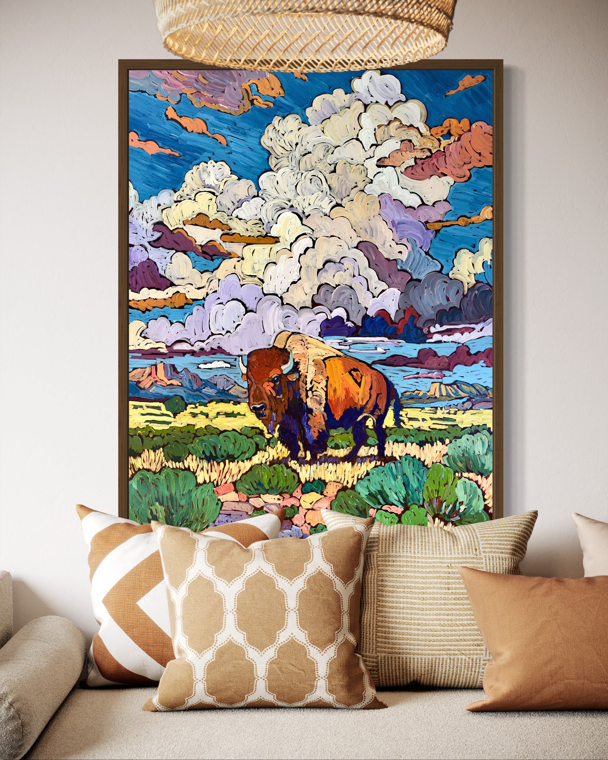 This striking painting features a powerful bison roaming the vast expanse of the American West, with towering cumulus clouds majestically filling the sky overhead. Crafted with bold brushstrokes, the 36x48" canvas captures the rugged beauty and untamed spirit of the landscape.