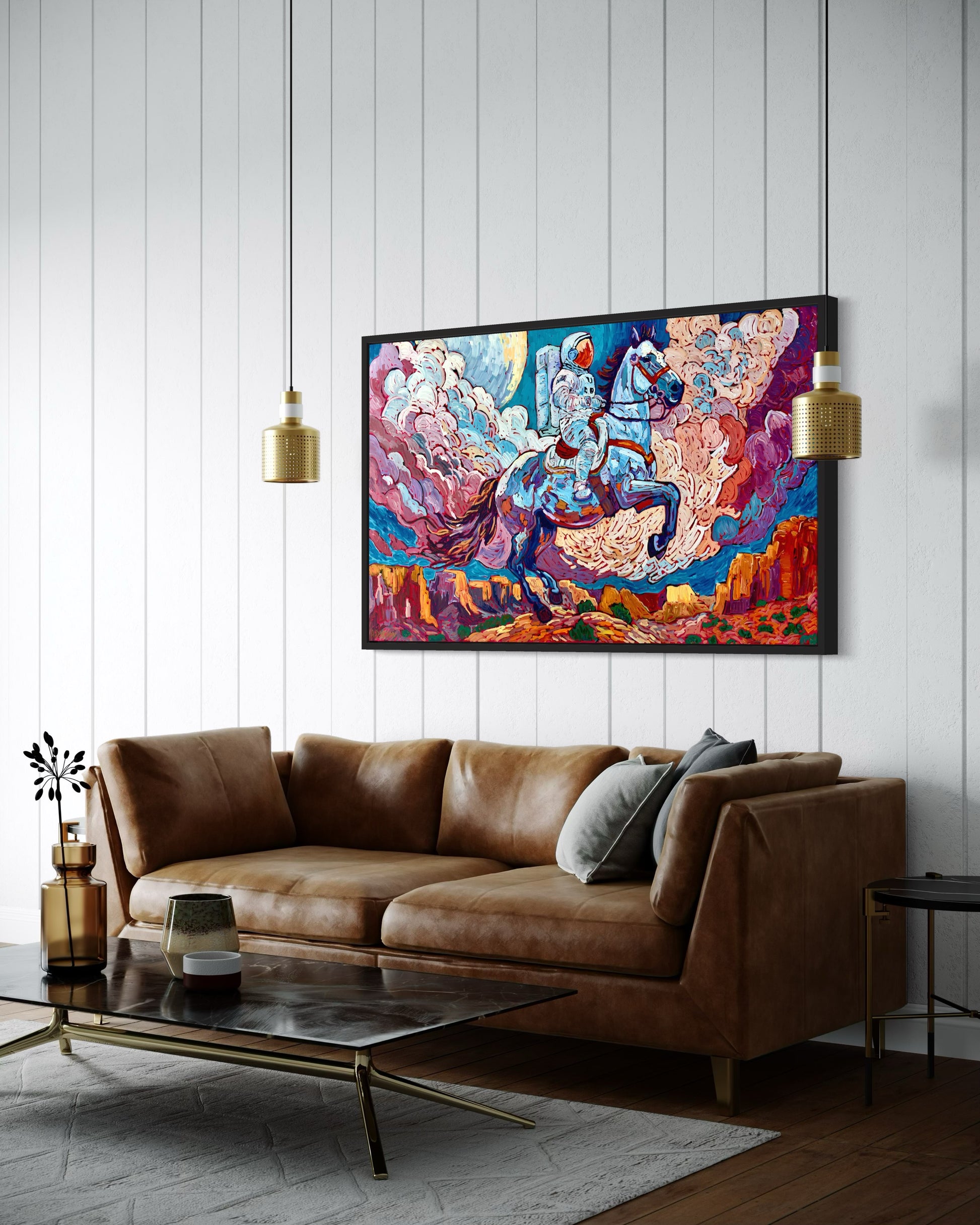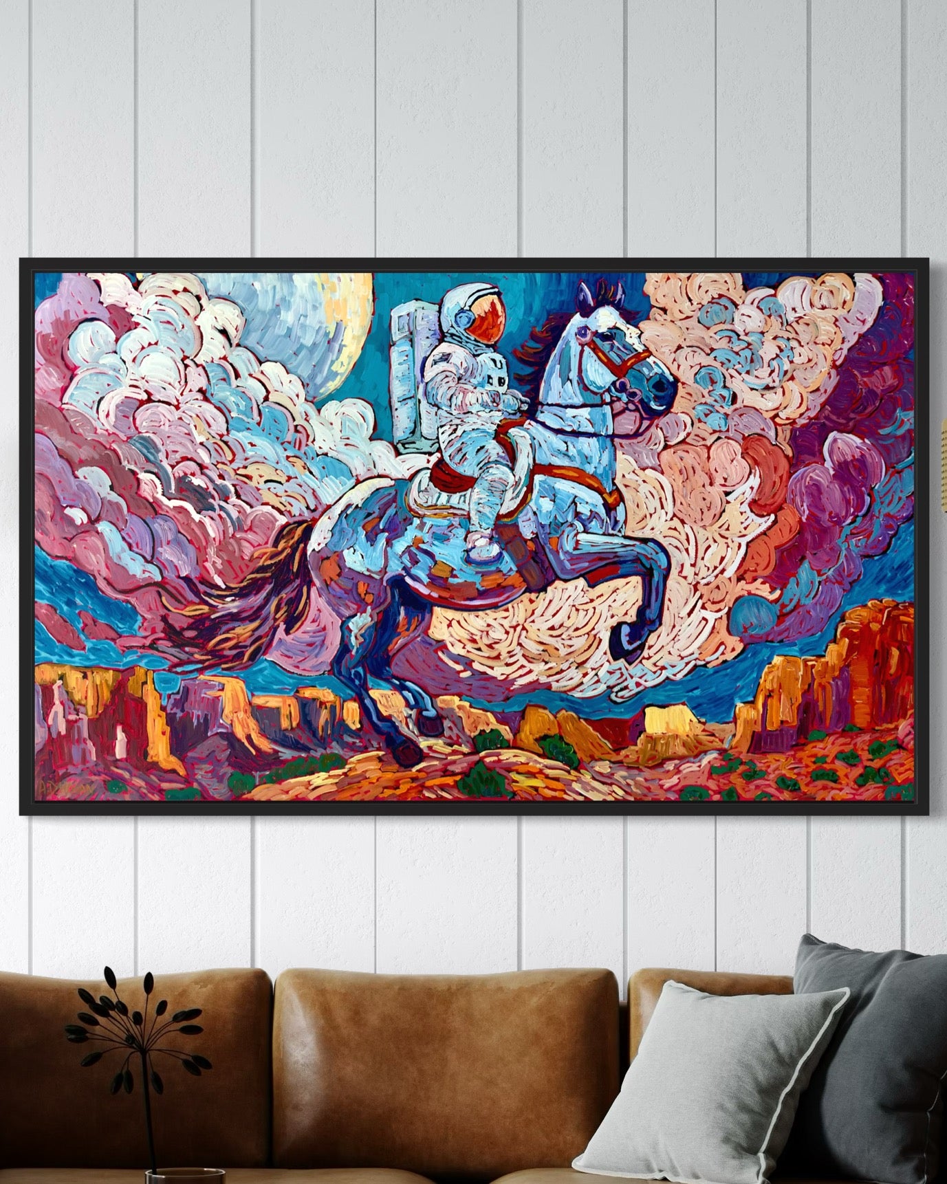 This striking painting, titled "Night Rider," captures an astronaut riding horseback through the vast, moonlit expanse of the American West. Crafted on a 36"x60" canvas, the artwork evokes a sense of mystery and adventure as the rider moves through the rugged terrain beneath a luminous night sky.