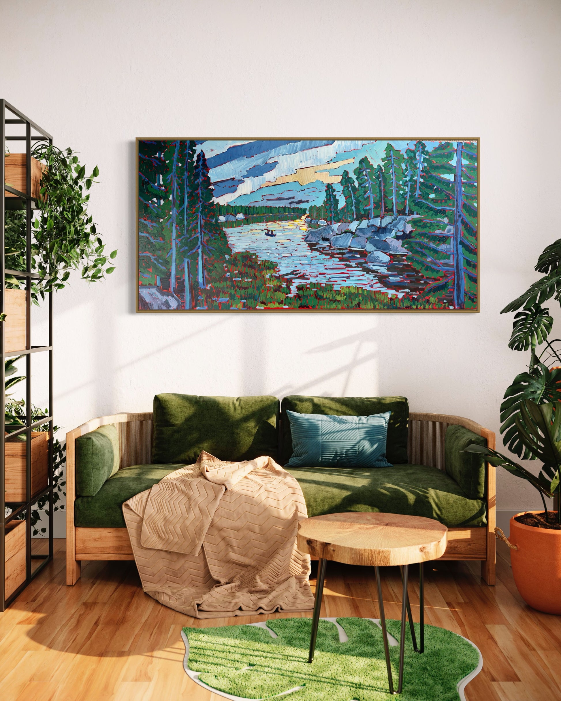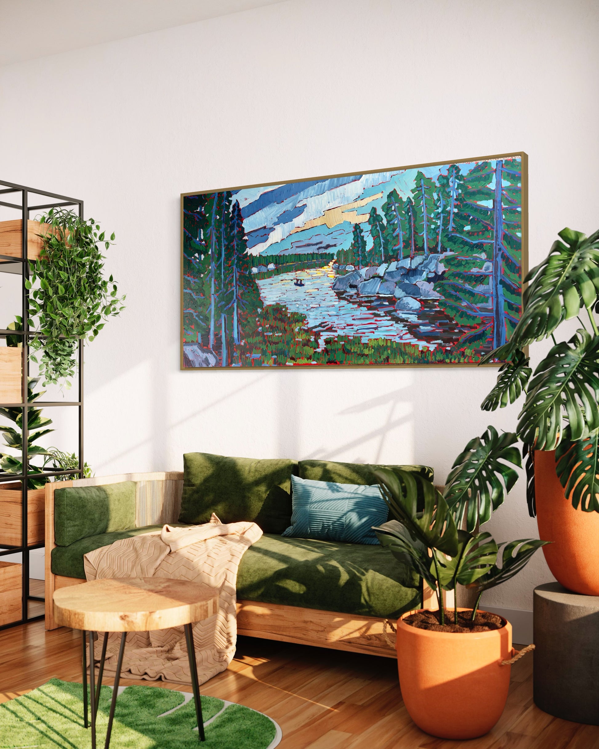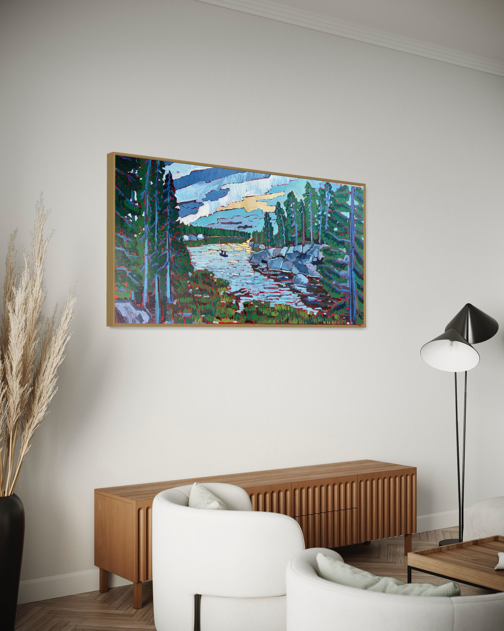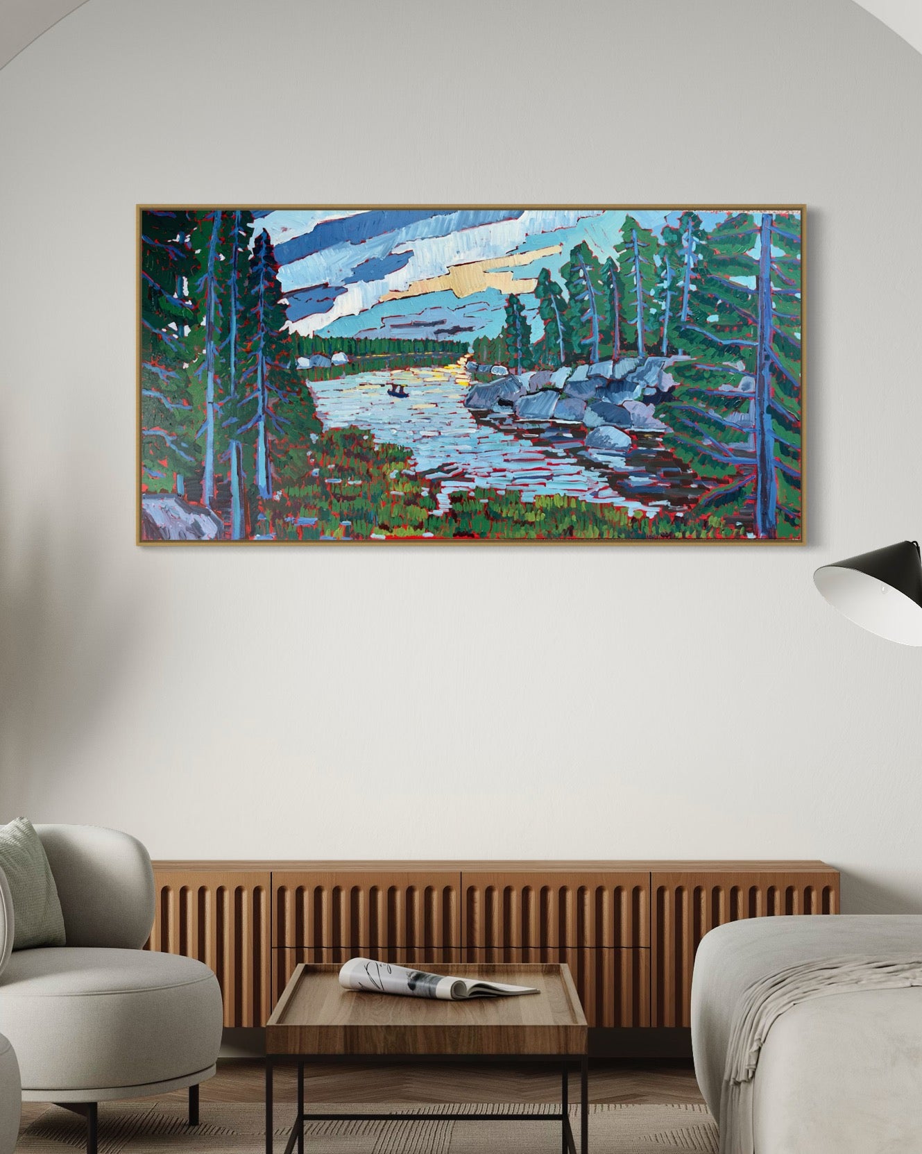 Prepare to embark on an immersive journey into the pristine wilderness with 'Northern Waters,' a captivating masterpiece that celebrates the awe-inspiring beauty of this cherished landscape. In this 36"x72" painting, layers of colors and textures come together to evoke the serene waters, towering pines, and rugged shores of the Boundary Waters. Lose yourself in the vast expanse of this unspoiled paradise, where the symphony of nature whispers melodies of tranquility and wonder. Immerse yourself in the harmonious blend of serene reflections, intricate details, and the sense of untamed freedom that only the Boundary Waters can inspire.