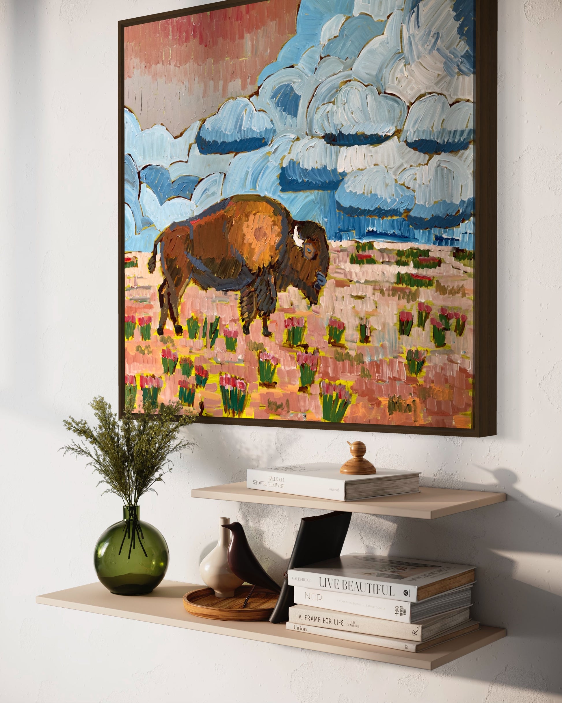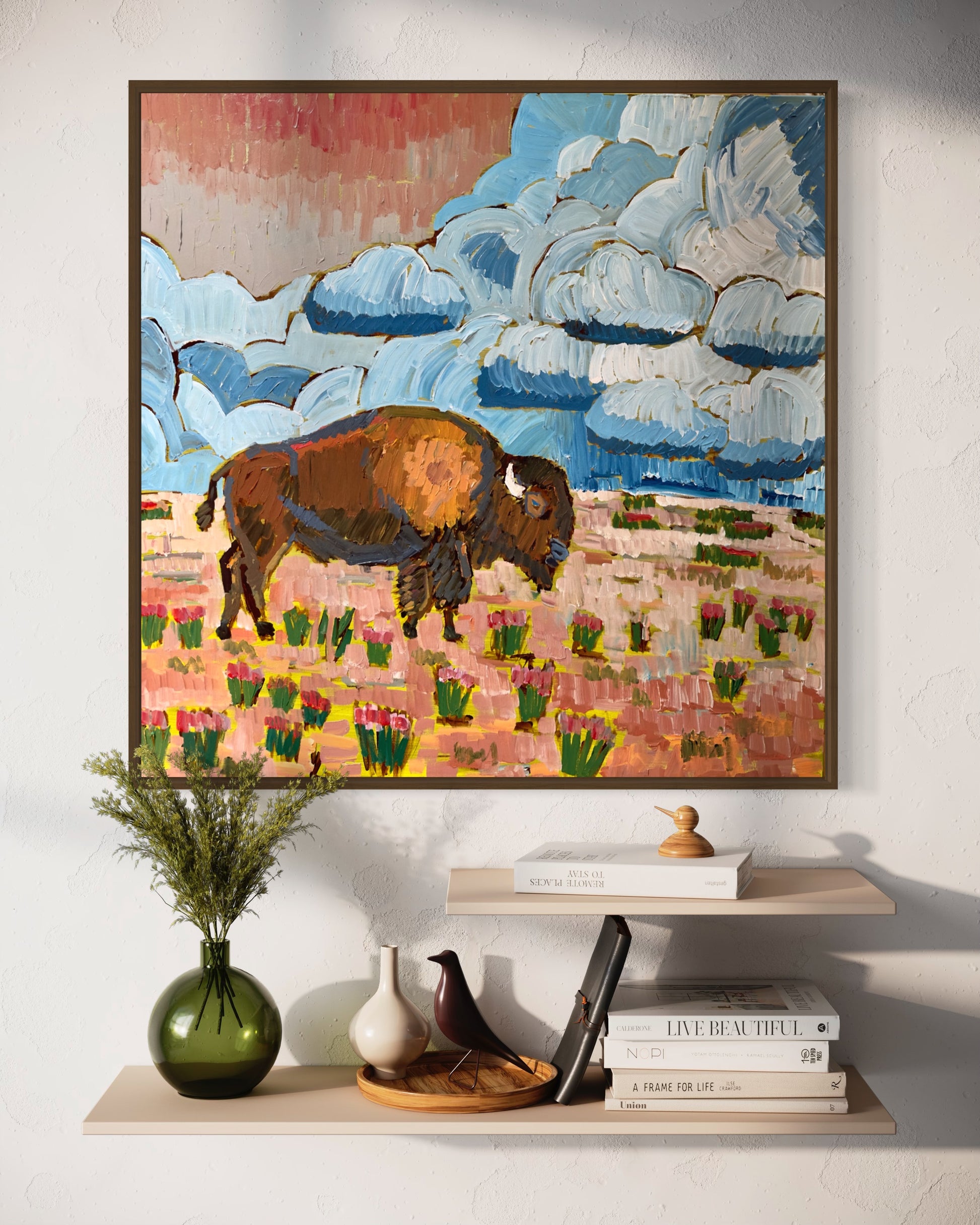 Prepare to be captivated by 'Pride of the Plains,' an extraordinary piece showcasing the majestic American Bison in a breathtaking impasto style. With bold, textured brushstrokes, the bison comes to life, embodying strength, resilience, and a deep connection to the untamed wilderness. Against a dramatic backdrop of expansive skies, where large billowing clouds dance across the horizon, this painting evokes a sense of raw power and tranquility, inviting you to experience the spirit of the American West.
