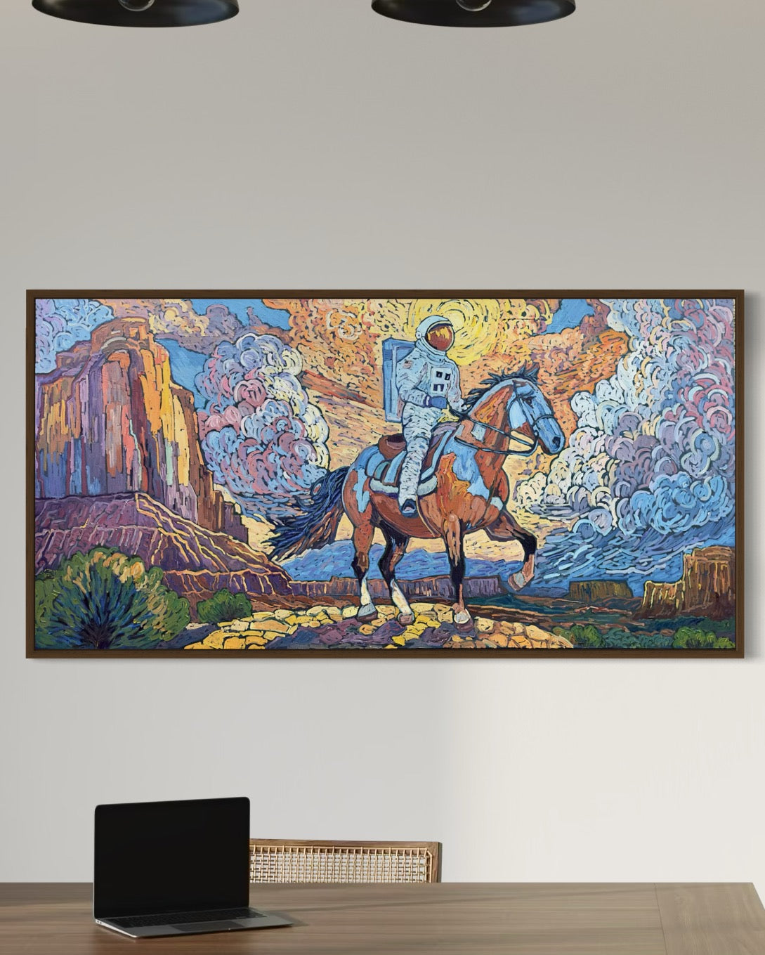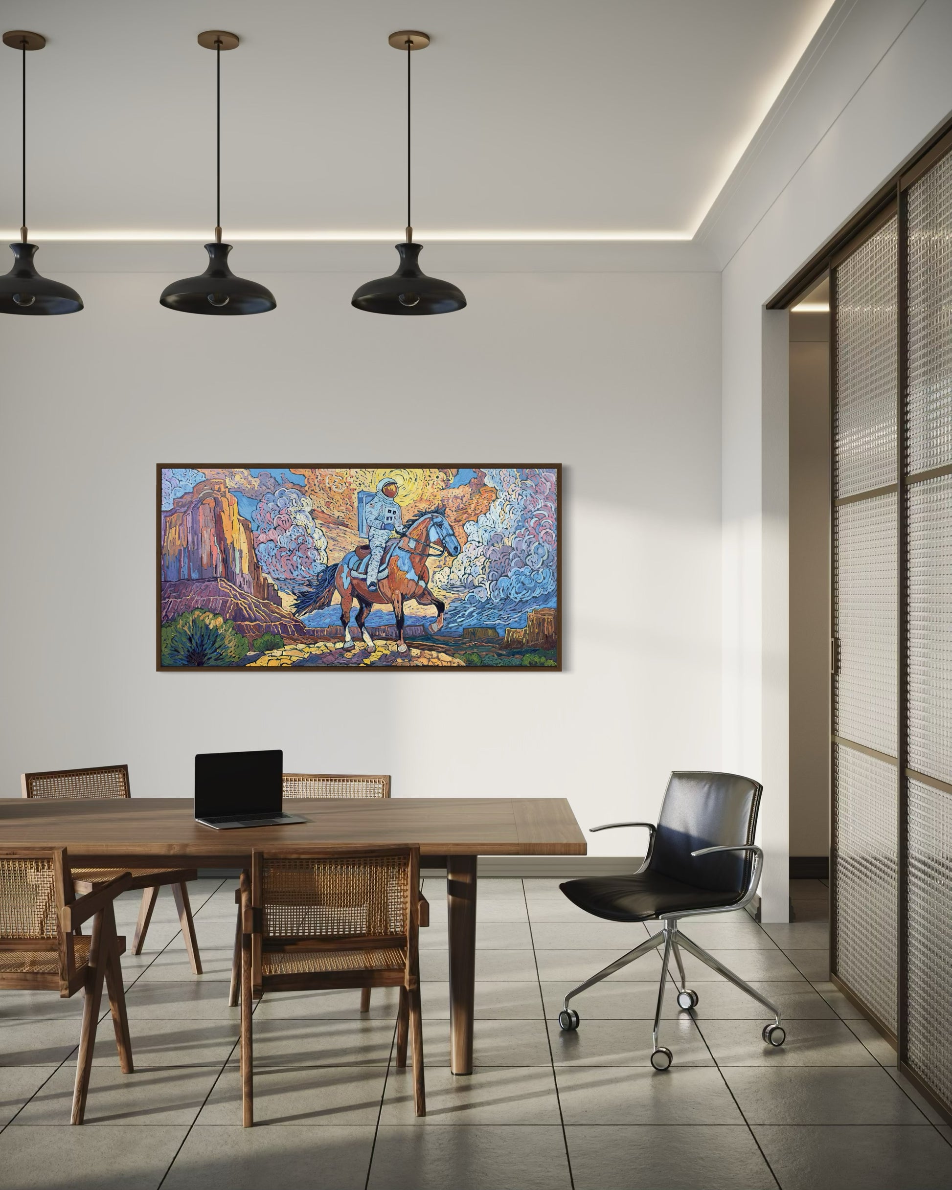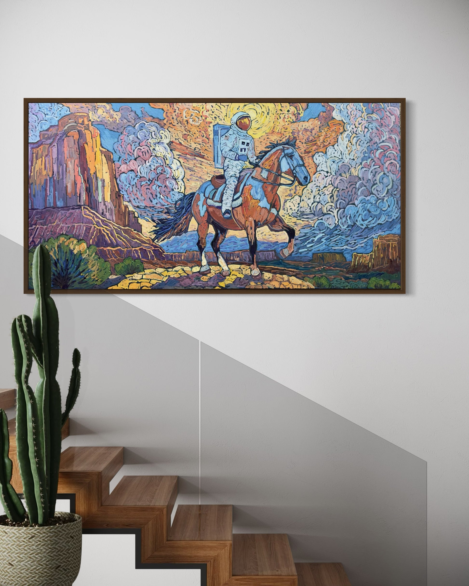 Immerse yourself in a visionary journey where the rugged beauty of Monument Valley meets the vastness of the cosmos. Red Rocks Rider spans an impressive 40"x80", capturing Astronaut Alice as she rides through Monument Valley’s iconic red rock canyons, blending the natural grandeur of the Southwest with the mystery of the stars. Each brushstroke in heavy body acrylic evokes the powerful textures and warm tones of the terrain, inviting you into a scene where earthly and cosmic worlds converge.
