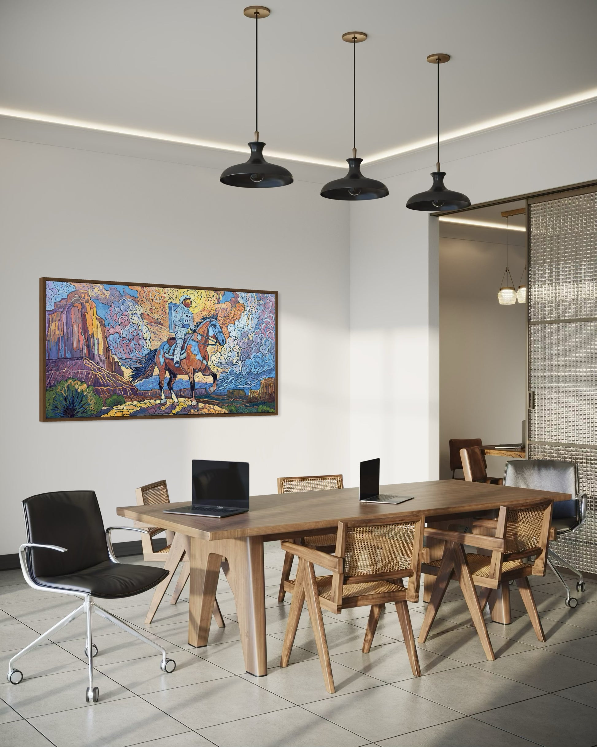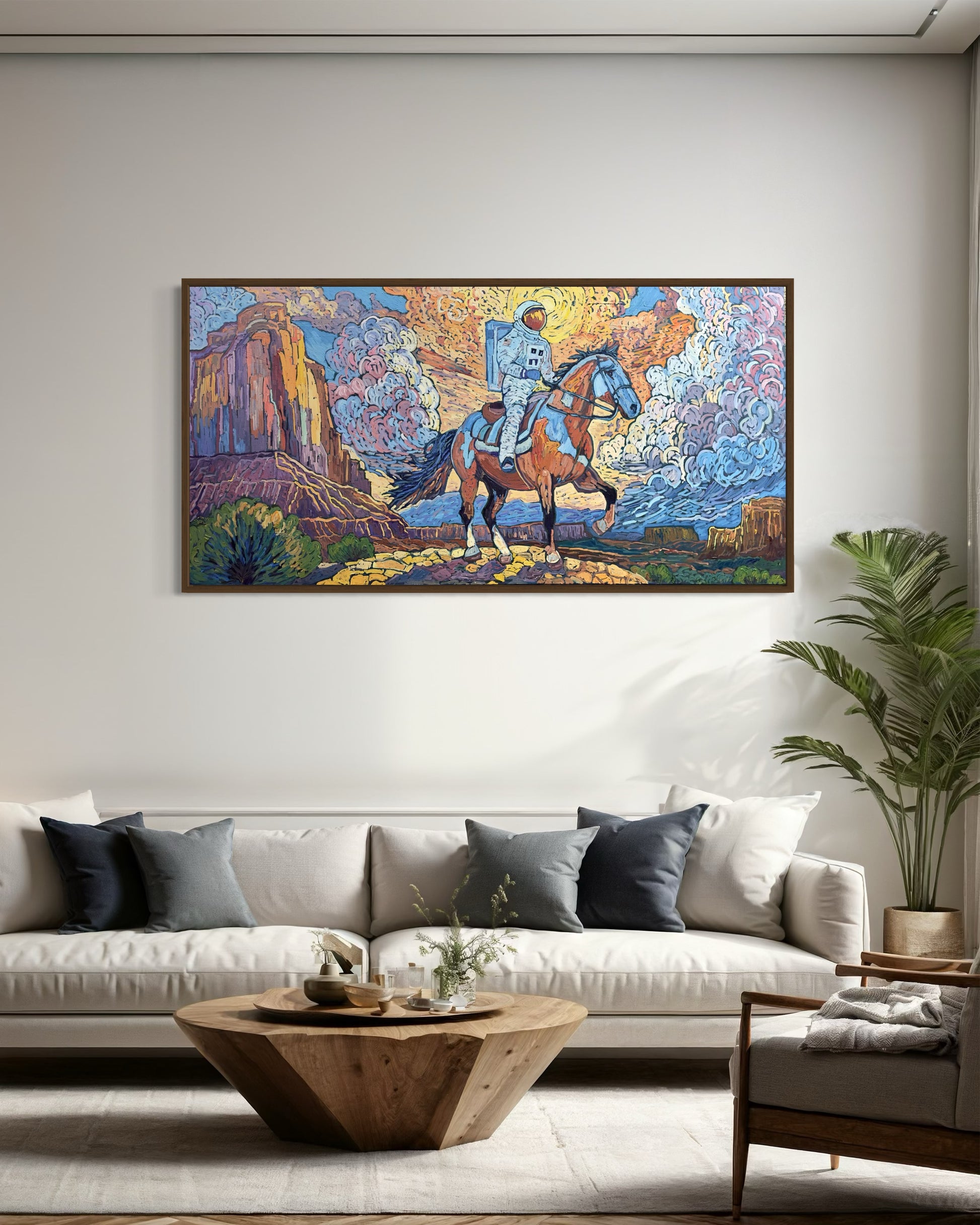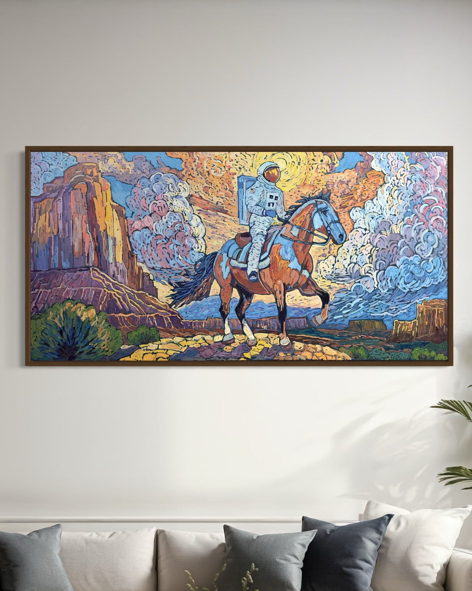 Immerse yourself in a visionary journey where the rugged beauty of Monument Valley meets the vastness of the cosmos. Red Rocks Rider spans an impressive 40"x80", capturing Astronaut Alice as she rides through Monument Valley’s iconic red rock canyons, blending the natural grandeur of the Southwest with the mystery of the stars. Each brushstroke in heavy body acrylic evokes the powerful textures and warm tones of the terrain, inviting you into a scene where earthly and cosmic worlds converge.