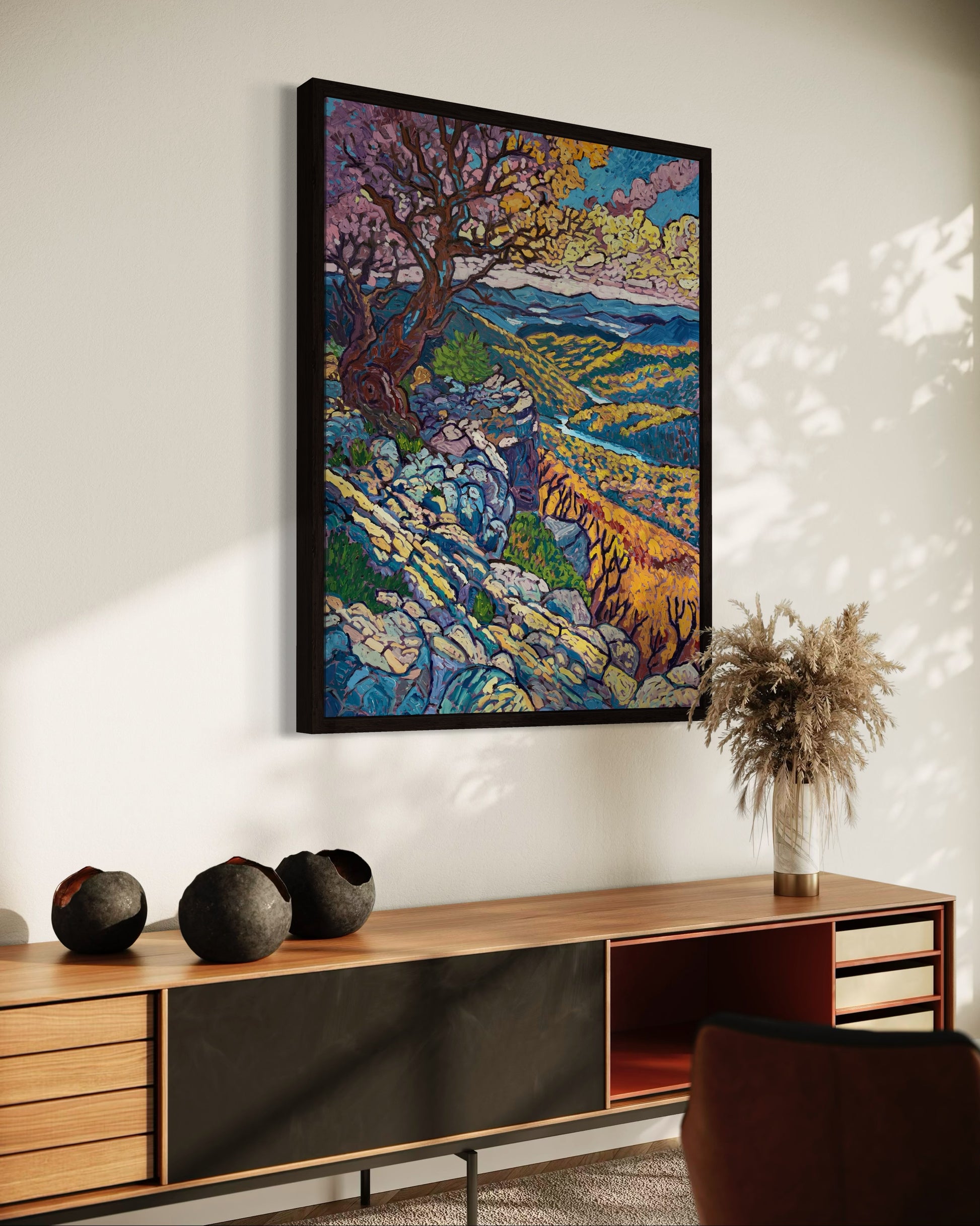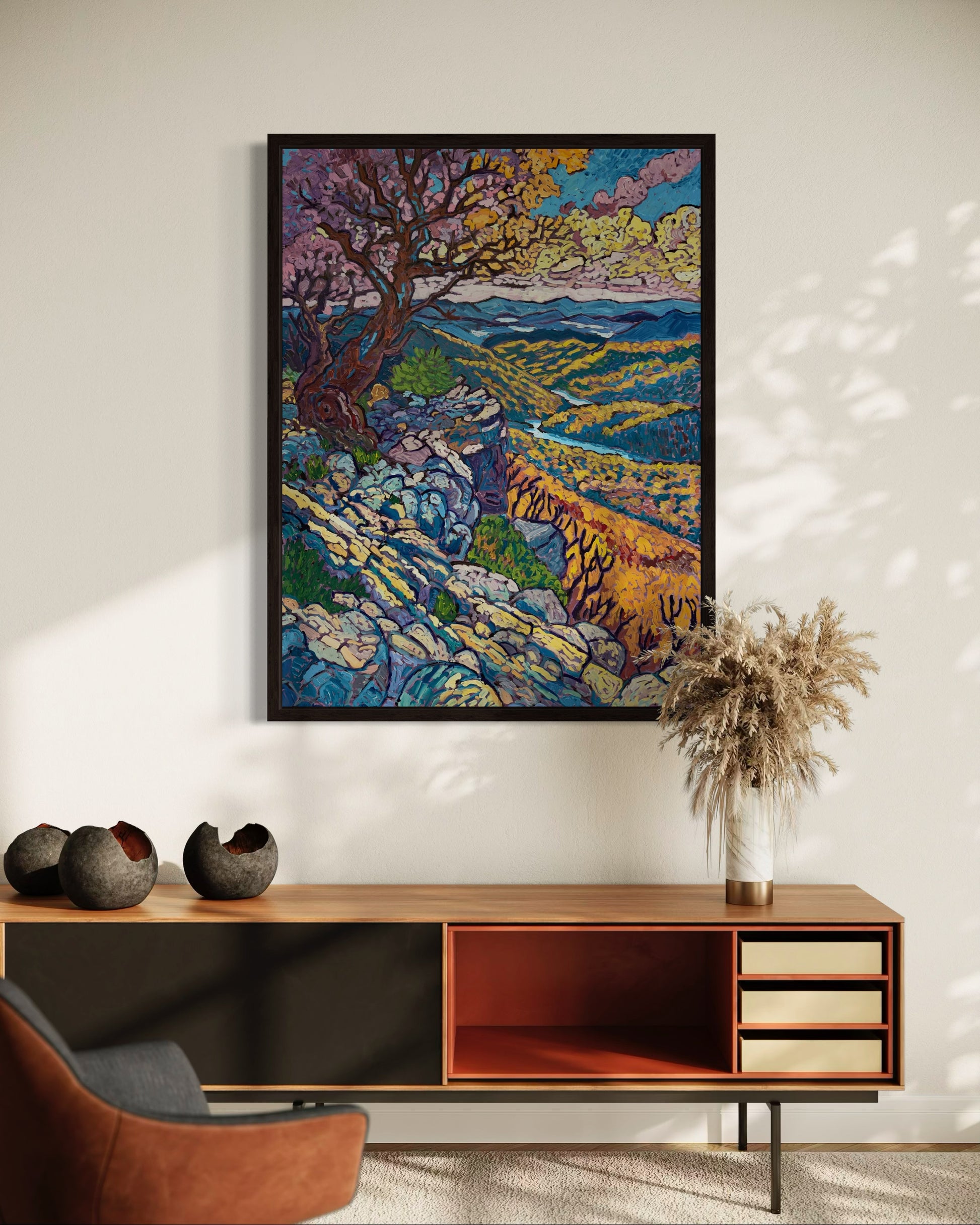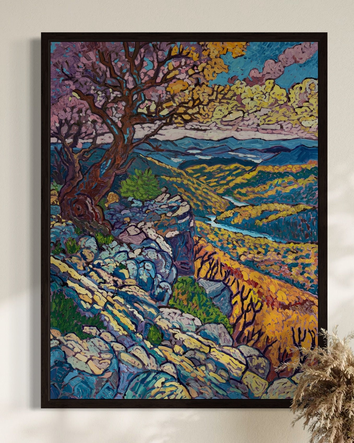 Breathe in the warmth of Shenandoah’s autumn landscape with this 30” x 40” impasto painting, where expressive brushstrokes capture the season’s vivid transformation. Swaths of crimson, gold, and burnished orange sweep across rolling hills and forested valleys, evoking the crisp air and gentle glow of Virginia’s Blue Ridge Mountains in the fall. Each layer of paint adds depth and movement, inviting you to wander through sunlit trails and mist-shrouded hollows.