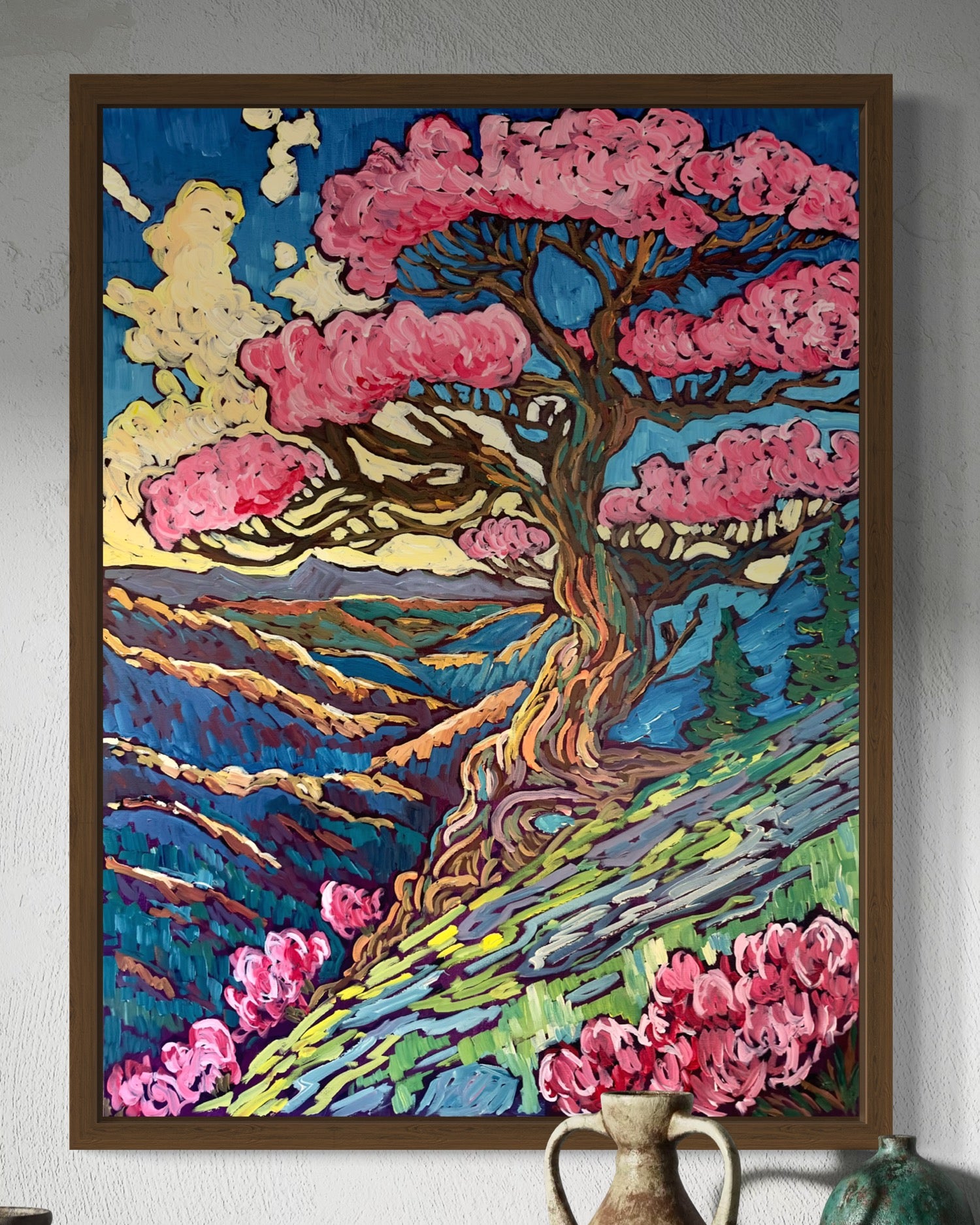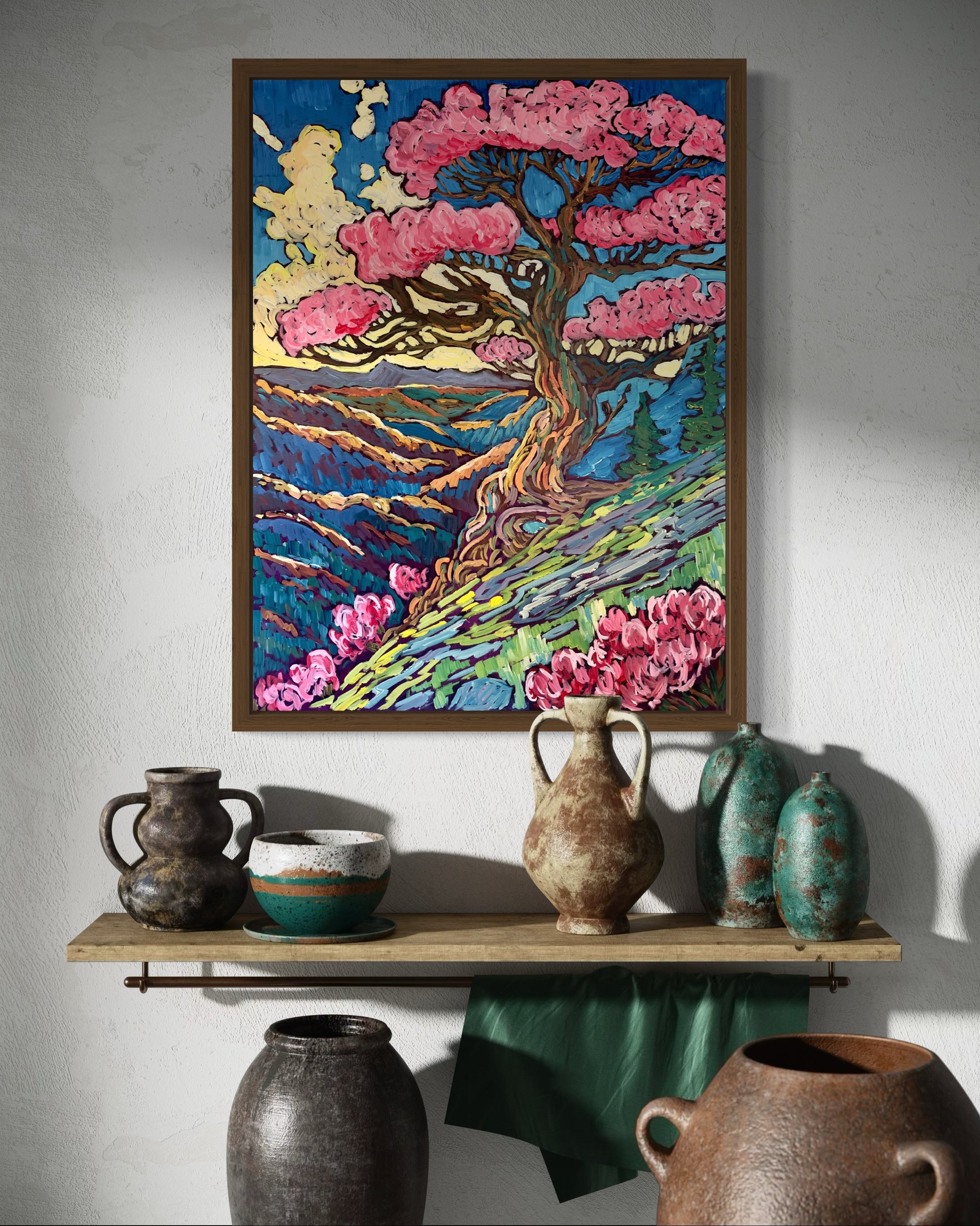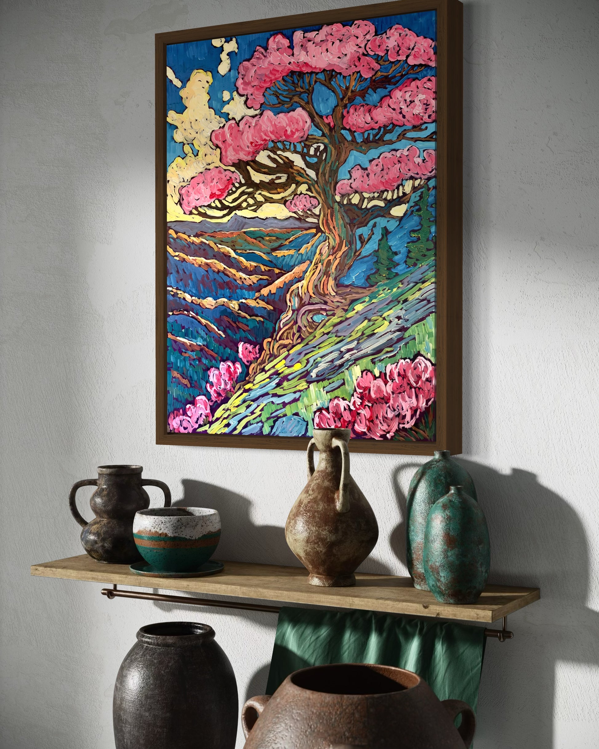 This 32"x24" painting captures the tranquil beauty of Smoky Mountain National Park, with a blooming rhododendron as its focal point. Bold, textured brushstrokes bring the vibrant pink and purple blooms to life, standing out against the soft, misty backdrop of the mountains.