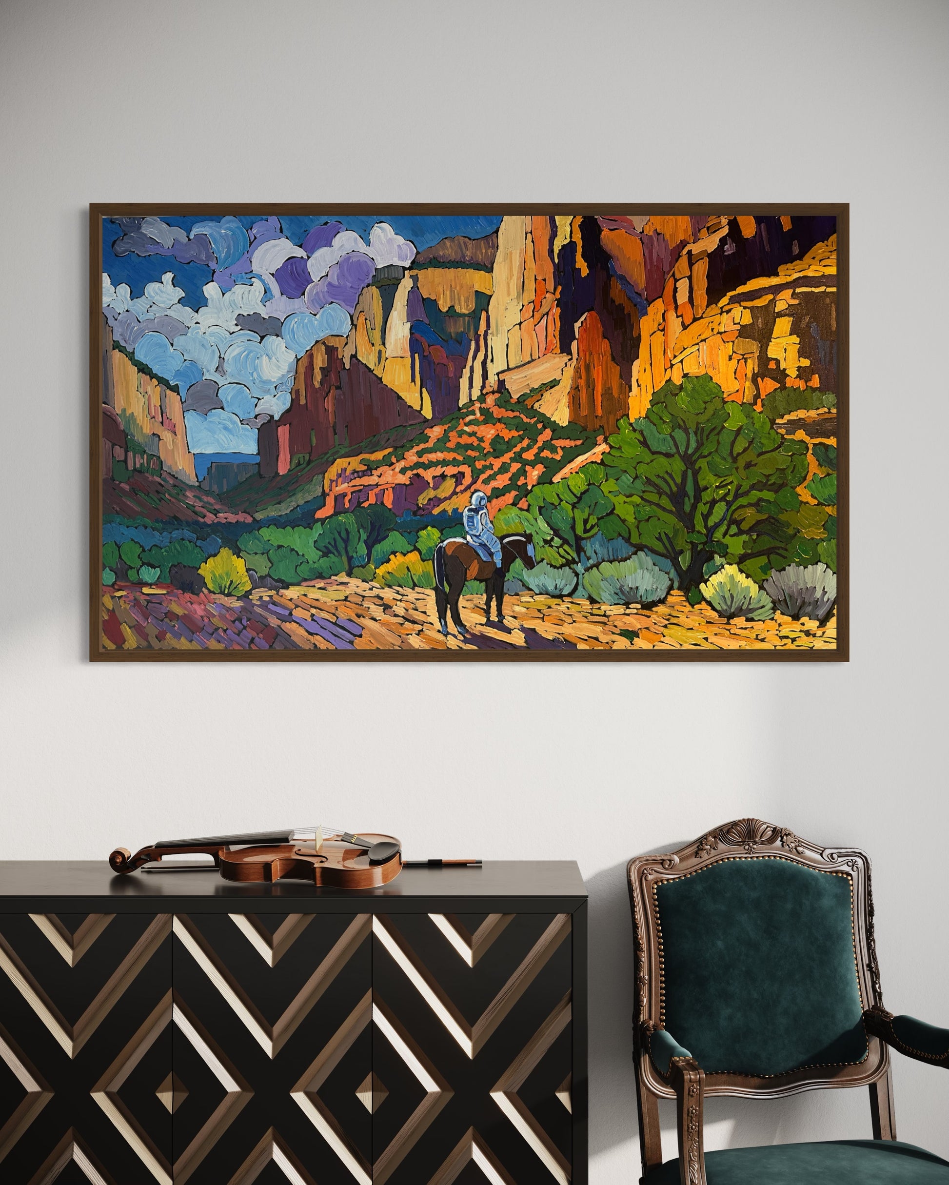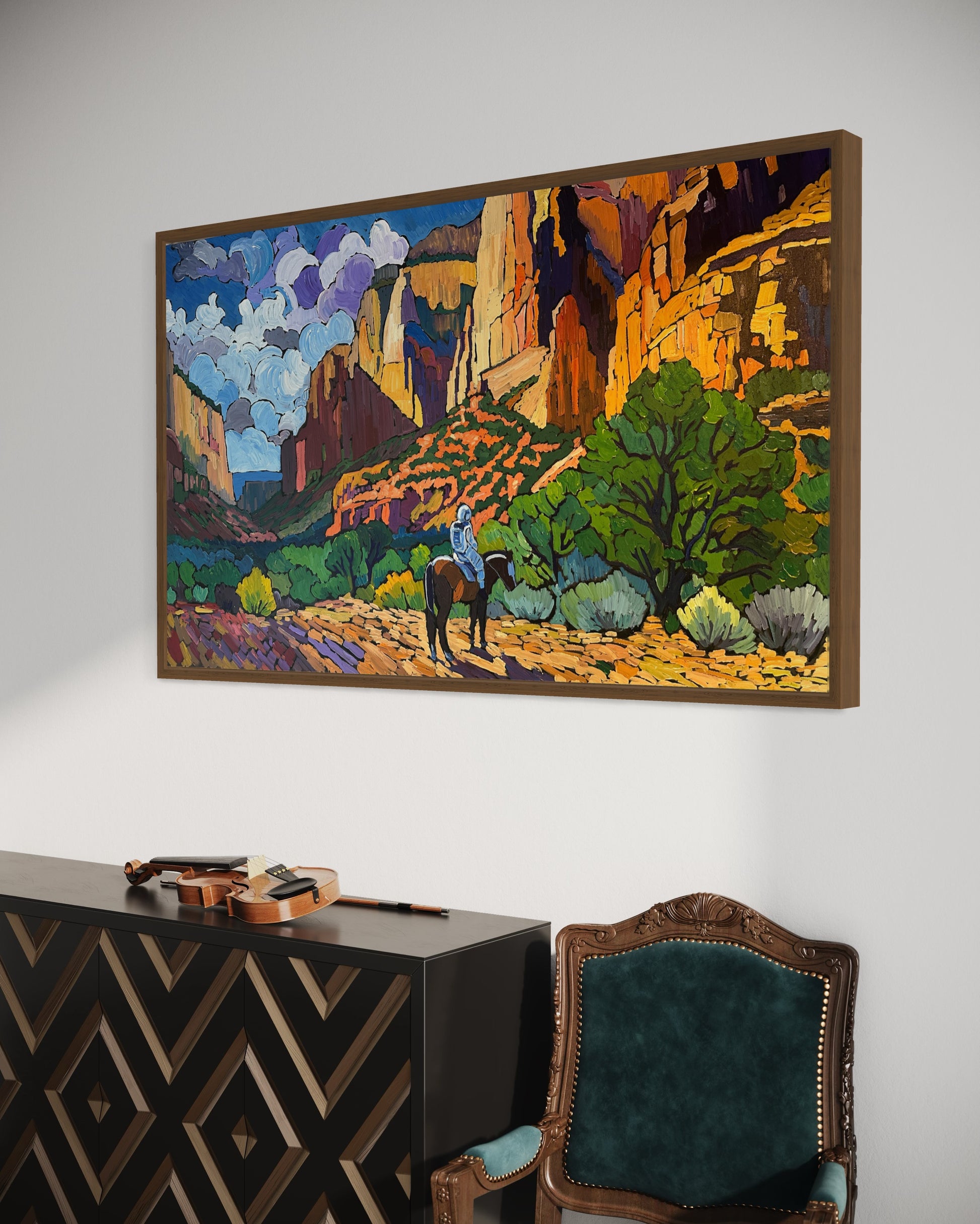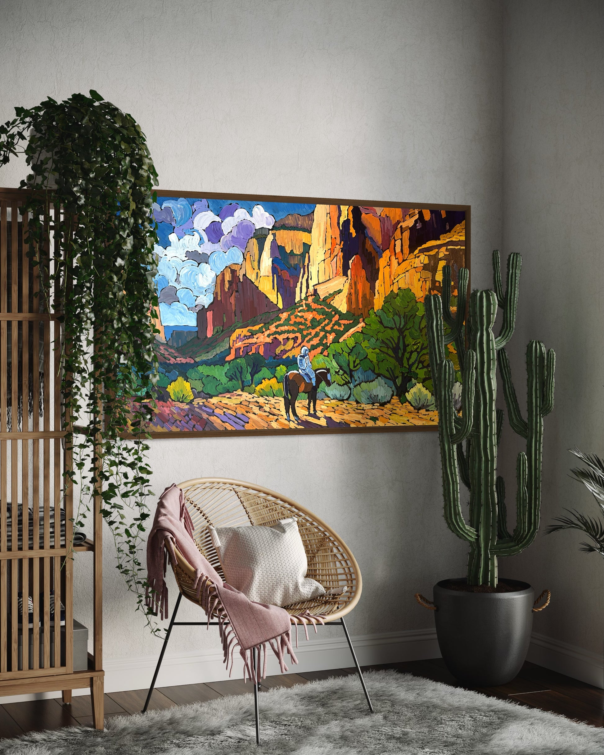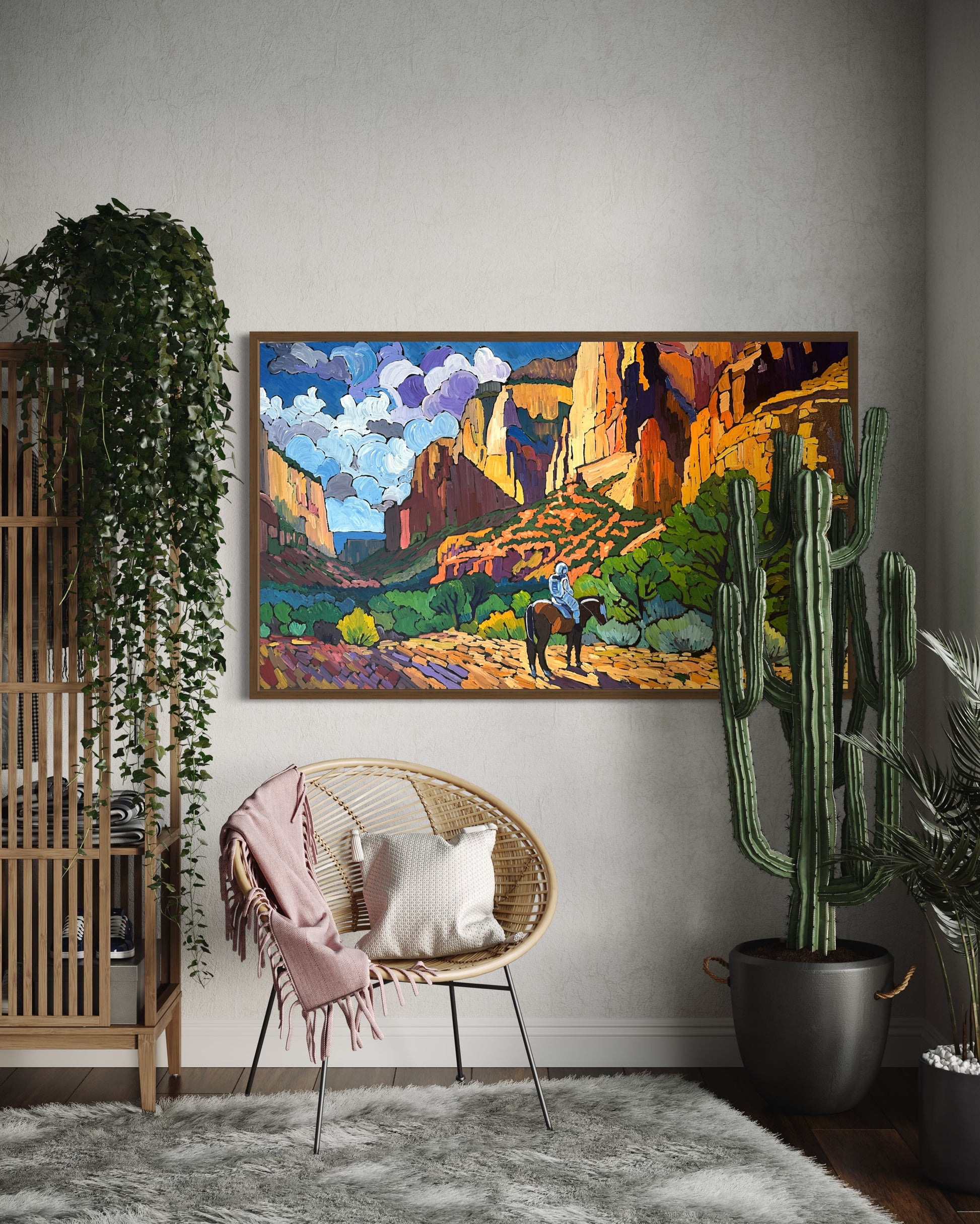 In this awe-inspiring artwork, an astronaut embarks on a captivating journey through the majestic beauty of Zion National Park, astride a horse against the backdrop of towering cliffs and rugged terrain. Rendered on a grand 36x60" canvas, the scene unfolds with vibrant colors and dynamic textures, capturing the essence of adventure and exploration. The astronaut's unconventional mode of transportation adds a surreal element to the natural landscape, blurring the boundaries between earthly wonders and the vast expanse of space. Whether displayed as the centerpiece of a room or elegantly framed, this piece invites viewers to contemplate the boundless possibilities of discovery. Please note, the painting is unframed, and all original prices include shipping costs. Securely shipped and insured via UPS for peace of mind.