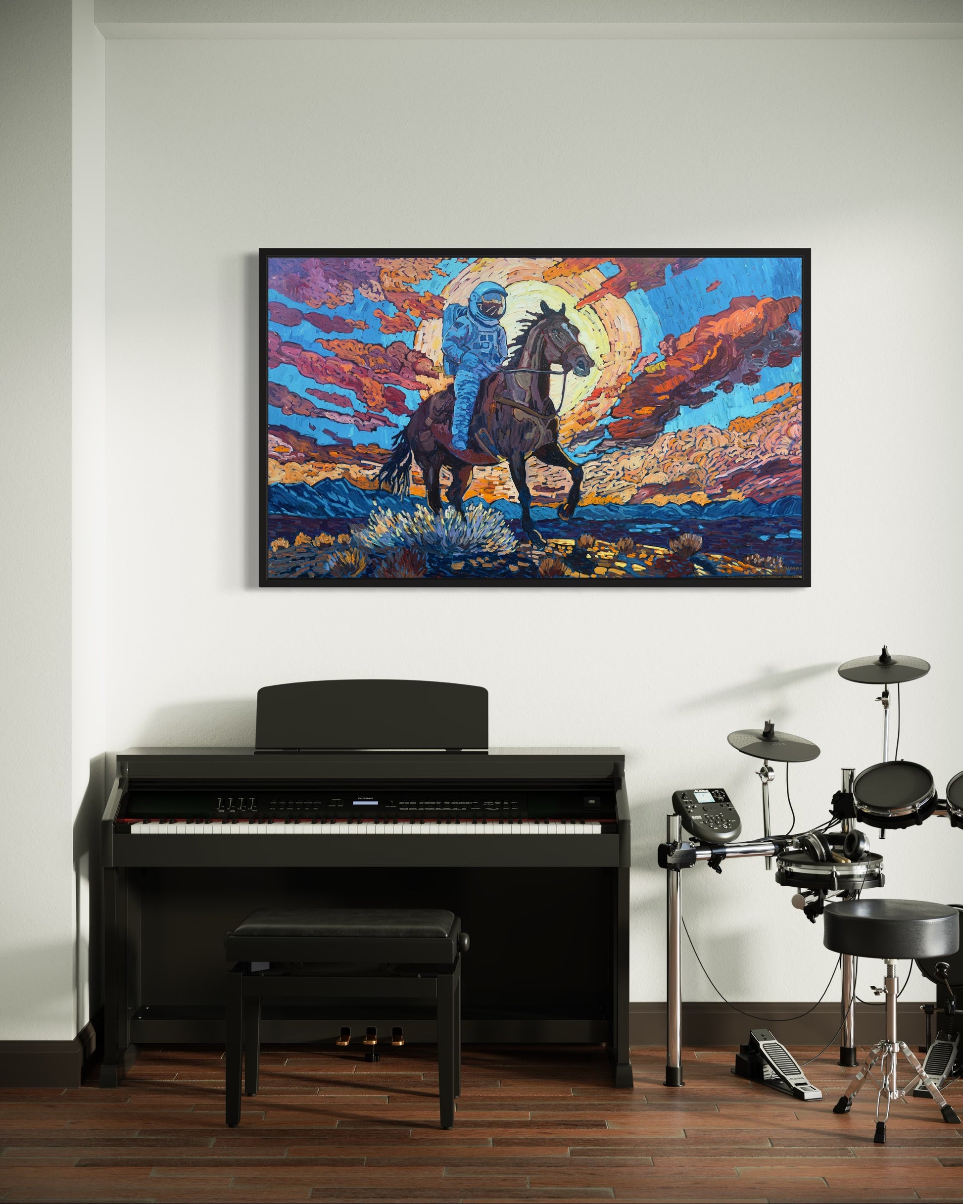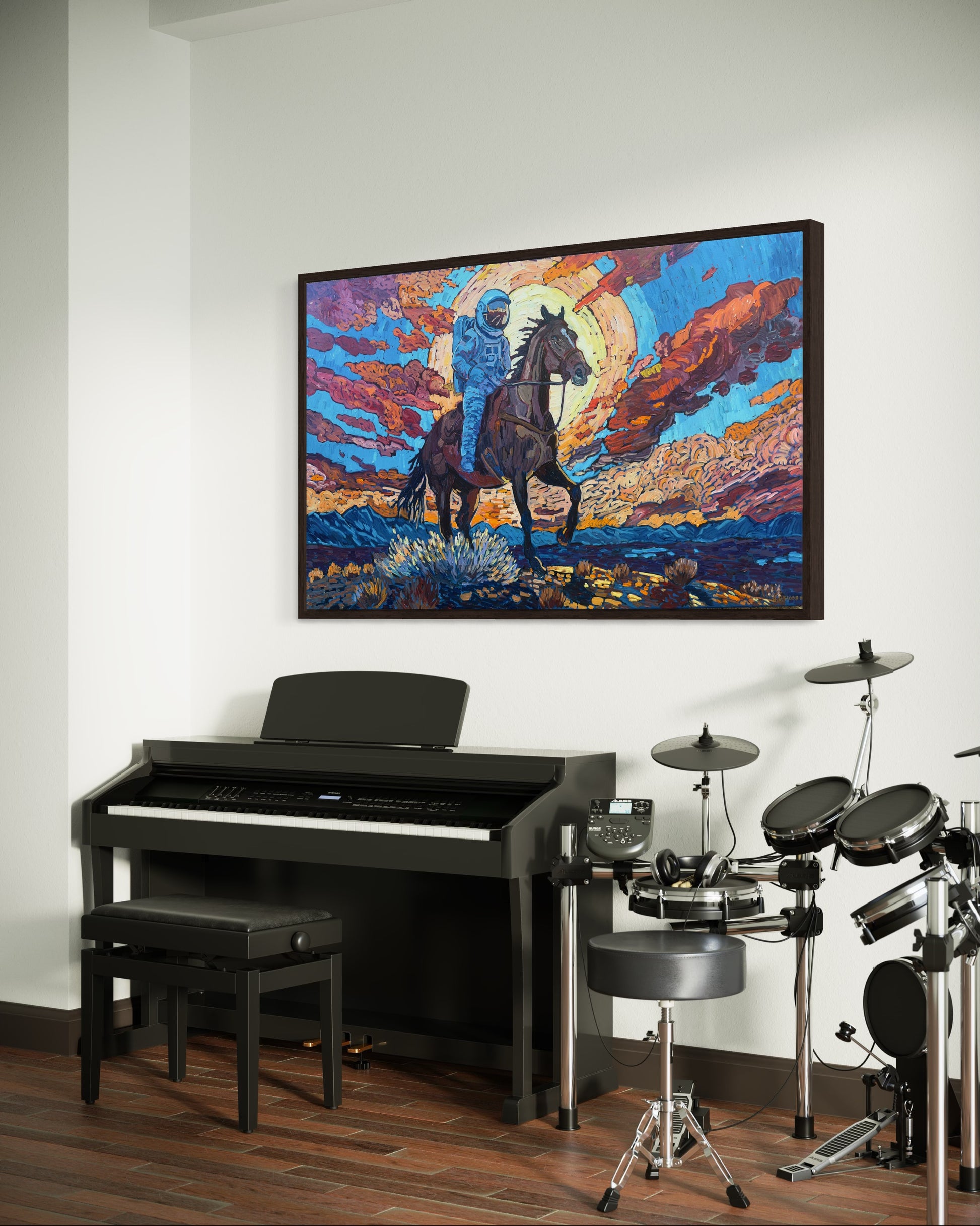 Whether displayed as the centerpiece of a living room or as a striking addition to a gallery wall, this painting of an astronaut riding horseback at sunset is sure to inspire awe and reflection, evoking the timeless beauty and spirit of adventure found in the natural world.