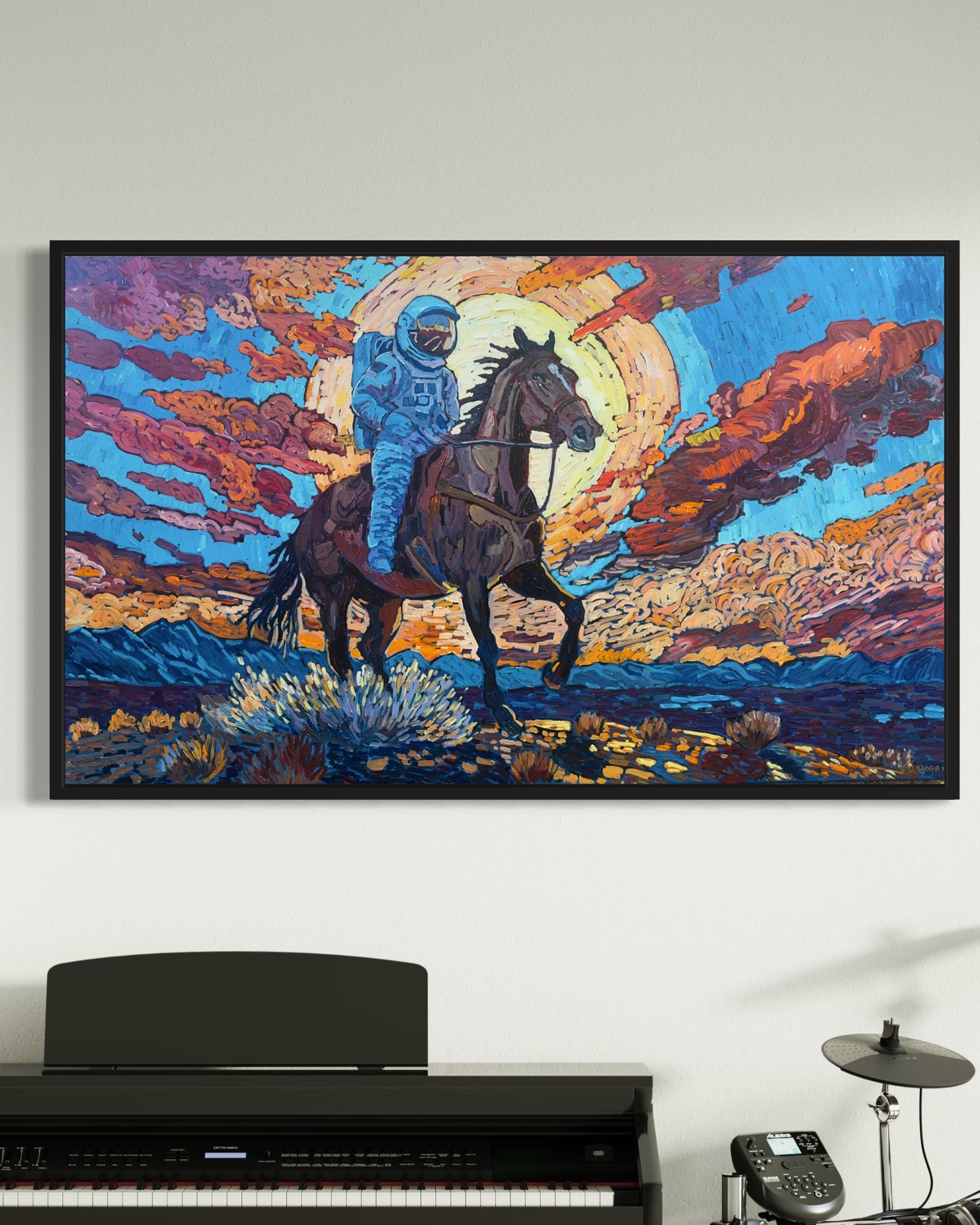 This captivating painting features an astronaut riding horseback through the breathtaking landscape of the American West at sunset. Crafted on a 36"x60" canvas, the artwork vividly captures the grandeur and surreal beauty of the scene.