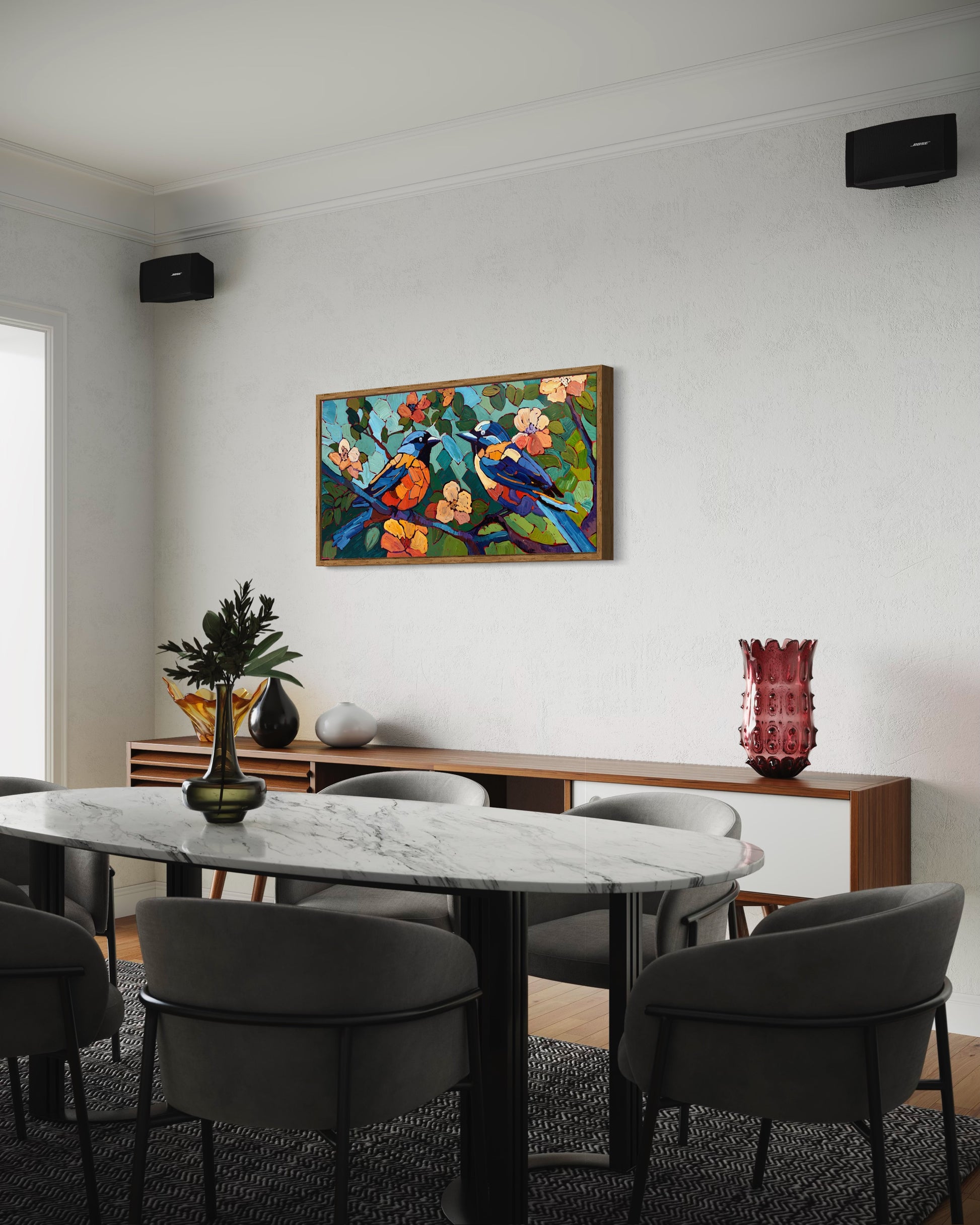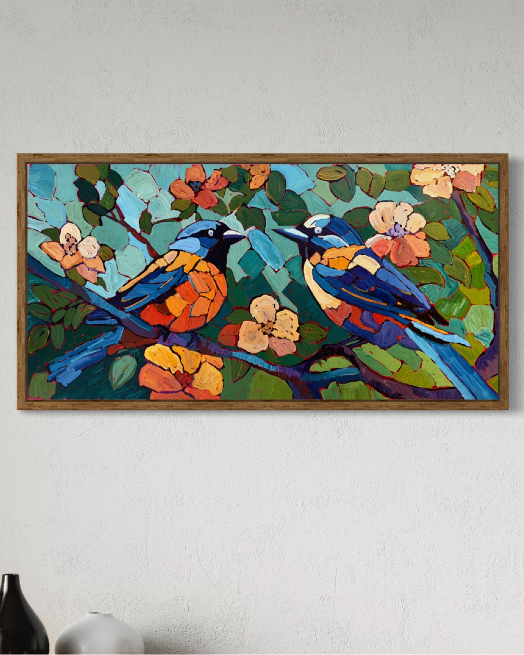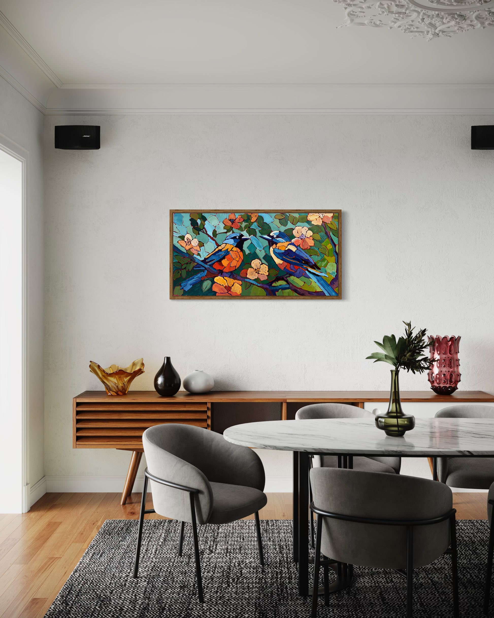 Whether displayed as the focal point of a living room or as a vibrant addition to a gallery wall, this painting of two birds in a bush is sure to delight and inspire viewers, evoking a sense of joy, wonder, and connection to the natural world.