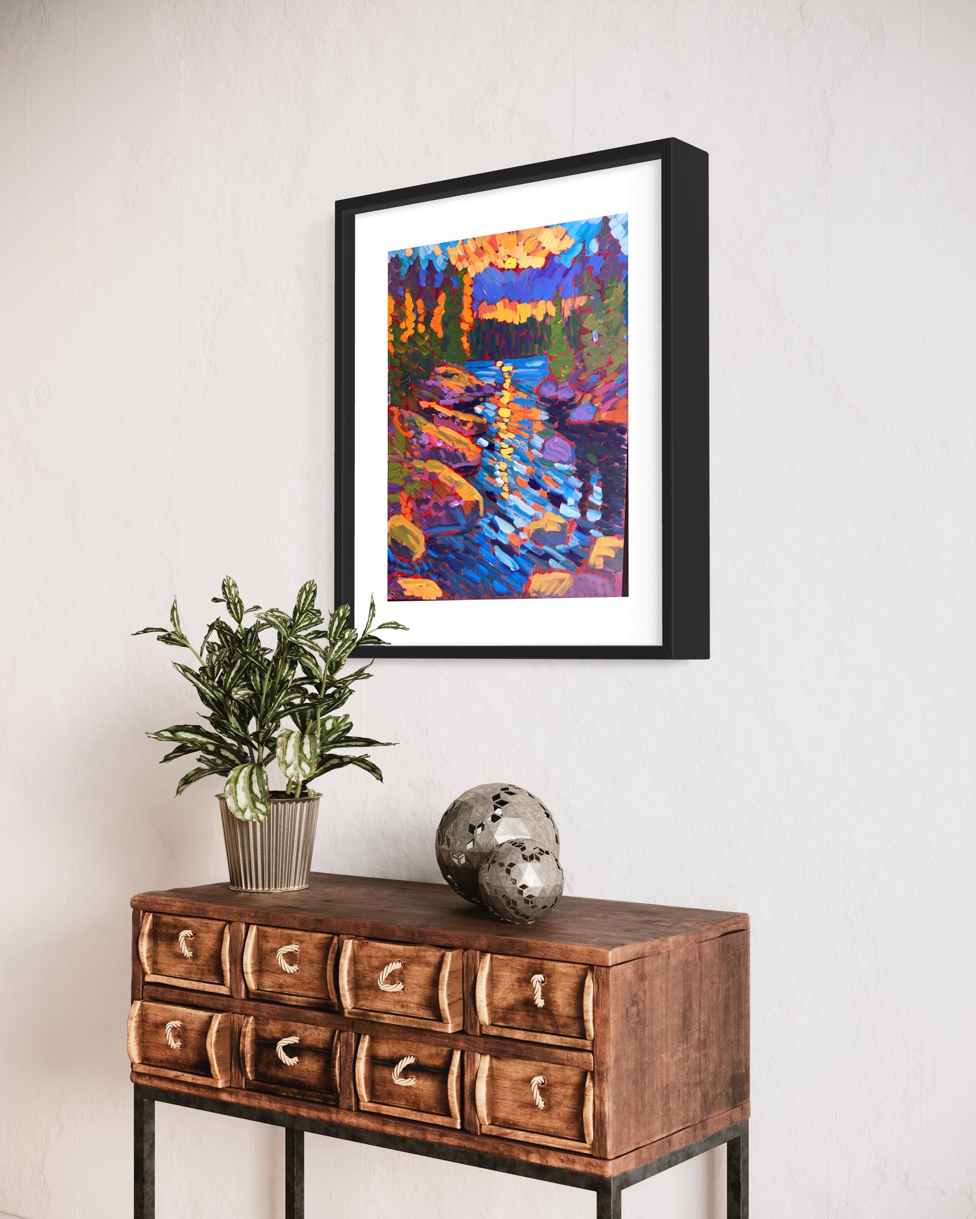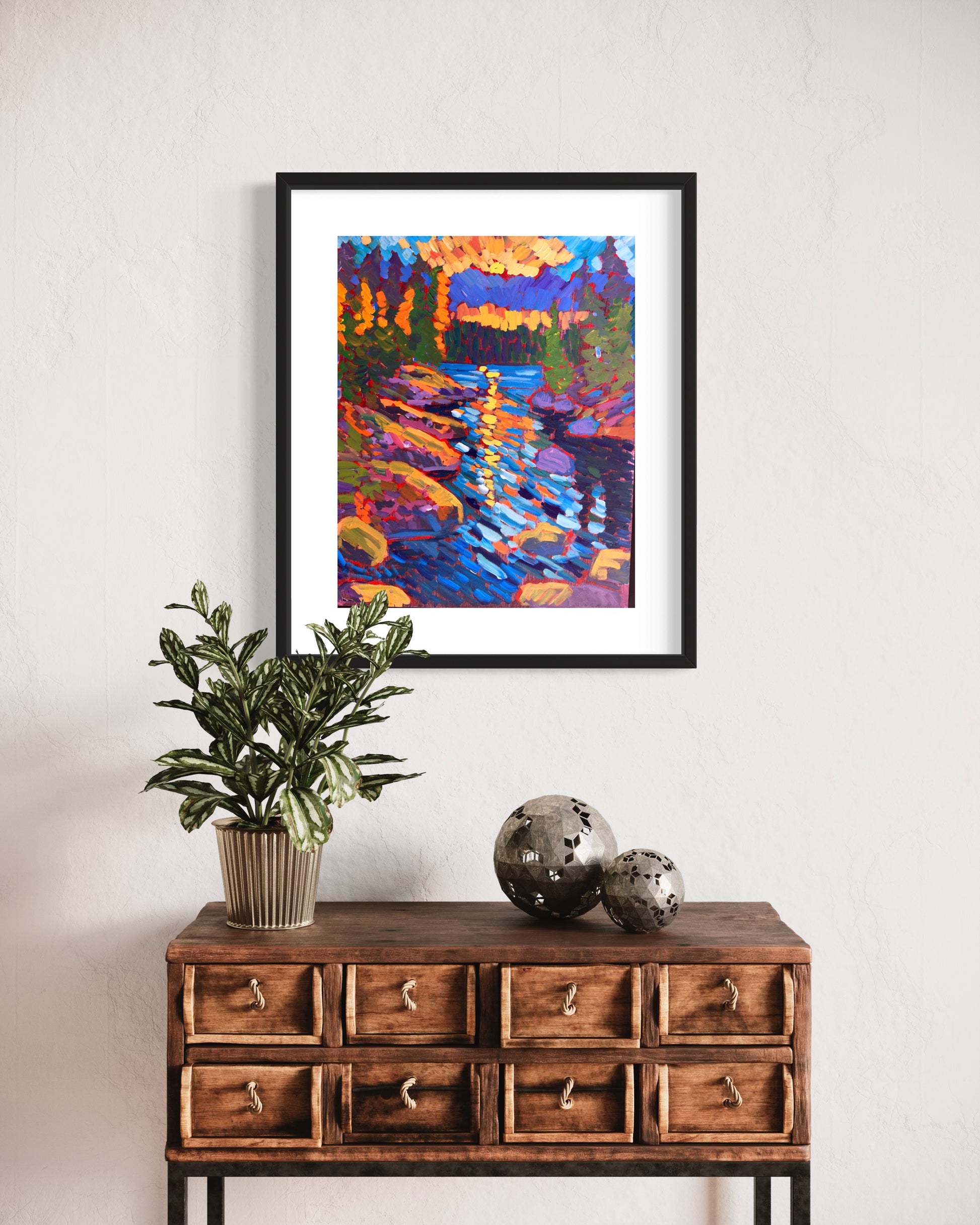 Indulge in the serene beauty of a 16x20" canvas board painting that captures the breathtaking scene of a sunset cascading over a tranquil lake. Created with heavy body acrylics in an impasto style, this artwork vividly portrays the fiery hues of a sunset reflecting off the water, while a rocky shoreline adorned in the rich palette of fall colors frames the picturesque view.