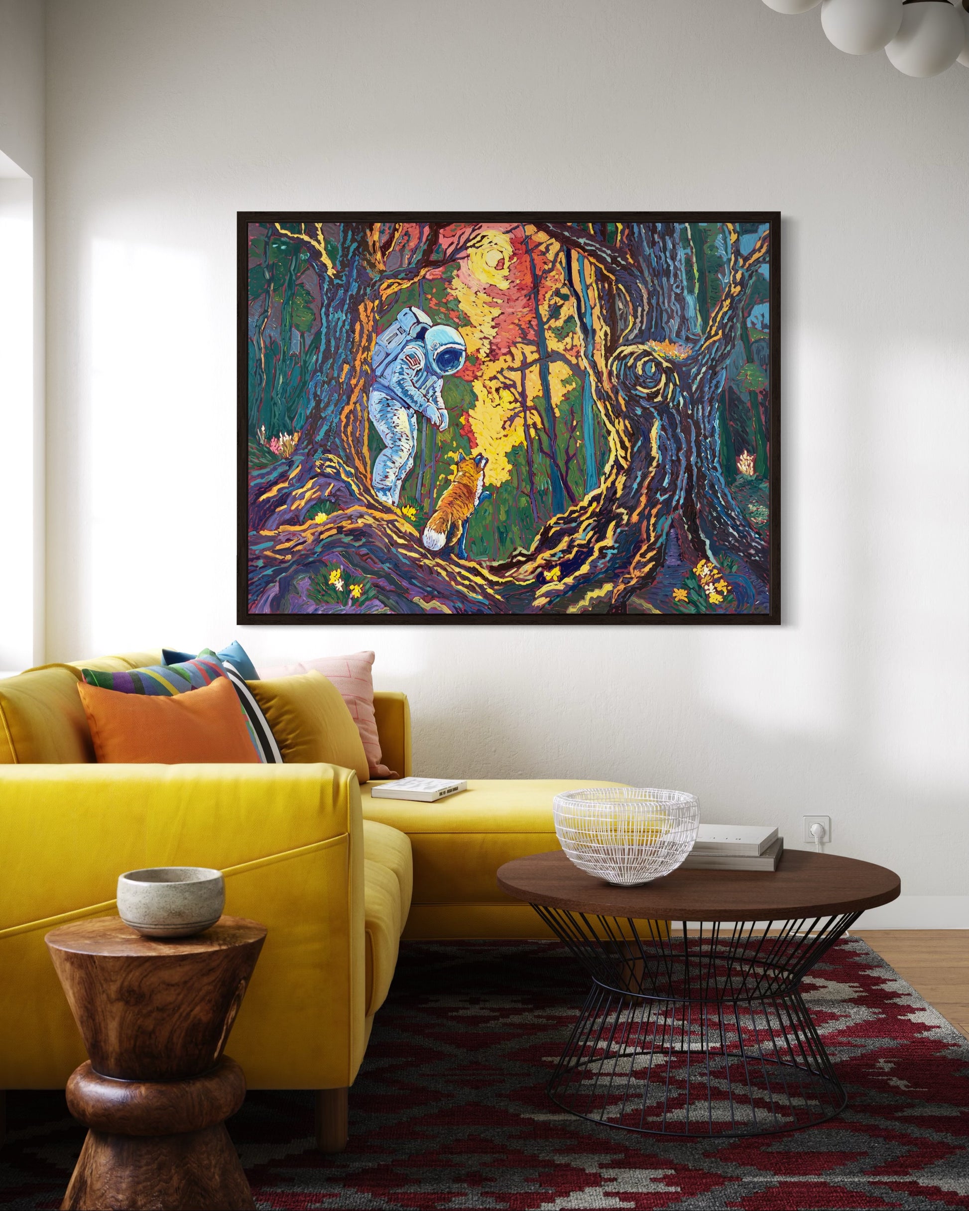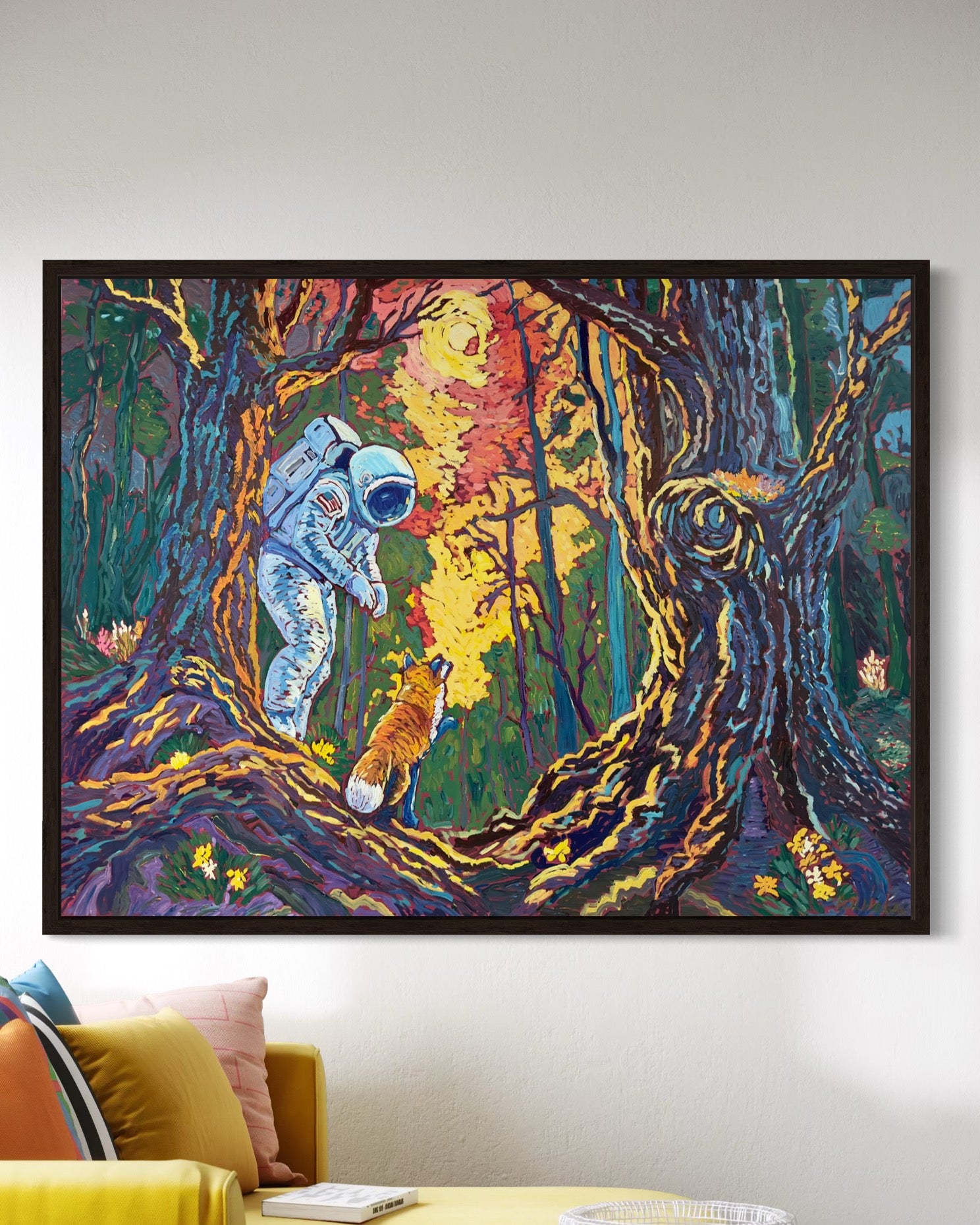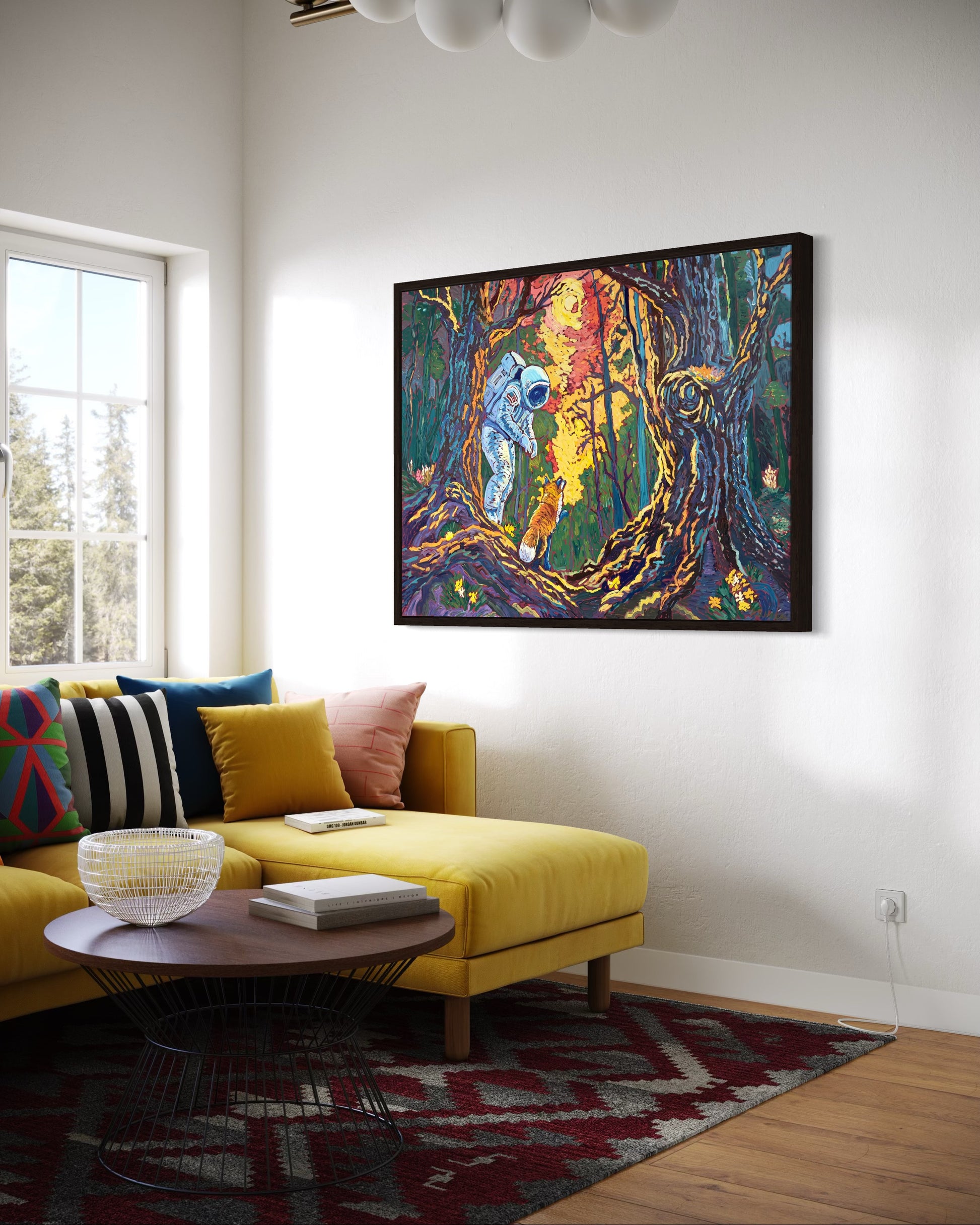 Lost in the vast unknown, an astronaut stands at the edge of a dense forest, bathed in the glow of an unseen light. Beside them, a fox—wild and knowing—turns to lead the way forward. “The Way Home”is a story of discovery, guidance, and the quiet wisdom found in nature.