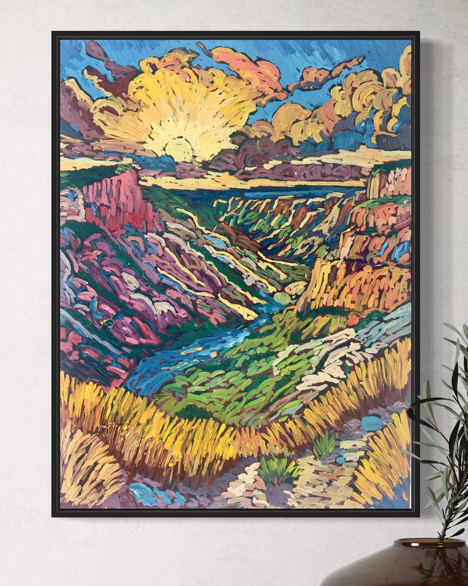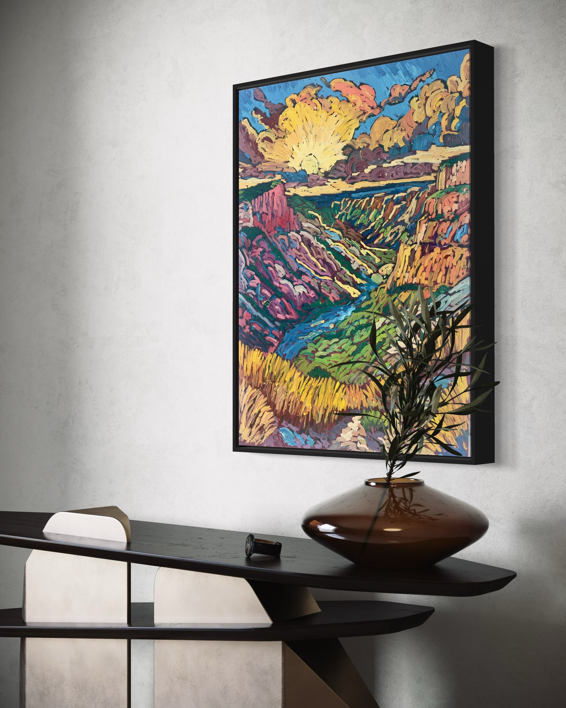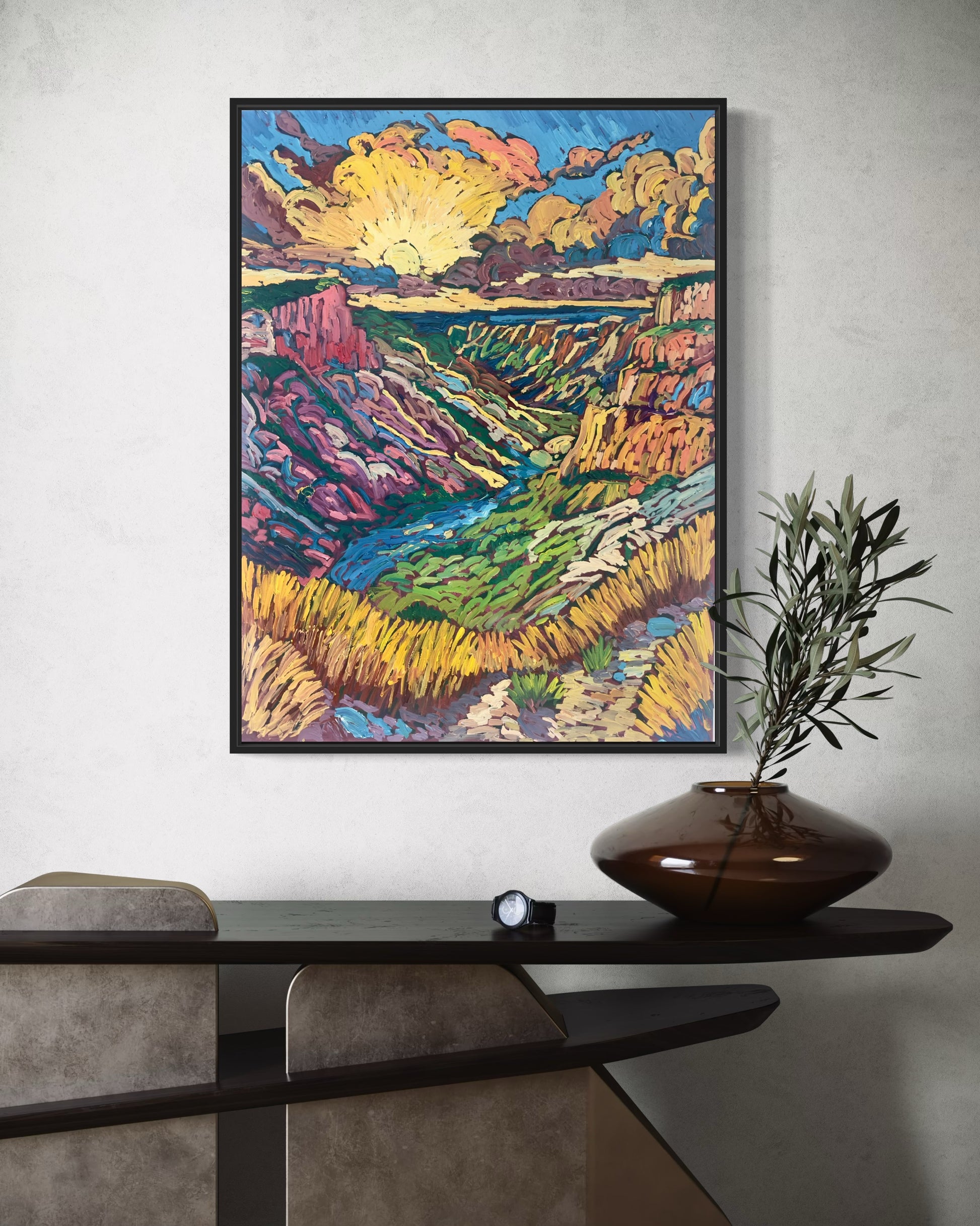 Immerse yourself in the wild, untamed beauty of Theodore Roosevelt National Park with this stunning 24"x32" impasto painting. Each textured brushstroke captures the rugged terrain, rolling hills, and expansive sky that define this iconic landscape. Rendered in heavy body acrylic, the painting's vibrant colors and rich textures evoke the timeless majesty of nature. Whether you’re a lover of the outdoors or a fan of American history, this piece serves as a bold reminder of the power and serenity found in the natural world. Perfect for any space that seeks to connect with the wild and free spirit of the American West.