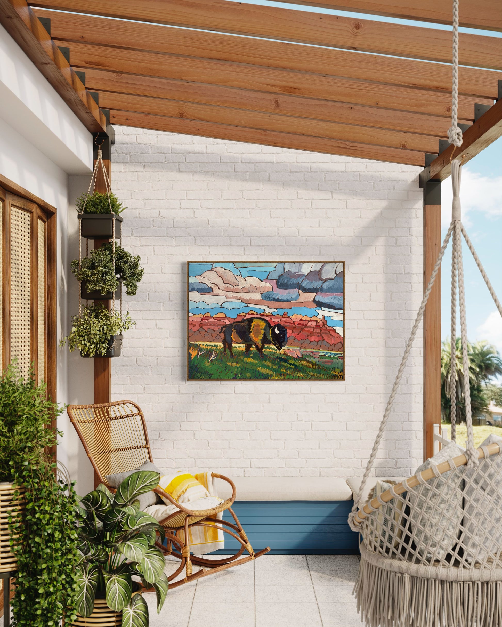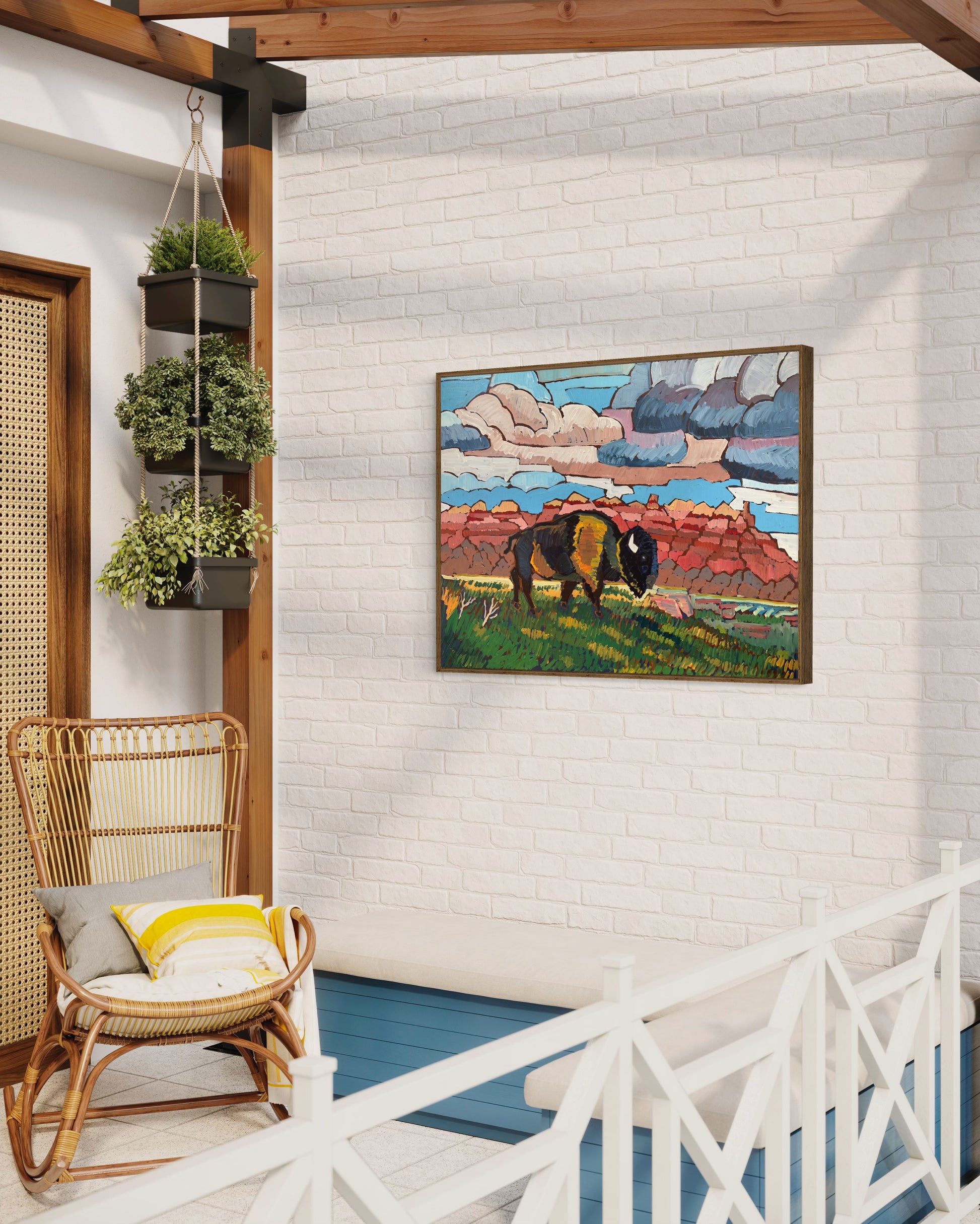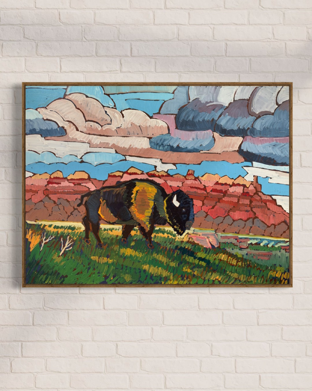 Welcome to the captivating world of 'Badlands National park,' where the rugged beauty serves as the backdrop to a magnificent bison. In this painting, I've captured the raw essence of the wild, with the bison's commanding presence harmonizing seamlessly with the dramatic landscape. The textured brushstrokes bring the bison's power and resilience to life, while the unique formations of the Badlands create a mesmerizing contrast. Immerse yourself in the untamed allure of 'Badlands National Park,' where the spirit of the bison and the majestic landscape unite to create a scene of timeless wonder.