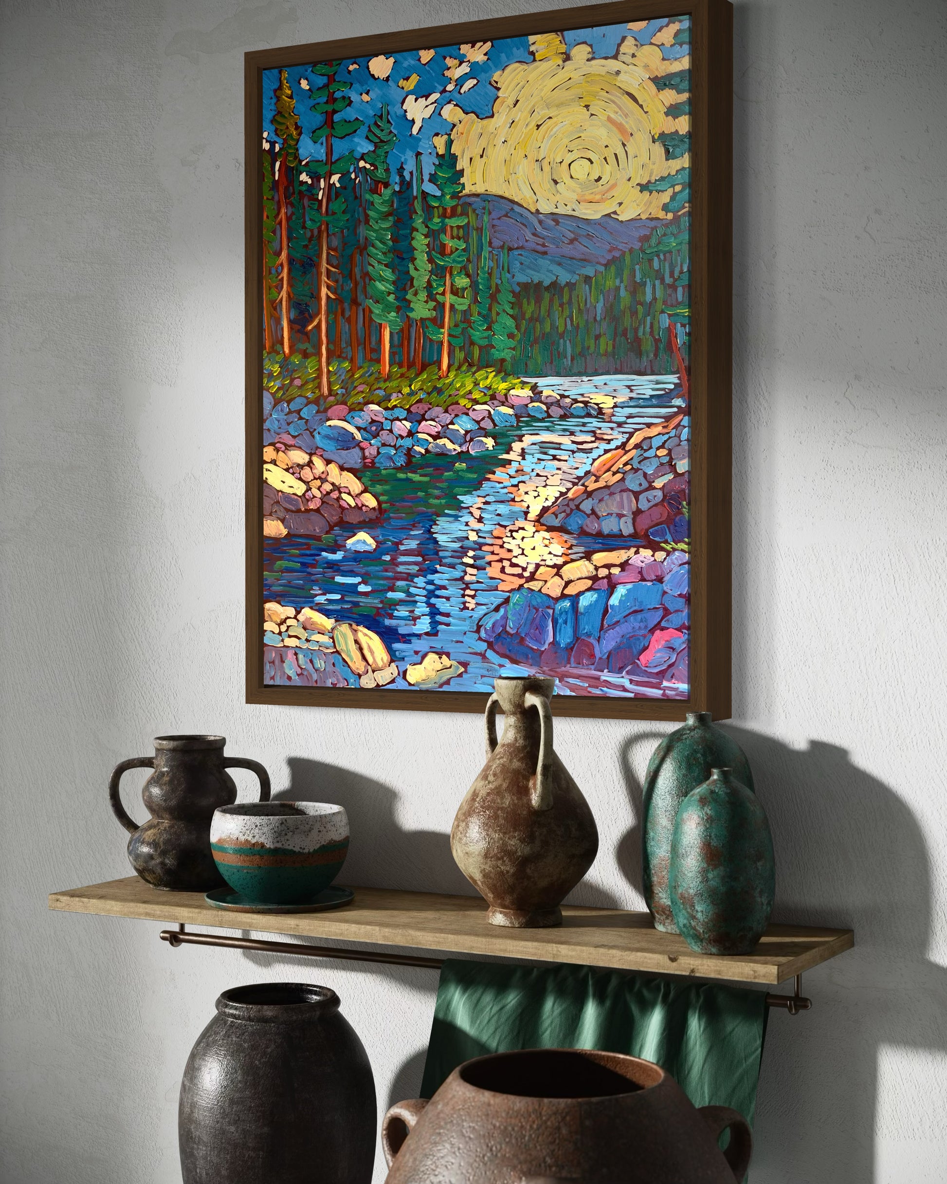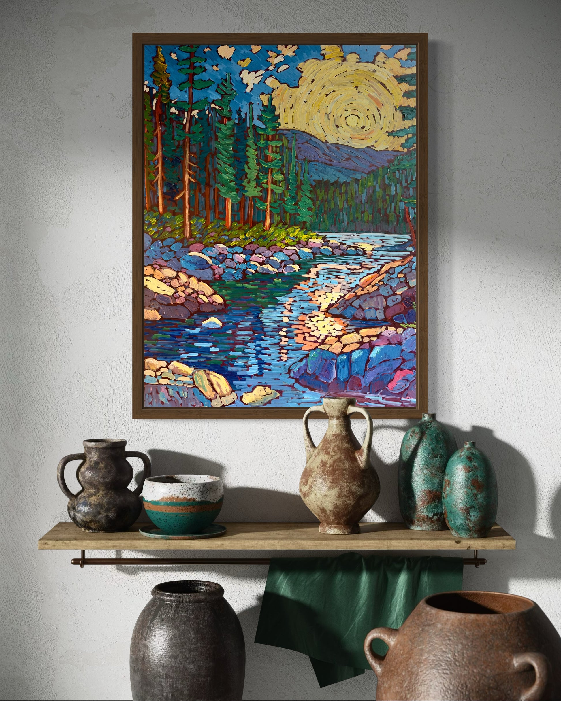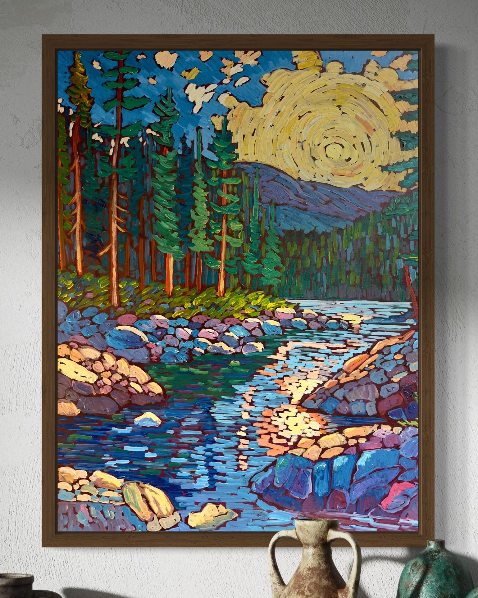 This 32"x24" painting captures the serene beauty of Voyageurs National Park, using bold, textured brushstrokes to evoke its expansive waterways and untouched wilderness. Calm waters reflect the sky, framed by lush pine forests and rocky shorelines, while distant islands dot the horizon.