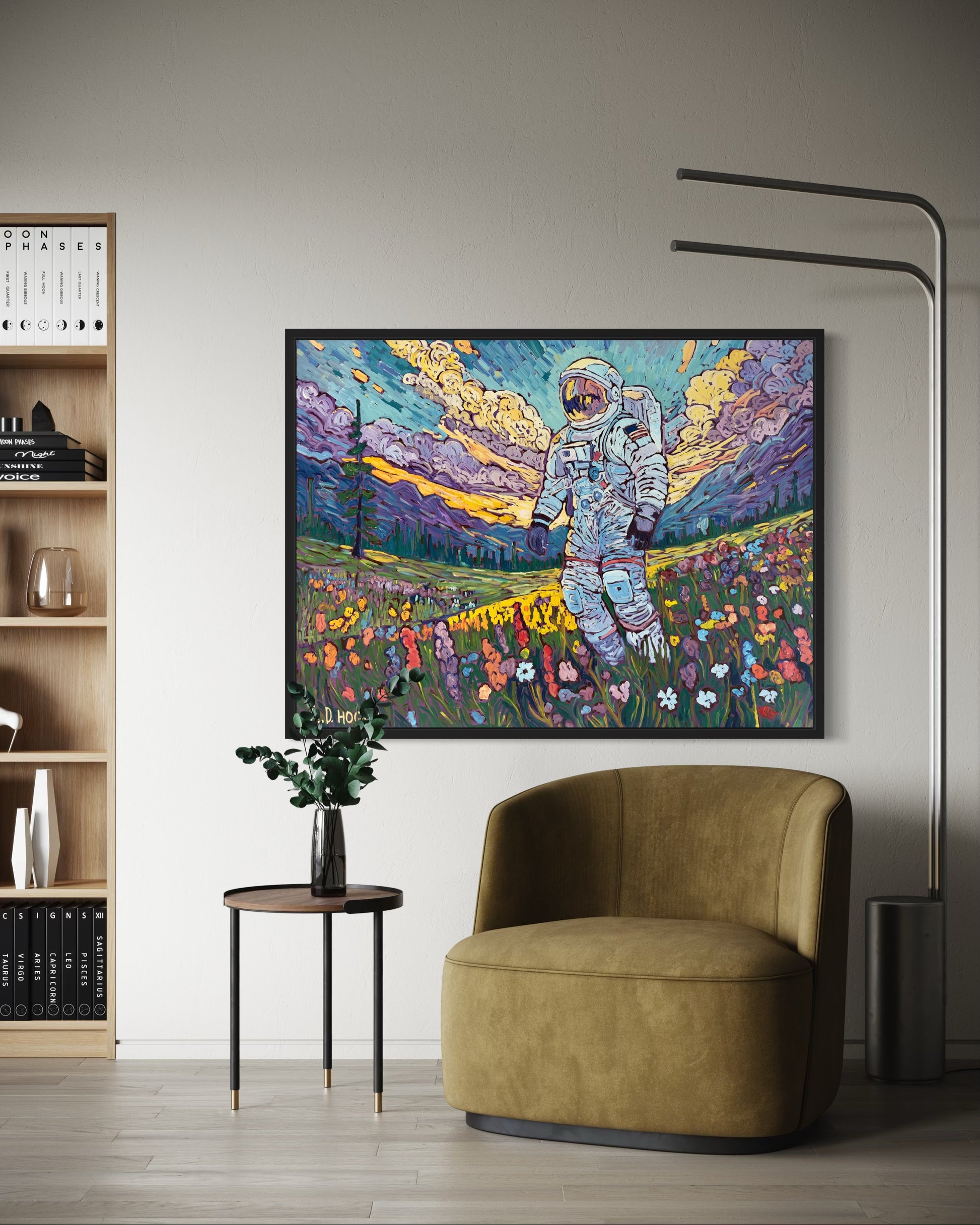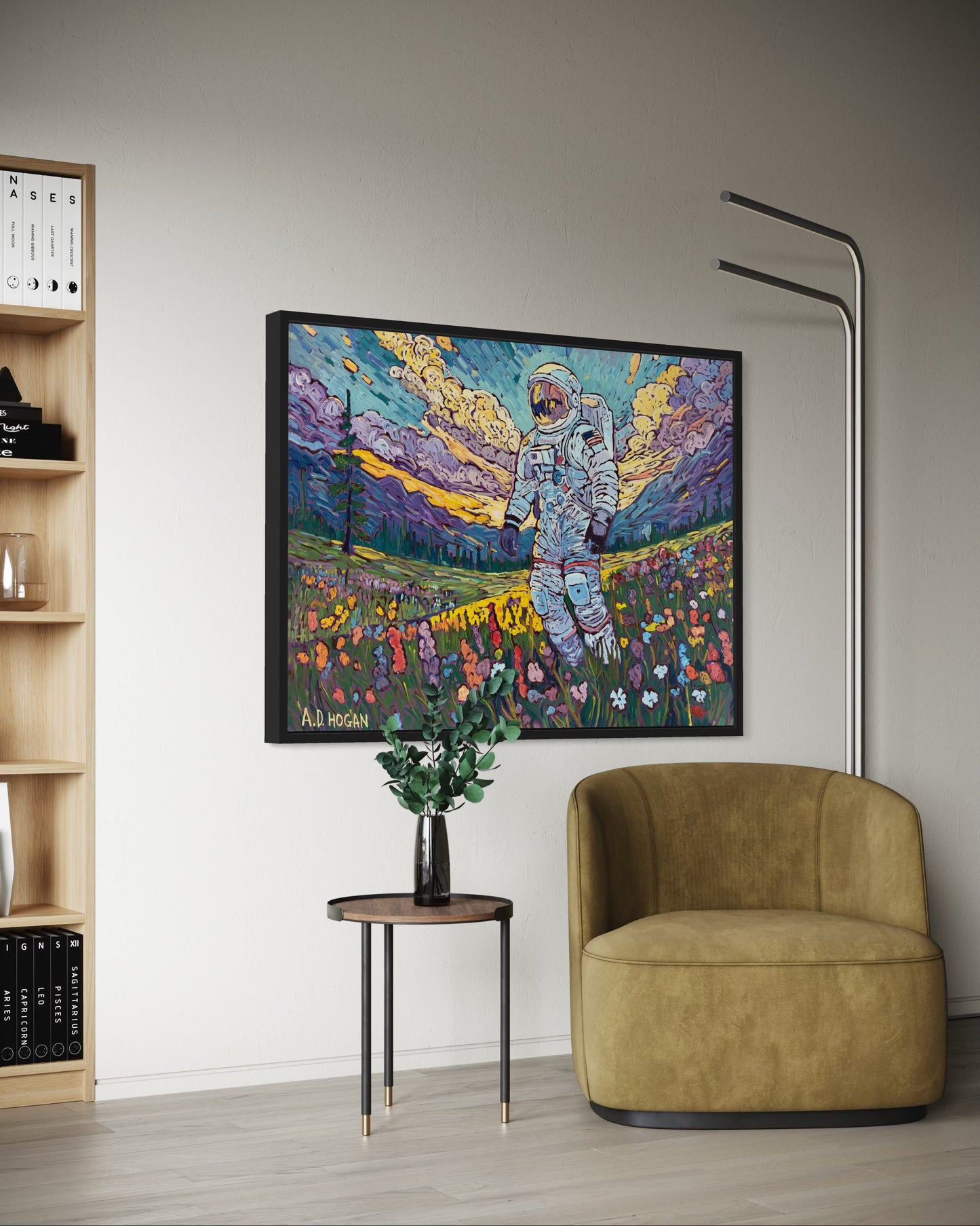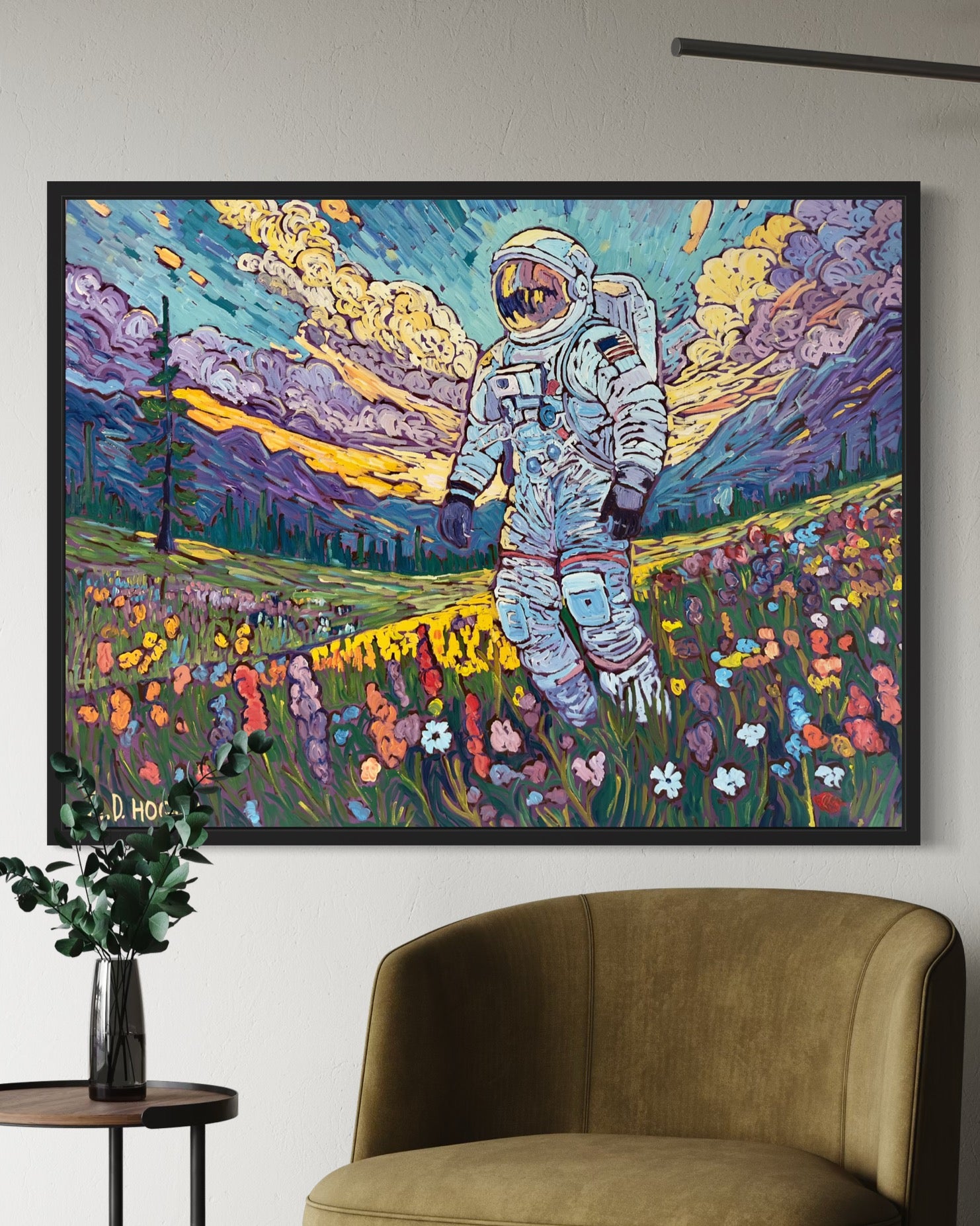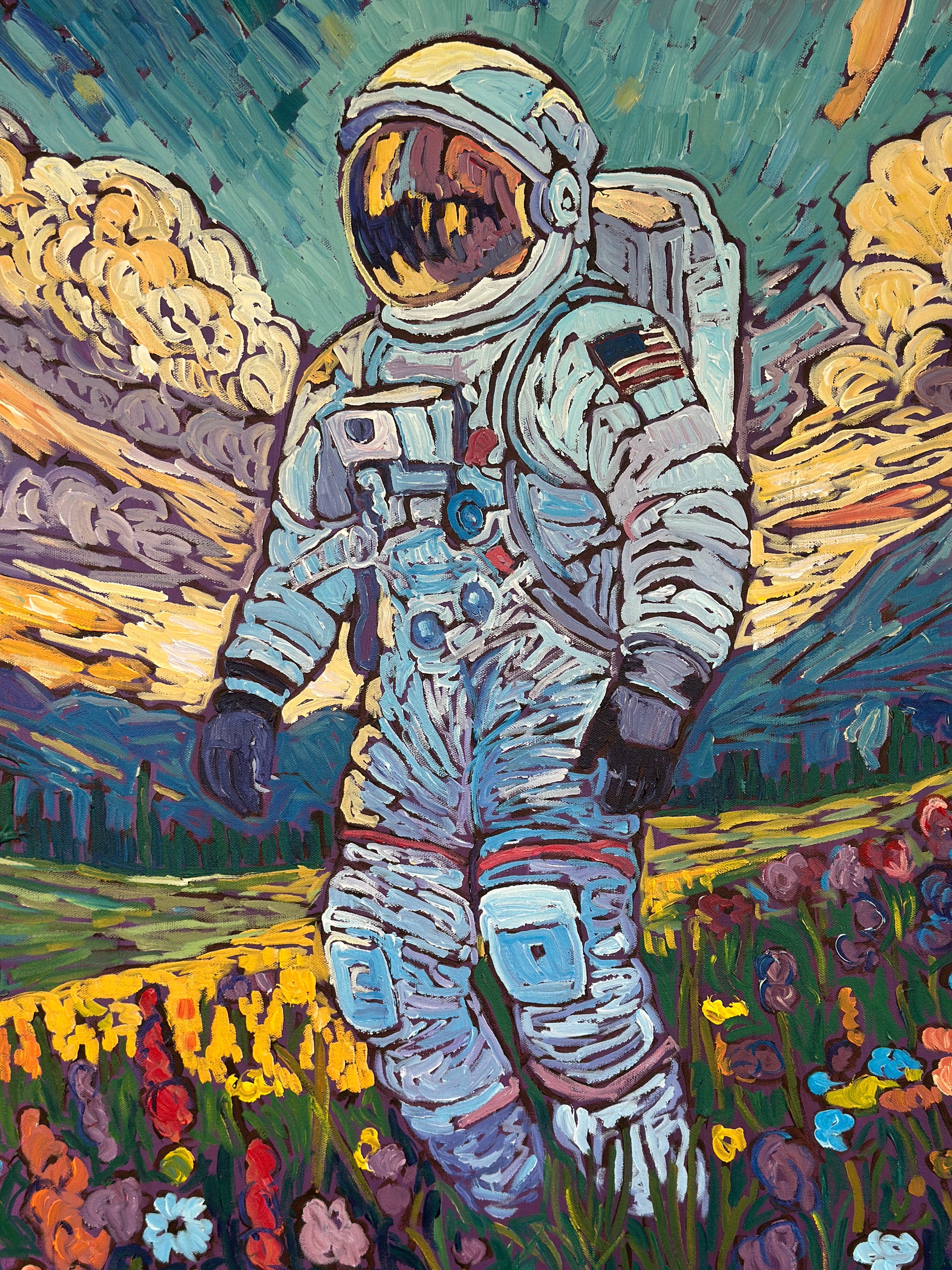 Astronaut Alice walked slowly, her boots brushing against the tops of wildflowers that danced in the breeze. The field stretched far in every direction—golden yellows, deep purples, fiery oranges, soft blues—like the sky had spilled itself onto the earth.