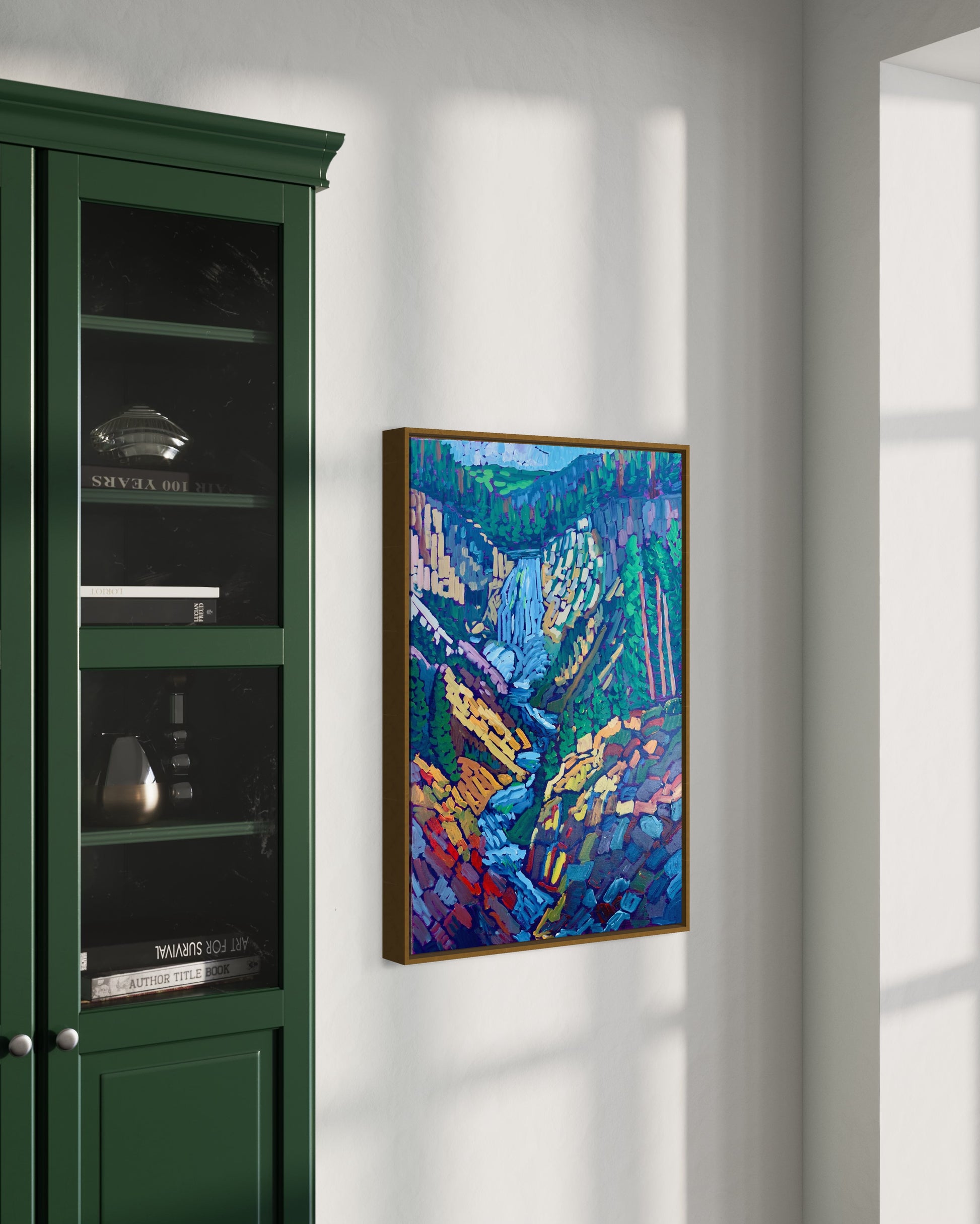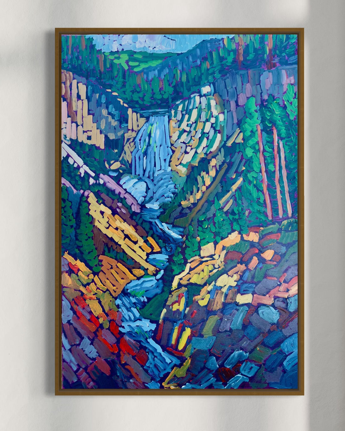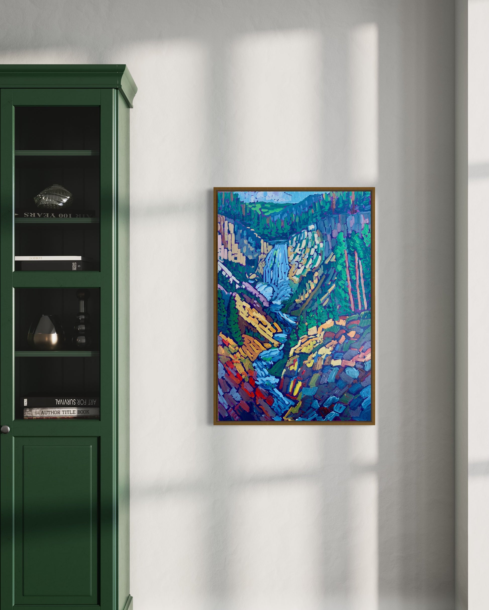 In this impasto-style painting of Yellowstone National Park's lower falls, you'll find a captivating portrayal of the park's natural grandeur. The thick, textured brushstrokes bring the waterfall to life, and the vibrant colors of the surroundings make it a stunning addition to any art collection. This piece is a testament to the beauty of Yellowstone and would be a unique, awe-inspiring addition to your space.
