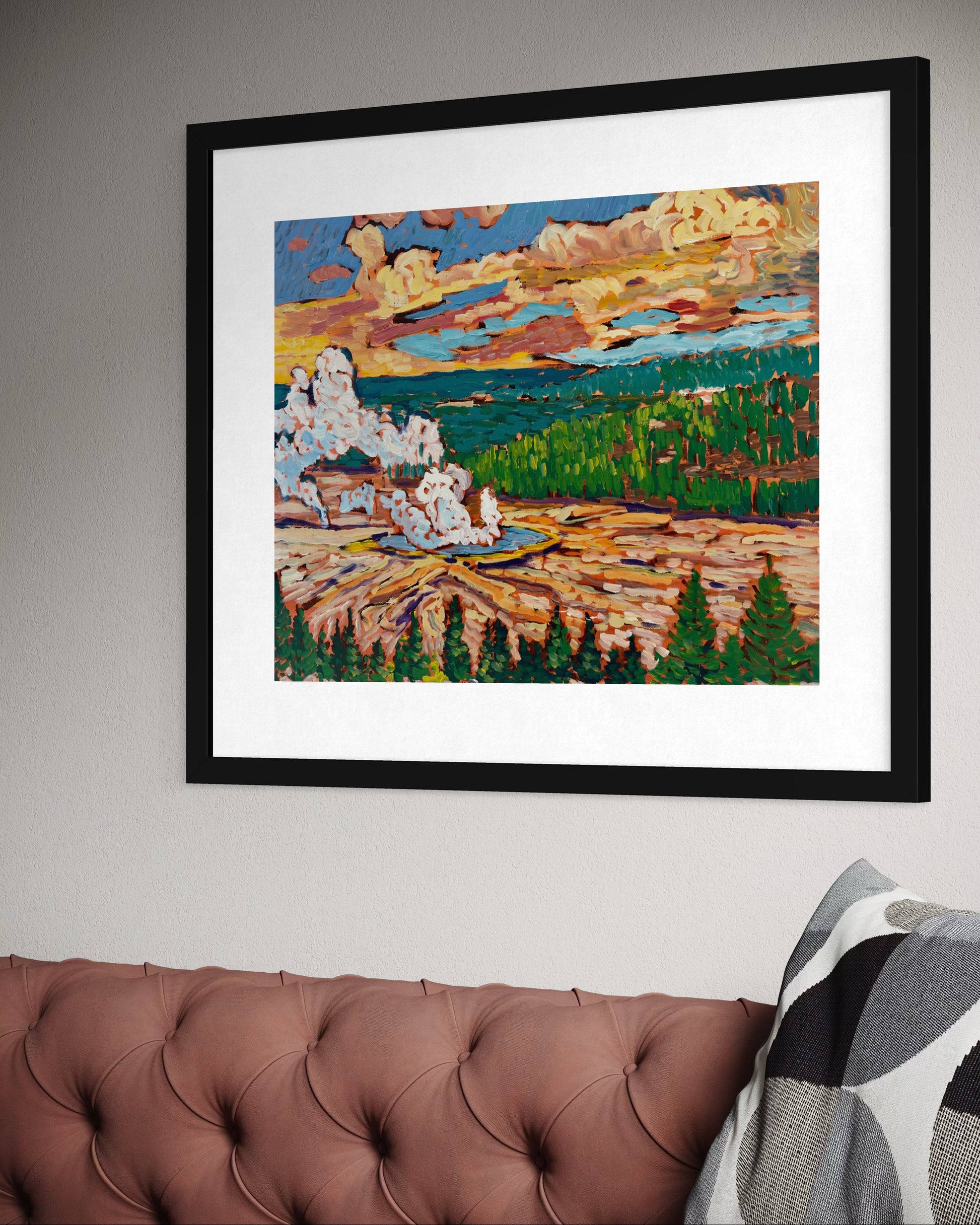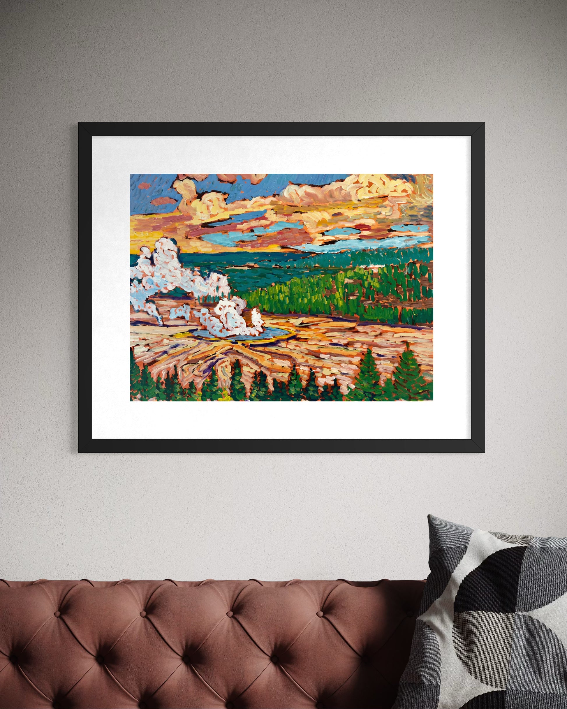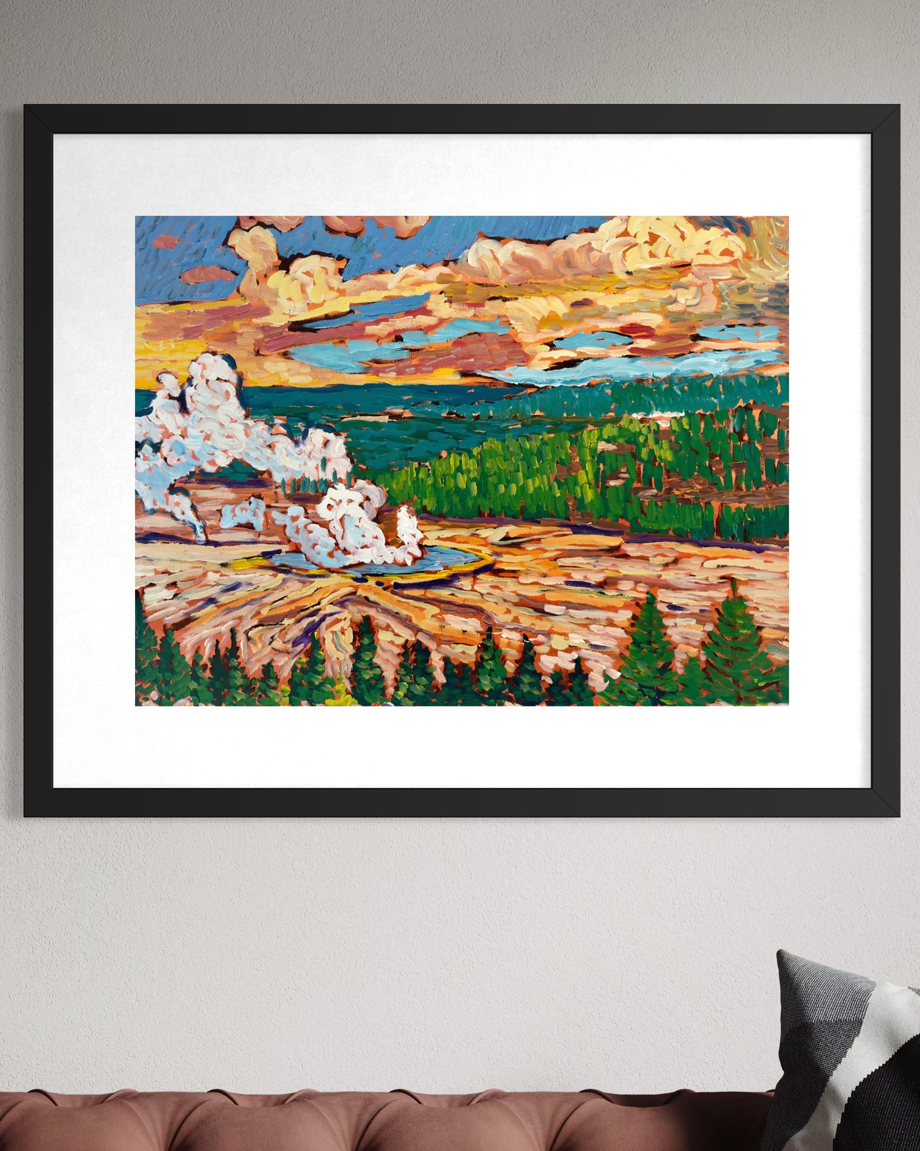 The painting reflects Yellowstone’s living heart—unstable, powerful, and endlessly creative. It invites the viewer to witness a landscape where the ground itself breathes, reminding us that the world beneath our feet is alive, ancient, and always in motion.