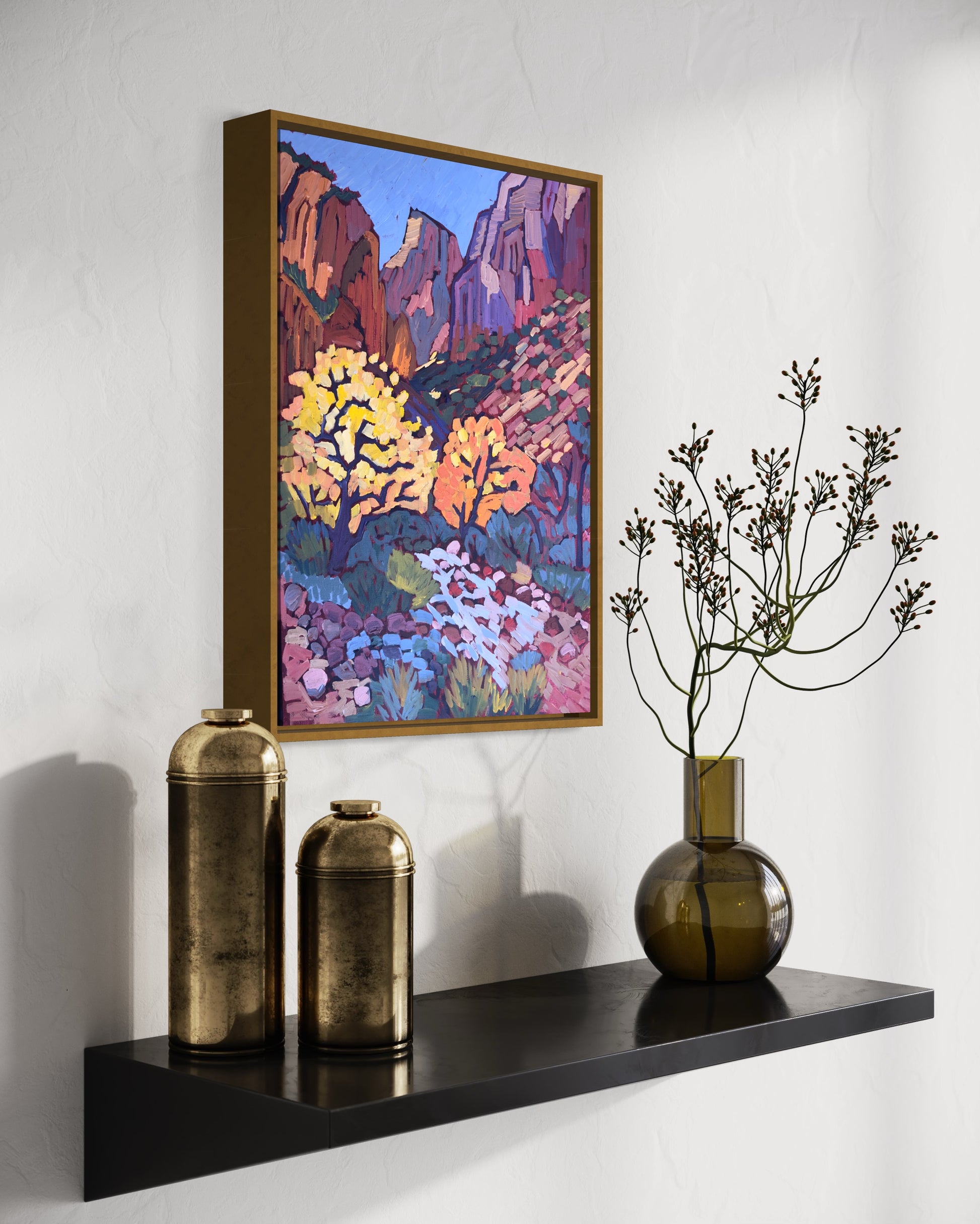 The 2-inch gallery canvas depth adds a remarkable dimension to the artwork, allowing you to immerse yourself in the park's splendor. Whether displayed as a focal point or as part of a collection, this painting beckons you to revel in the timeless magnificence of Zion National Park, a testament to nature's artistry at its finest.