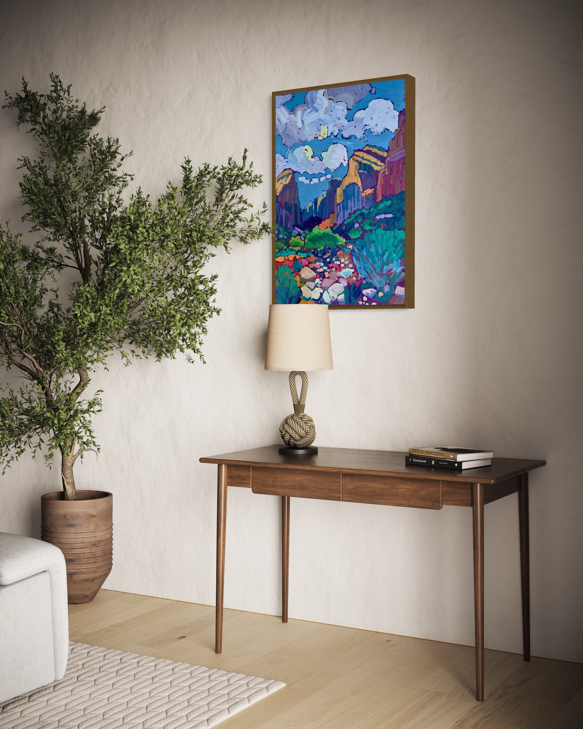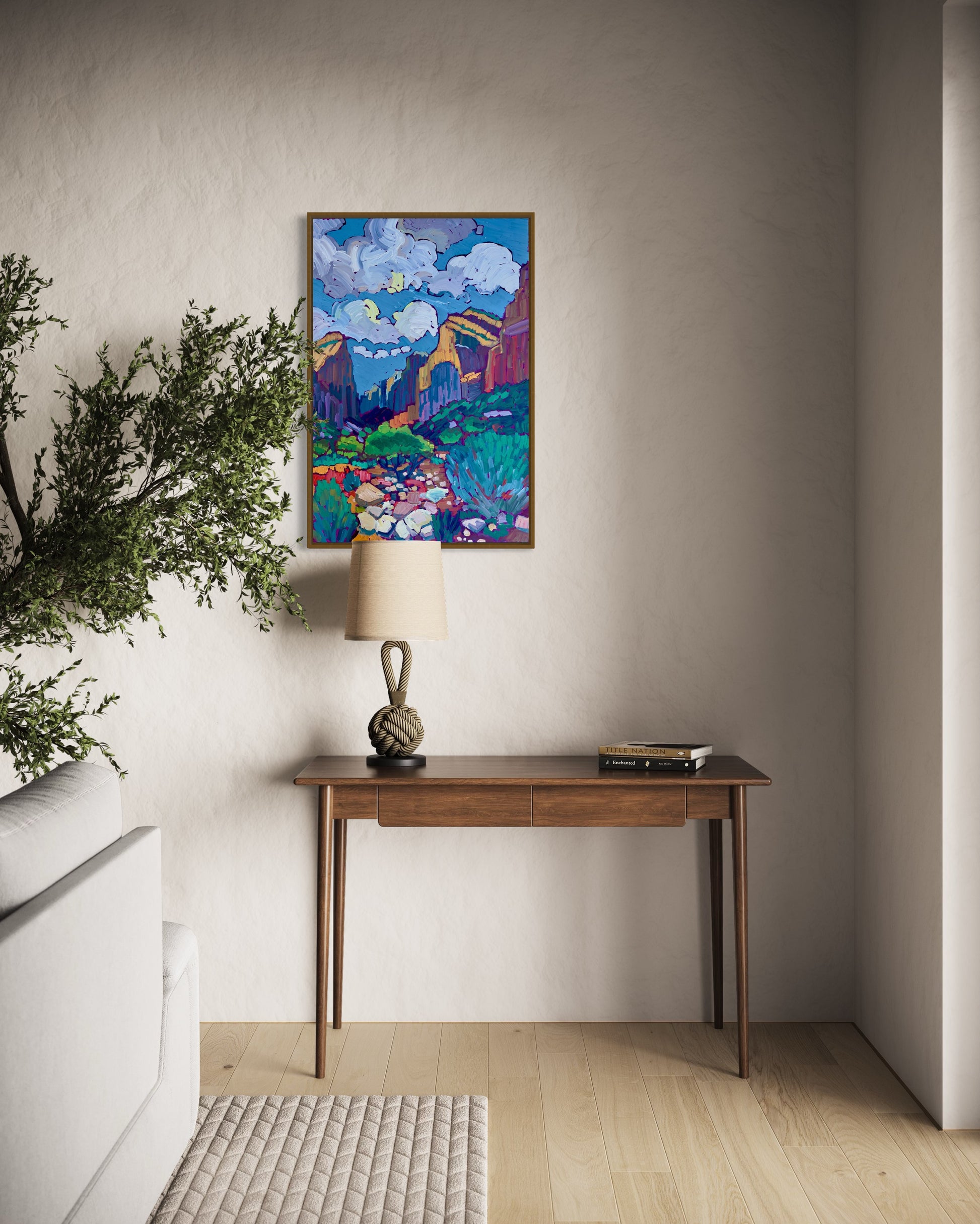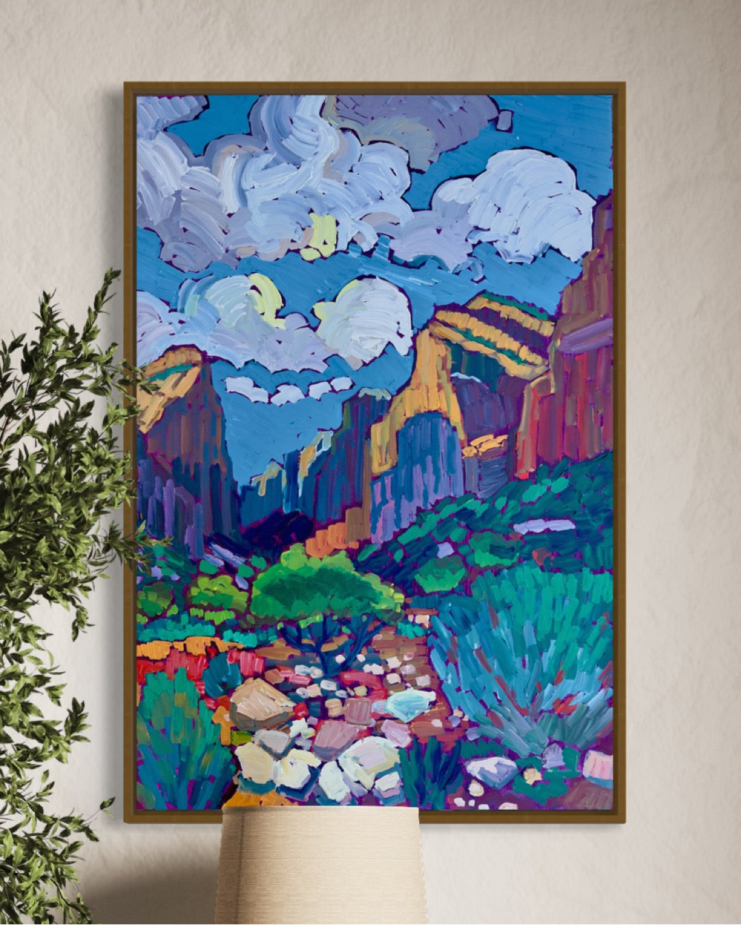 Step into the awe-inspiring realm of 'Zion National Park,' a painting that invites you to discover the captivating landscapes of Angles Landing. In this artwork, the towering sandstone formations, winding canyons, and vivid hues converge to create a scene of unmatched natural beauty. Through textured brushstrokes, I've captured the rugged elegance of the rock formations and the vibrant essence of the park. As you gaze upon 'Zion,' you'll feel the embrace of nature's grandeur, where the harmony of monumental landscapes and the play of light and shadow weave a captivating masterpiece that pays homage to the timeless allure of Zion National Park.