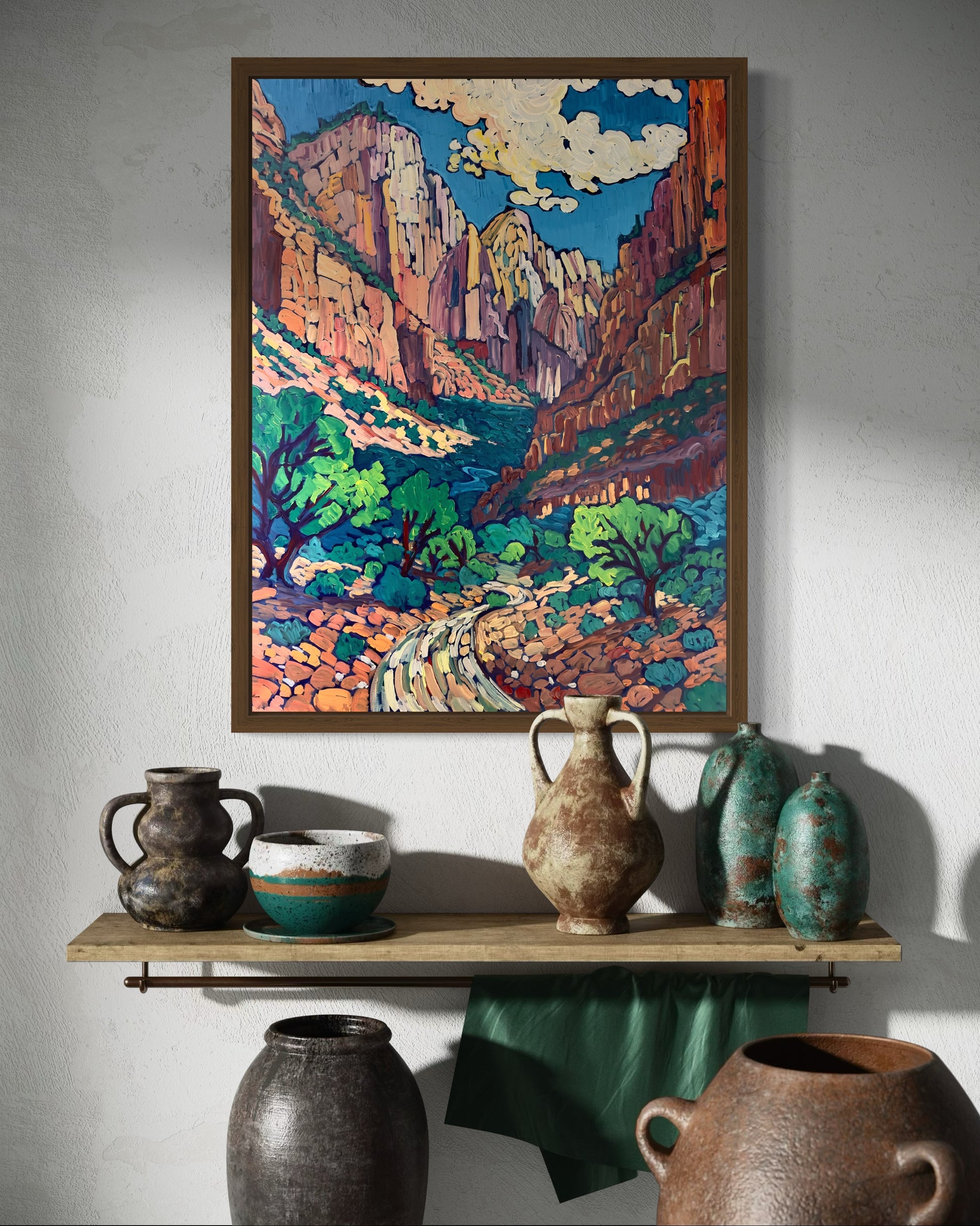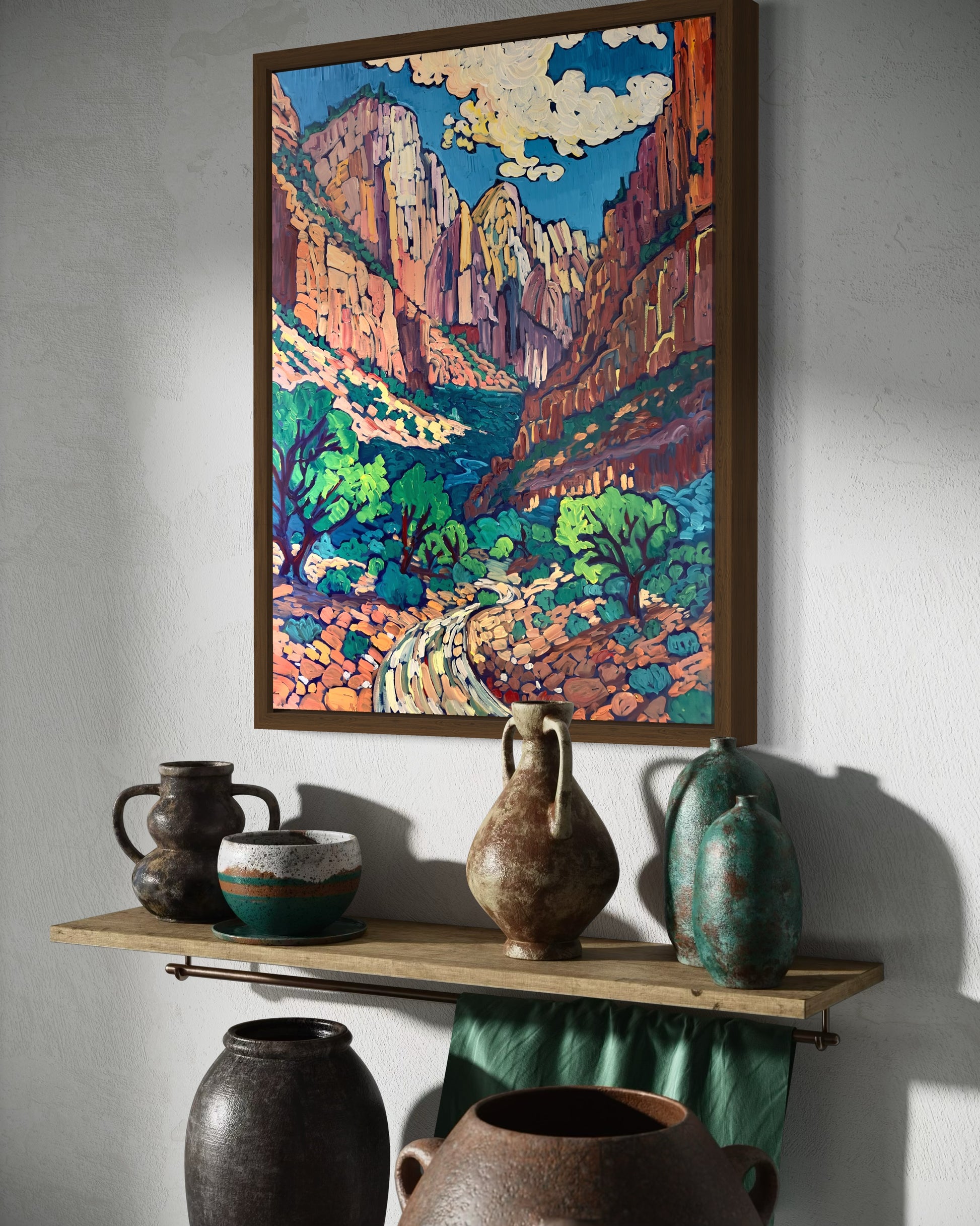 The intricate textures highlight the park’s majestic canyon walls and sweeping vistas, while the interplay of light and shadow adds depth and movement to the scene. This painting evokes the powerful and timeless beauty of Zion, inviting viewers to immerse themselves in its serene, natural wonder.
