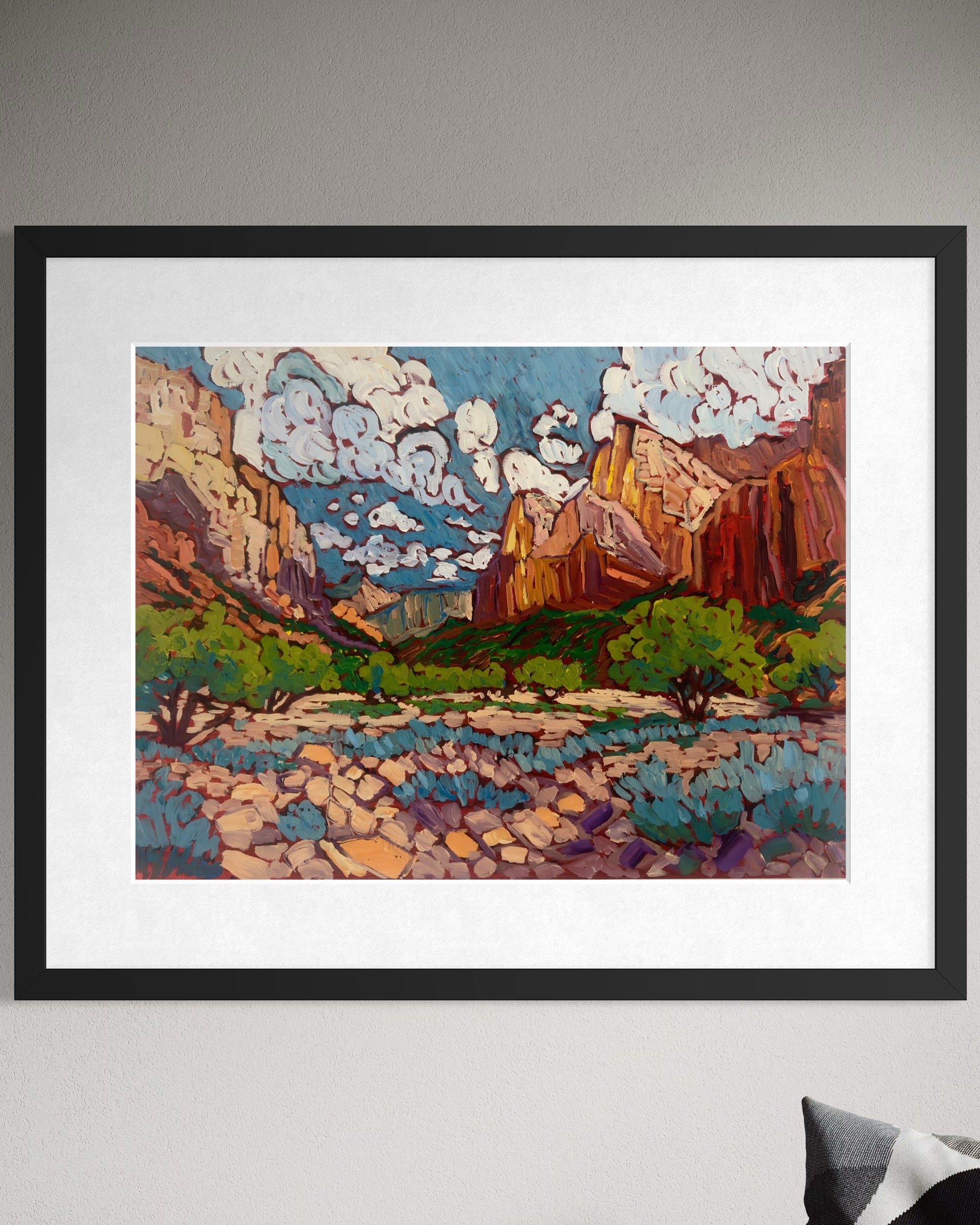 This 18”x24” acrylic painting on canvas board captures the sacred stillness and towering majesty of Zion National Park. Sandstone cliffs rise like cathedrals from the desert floor, their crimson faces illuminated by the fading warmth of the setting sun. Below, a silver thread of river winds through the canyon, carving eternity into stone.